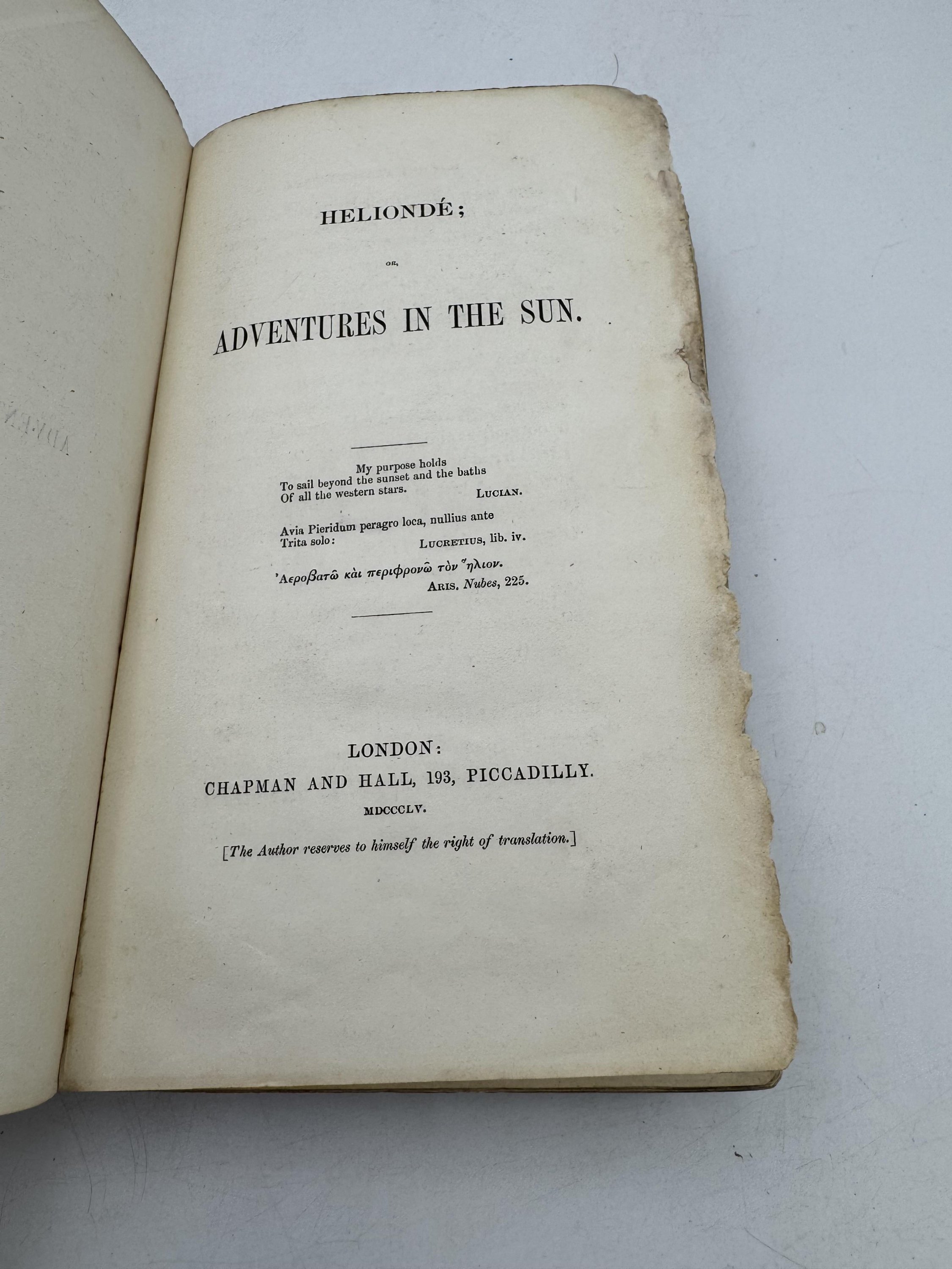 Fair reading copy 1st ed Chapman and Hall hardback, with 6 pages of ads for author's Memoirs of the Stomach to rear. Very worn, but hard to find first edition - binding has separated at the spine, a little looseness to one section centrally. Illustrated. Edge of fly-leaf removed, pencil marks to title on next page, boards are heavily rubbed and worn.