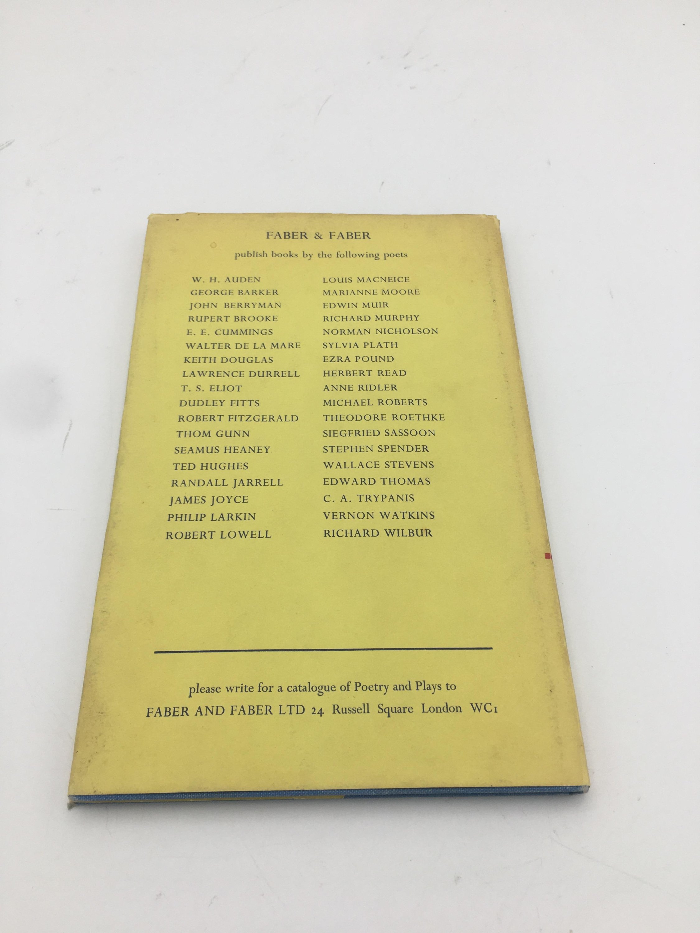 ~~Signed by Ted Hughes to fly-leaf without dedication~~VG/Good+ 4th print 1967 Faber hardback, unclipped dust-jacket with price of 18s. Some surface stains to front panel of DJ, at top left and lower left with a related lighter stain mark just above the author's surname. Minor splash stains to lower outer edge of page block. Almost 1cm tear, internally repaired to top front left of DJ, bright cloth boards, internally VG tight and unmarked.