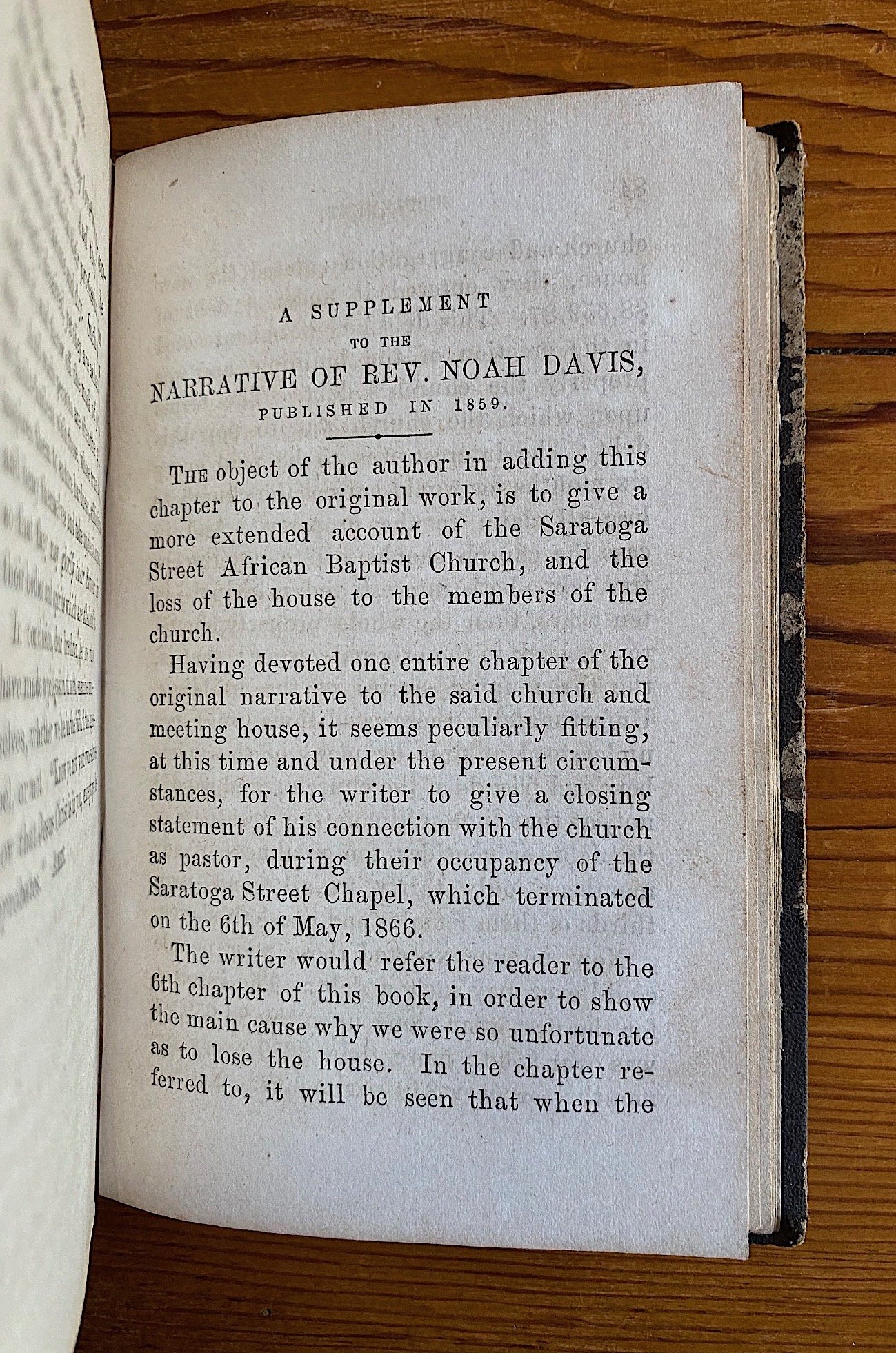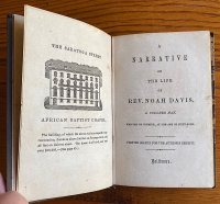 Originally published 1859 in Baltimore, this scarce "New Edition, with a Supplementary Chapter beginning on page 83, showing how the members of the Saratoga Street African Baptist Church were deprived of their Chapel Building" is dated July 26, 1866. 12mo. 100 pp. Engraved portrait frontispiece of Rev. Davis different than the earlier 1859 edition and an additional plate of The Saratoga Street African Baptist Chapel. Brown cloth lettered in gilt. Sabin 18870.