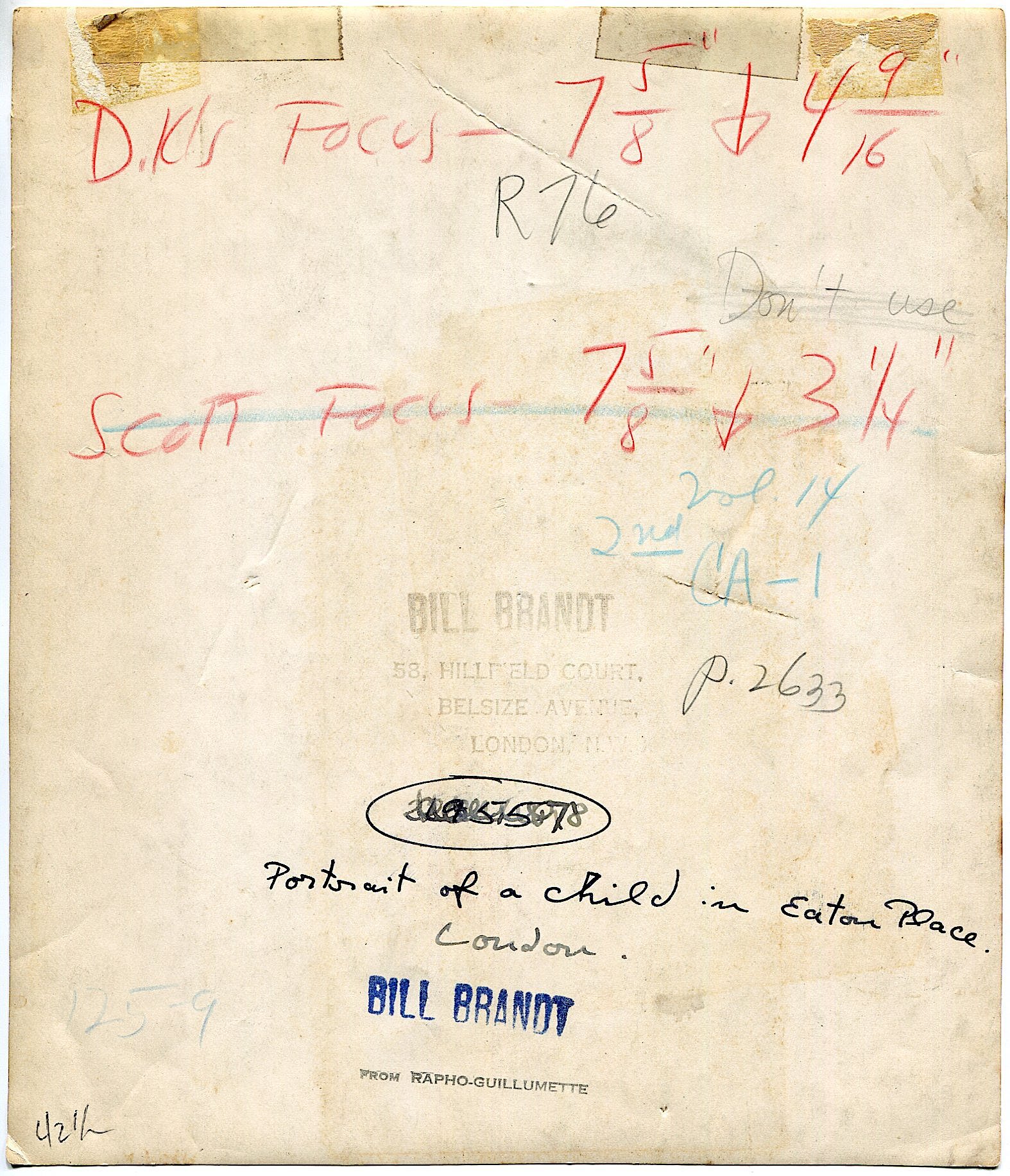 Original gelatin silver print photo titled on reverse, "Portrait of a child in Eaton Place, London" by photographer Bill Brandt out of London, England. Better known as "Portrait of a Young Girl, Eaton Place, London", Brandt took this photo of his 10 year old niece Judith in an apartment at Eaton Place, London in 1955. Handwritten title on reverse is in Brandt's hand (comparison example provided in photos). Also see britishartstudies.ac.uk/issues/16/_assets/downloads/publication-brandt.pdf. Two separate photographer stamps on the reverse. One with his "58, Hillfield Court, Belsize" address in London and the second with simply his name. An additional stamp on the reverse titled, "From Rapho-Guillumette", the New York City photo agency. Printed on single-weight glossy fiber paper. Based on the Rapho-Guillumette stamp and the various handwritten notes and dimension edits on the reverse, this image was likely submitted by Brandt for publication either in a magazine that Brandt worked with (Harper's Bazaar, Picture Post, Vogue), or for publication in one of Brandt's books. It appeared in Bill Brandt - Shadow of Light. A Collection of Photographs from 1931 to 1966. Viking, 1966, p.76. One of Brandt's most iconic photos, the image has been featured in multiple significant exhibitions globally, including "History of Photography from Chicago Collection" (1982) at the Art Institute of Chicago as well as "Bill Brandt: Shadow and Light" (2013) at the Museum of Modern Art in New York.