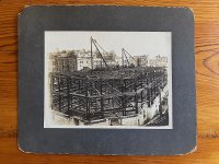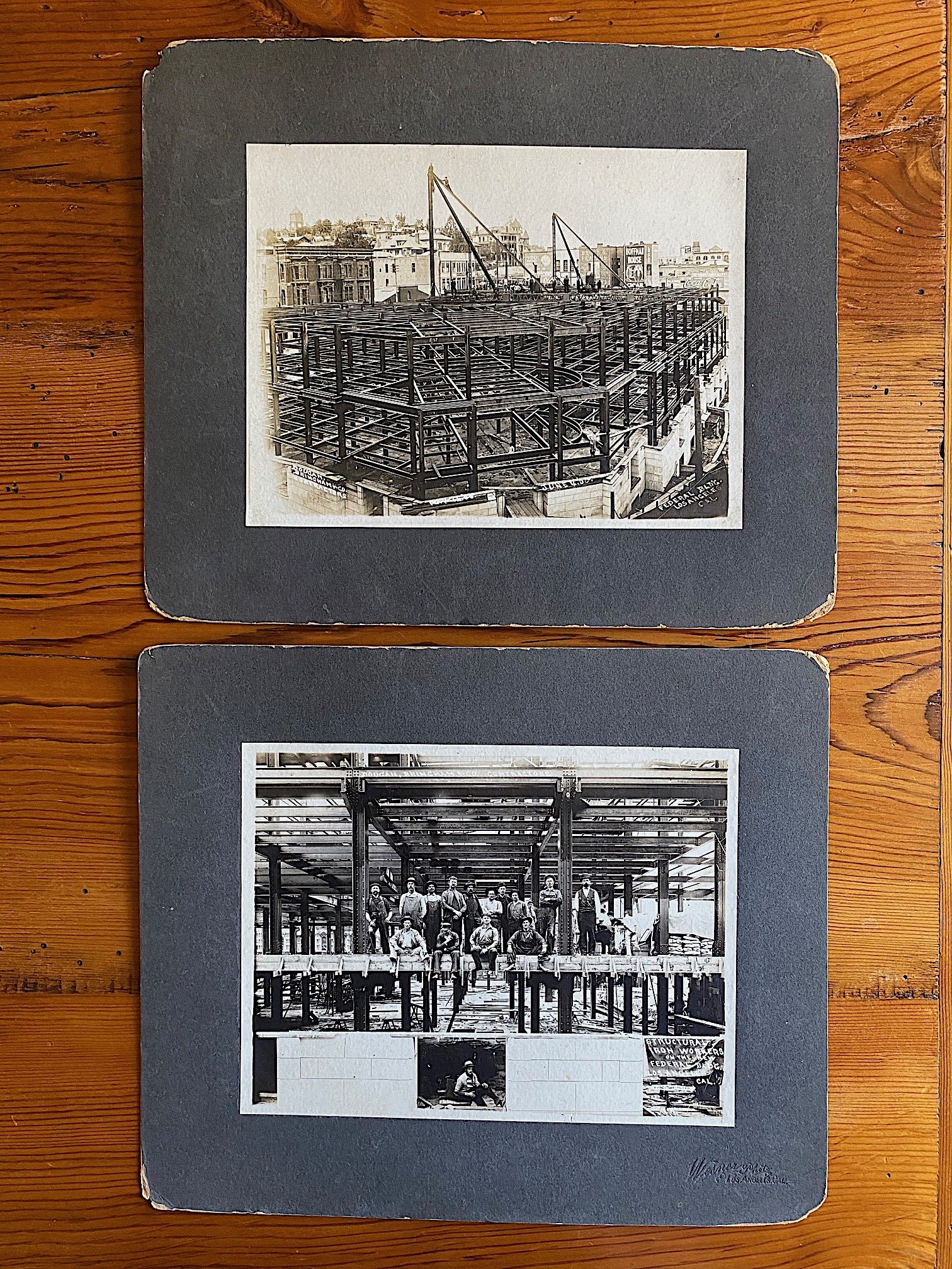 1906 set of 2 cabinet photos showing the construction of the Old Federal Building and Post Office at Temple Street and Main Street in Los Angeles, California. Writing in the negative of the first photo reads, "Dougan, Bringham & Co. Contractors", "June 4, '06", and "Federal Bldg. Los Angeles, Cal." The second photo reads, "Structural Iron Workers On The New Federal Bldg. Los Angeles, Cal." Photographer is M. (Michael) A. Wesner out of Los Angeles.