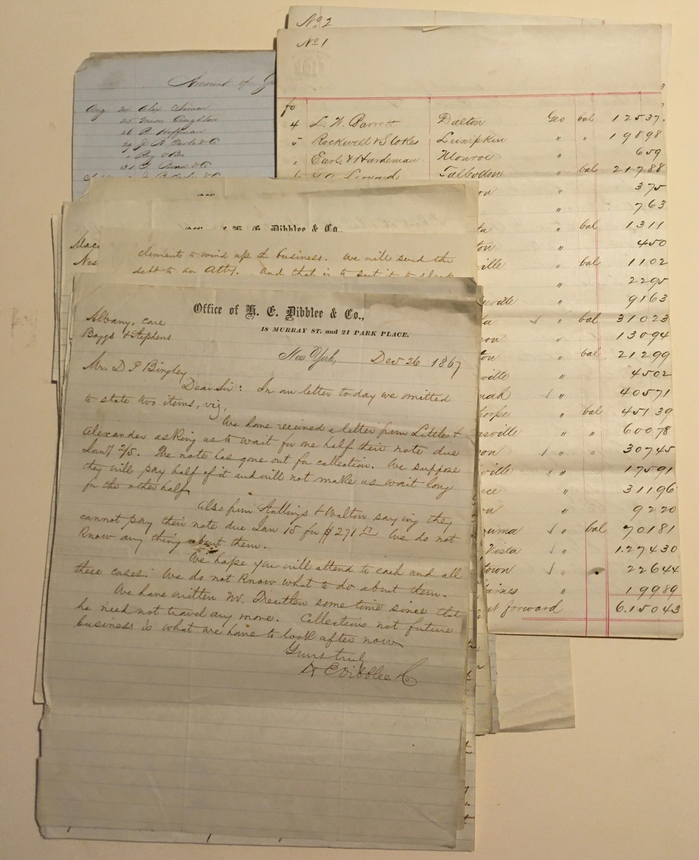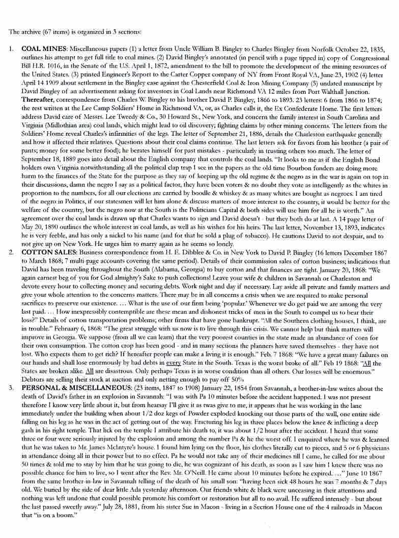 Archive of the Bingley brothers of Charleston SC & the problems of post Civil War commerce: coal and cotton. 67 items, mostly late 1860s, but embracing 1835 to 1909. All the letters and documents are directed at David P. Bingley and about a third are from his brother Charles Bingley. David P. Bingley (1824-1909) was born in Charleston SC. With his first wife, he had a son Nathaniel, and with his second wife Mary L. Caroline Waver a daughter Marion and a son Henry Edward (1859-1910). His father, David P. Bingley Sr., was given the responsibility of enslaved Negroes in the estate of Edward Bingley who died in 1818. David formed a cotton commission sales partnership with John J. Krauss and Henry E. Dibblee (in a New York City Directory of 1866 they are listed at 18 Murray and at 21 Park Place). They went bankrupt in 1875. David’s brother Charles stayed in the South, Charleston and then Richmond VA, and operated a shipping company. In 1846, he arranged for a French-built vessel to be registered in the US. While trying to regularize the family’s stake in coal mines, he blames his own poor judgment but also the politicians taking advantage of the Negro vote. David, buying Southern cotton and selling on commission has an increasingly difficult time collecting accounts in a collapsing economy post Civil War. The archive is organized in 3 sections: pertaining to coal mines in the South; documenting cotton sales; and personal (see list).