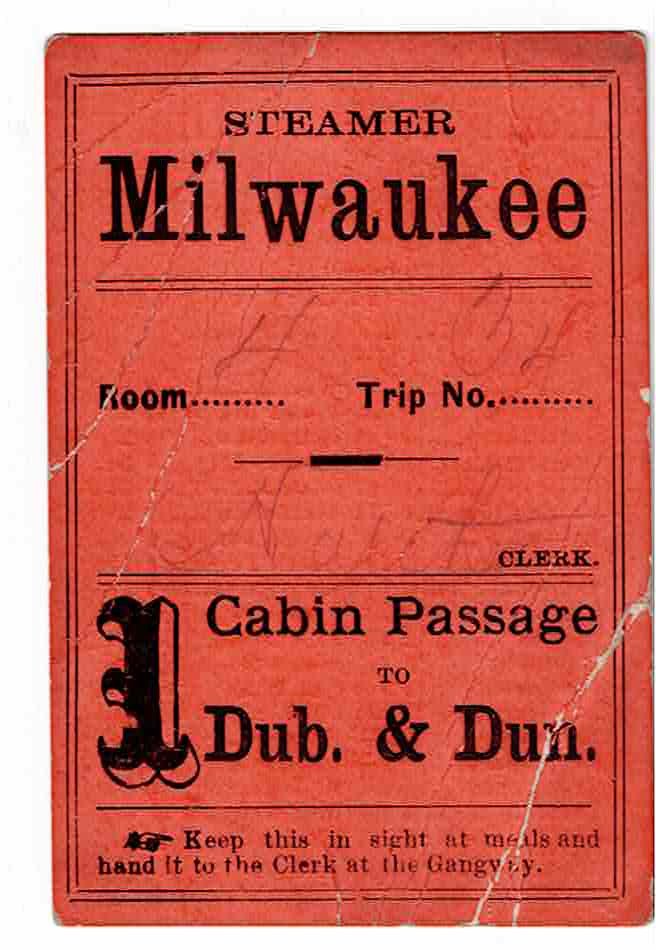 1870 ticket 2”x3” for cabin passage (room 4) on the Steamer Milwaukee, trip number 34 from “Dub. & Dun.” (Dubuque and Dunleith) - “Keep this in sight at meals and hand it to the Clerk at the Gangway.” The North Western Union Packet Co. ran this steamer from Dubuque to St. Paul MN beginning in 1860, and added Dunleith as a mail landing in 1861. According to Way’s Packet Directory, the steamer was off the lists in 1870. Printed by Palmer, Winall & Co., Dubuque. W.A. Palmer, born 1836, moved to Dubuque in 1860, the printing firm reorganized as Palmer, Winall & Co. in 1864. [corner crease]