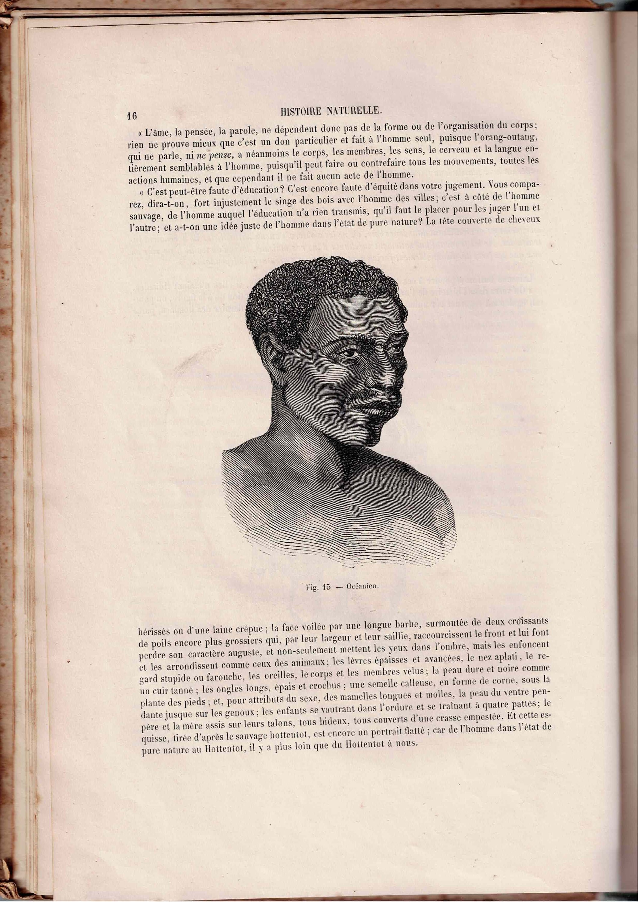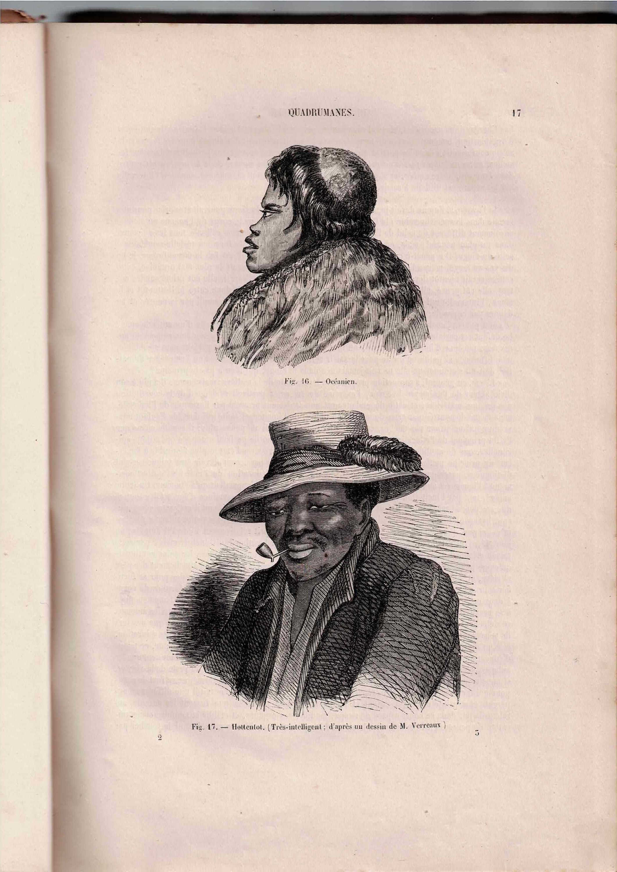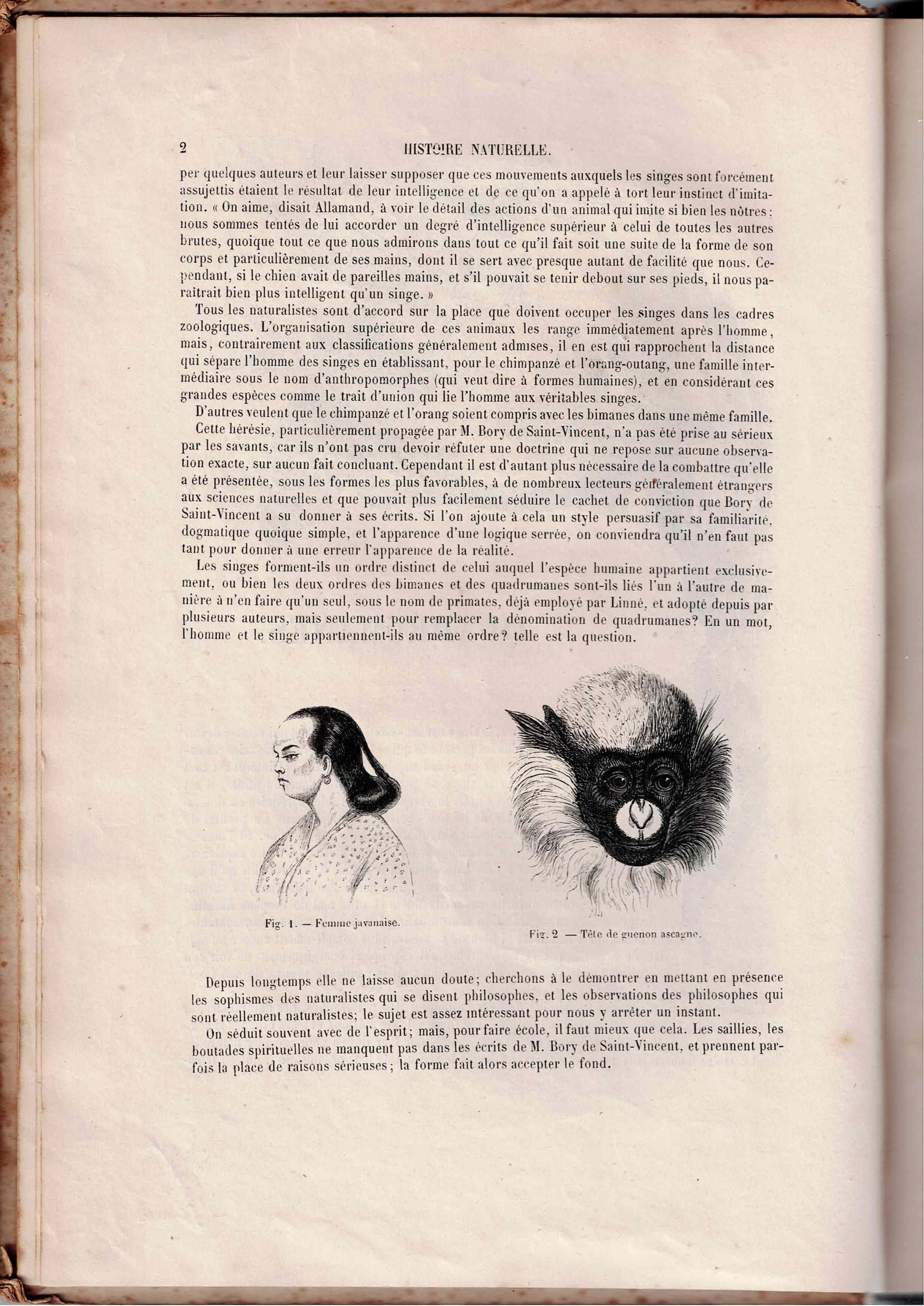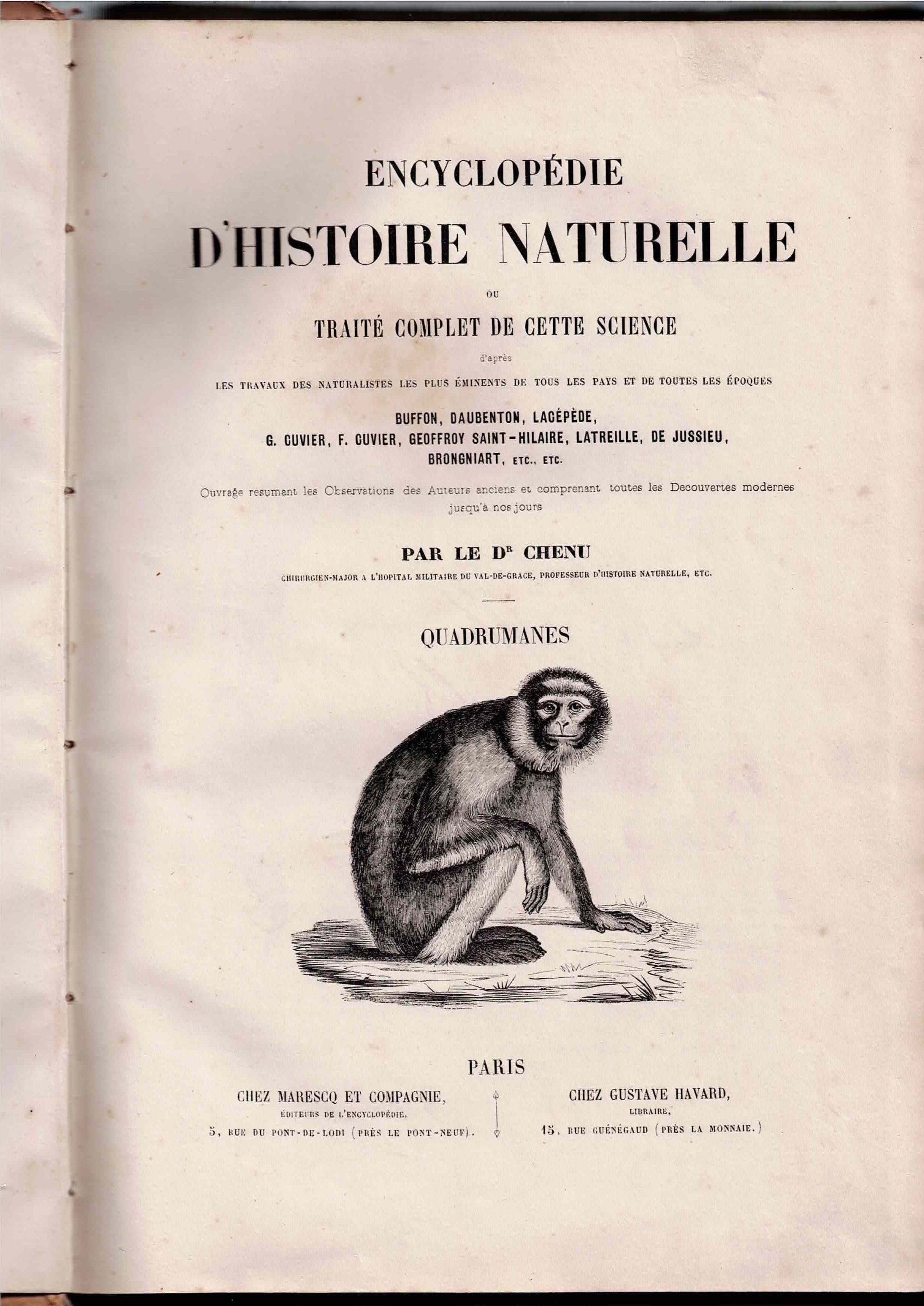 1851 Encyclopédie d’Histoire Naturelle … Quadrumanes, Le Dr. Chenu [Jean-Charles Chenu]. 31 volumes of the encyclopedia were published from 1851 to 1861. This volume on primates is particularly interesting, given that it predates Darwin’s Origin of Species, and declares how close humans are to apes. 512 pages + title page + errata. Binding soiled as shown.