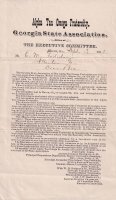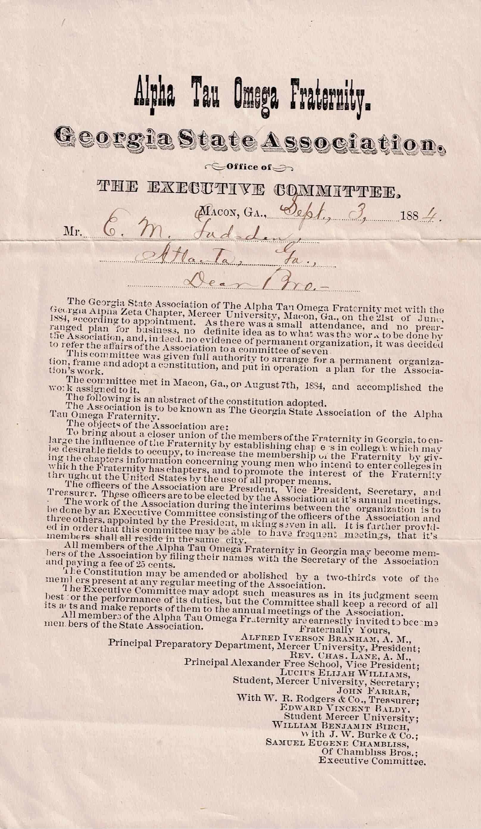 1884 printed inquiry from the Alpha Tau Omega Fraternity. Georgia State Association in Macon GA, filled out September 3, 1884 and addressed to a “brother” in Atlanta, explaining that they wish a permanent group in Mercer University. Single sheet, folded, 5.5”x9.25”