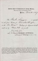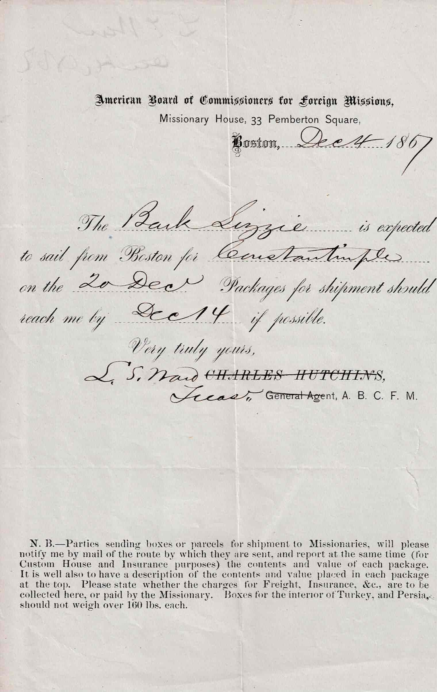 1867 partly printed form of the American Board of Commissioners for Foreign Missions in Boston, instructions for shipping packages on the Bark Lizzie bound for Constantinople, under the care of L. S. Ward, Treasurer. Single sheet, 5”x8.25”