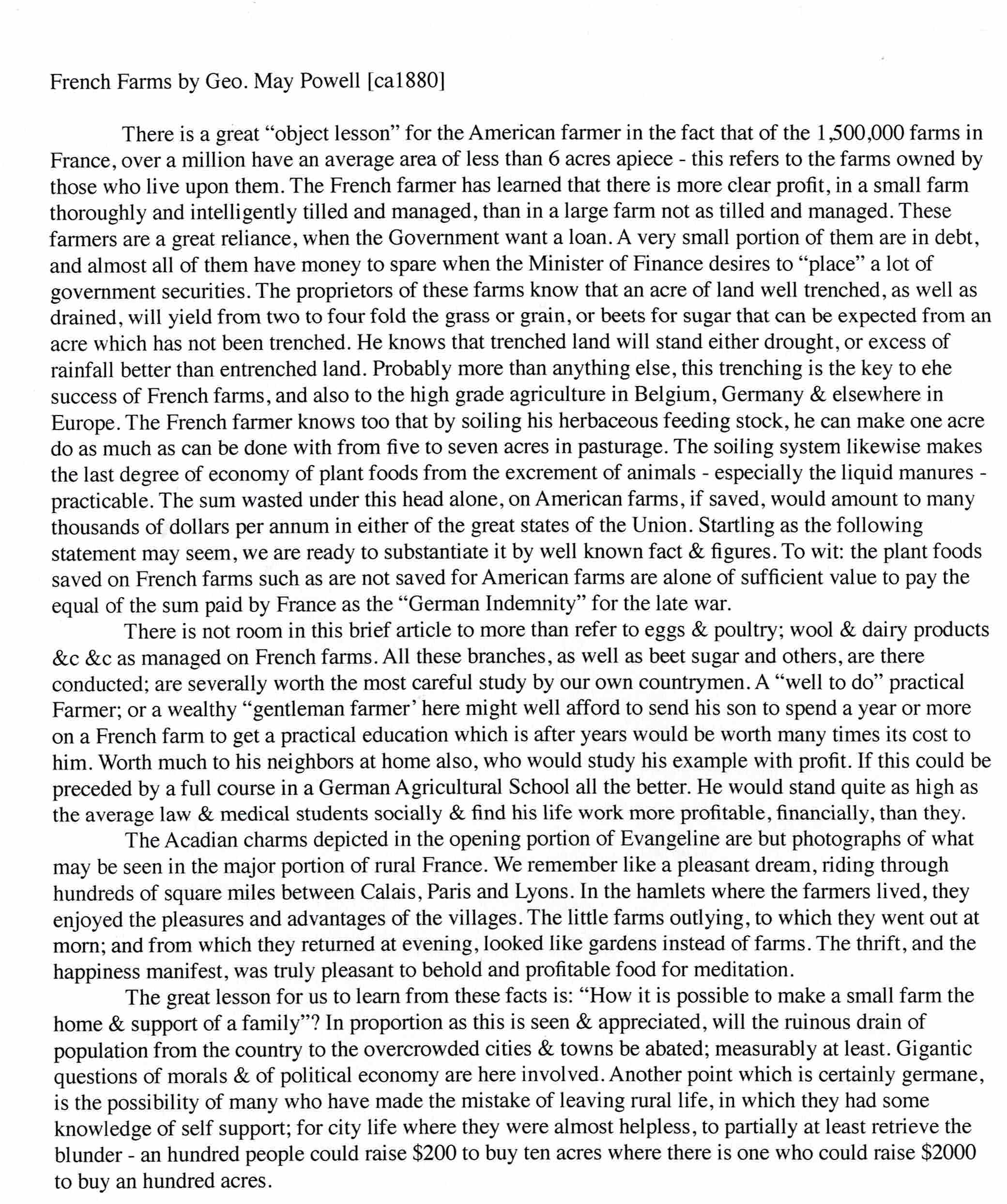 1880 manuscript essay “French Farming” by George May Powell, 3 leaves, 5 pages, 5.5”x8.5” [see transcript] Powell (1835-1905) served as a statistician in the Treasury department during the Civil War. He was an inventor and social reformer - combining social Christianity and capitalist enterprise. [fold separations]