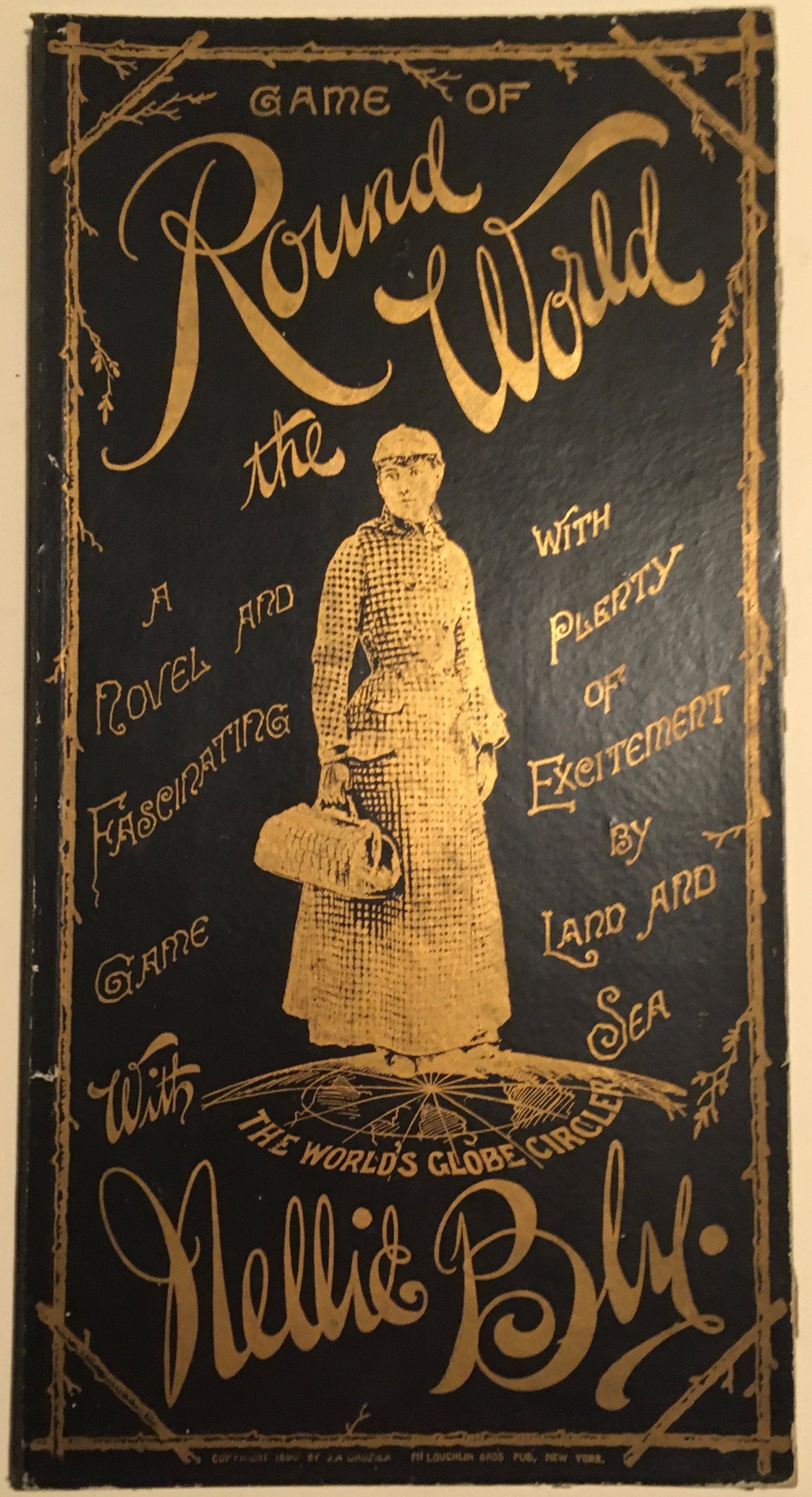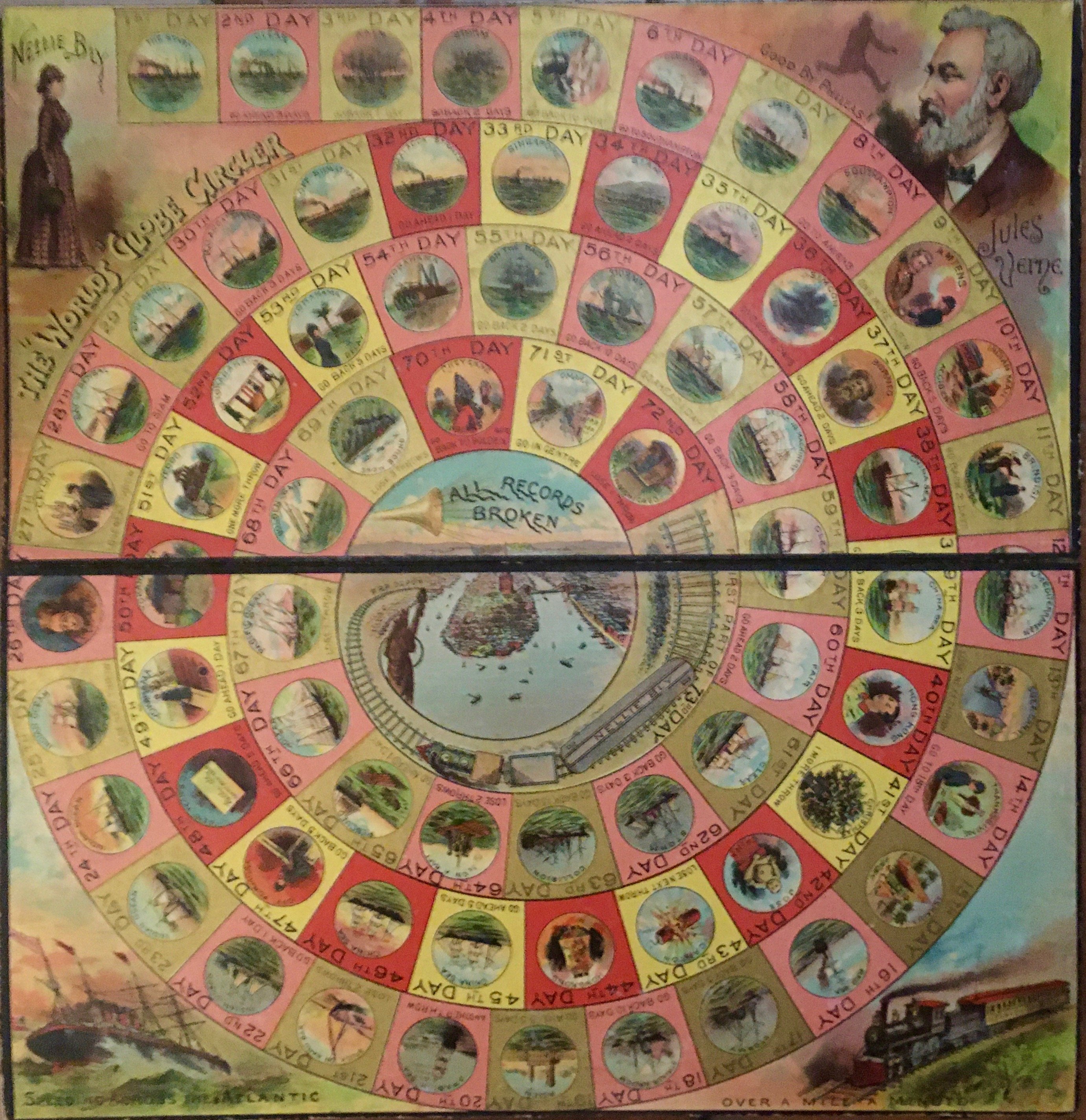 1890 game board for Game of Round the World with Nellie Bly, McLoughlin Brothers. In 1888 American journalist Nellie Bly (Elizabeth Jane Cochran) circumnavigated the globe in 72 days, emulating the achievement of Phileas Fogg, setting a new world record for the feat. This game board, including vignettes of Jules Verne and his Phileas, as well as a steamship and locomotive, tracks Nellie’s progress over her 72 days back to New York “All Records Broken” (though only briefly). 16”x16” folding in half. [[edges bumped, minor scuffs]