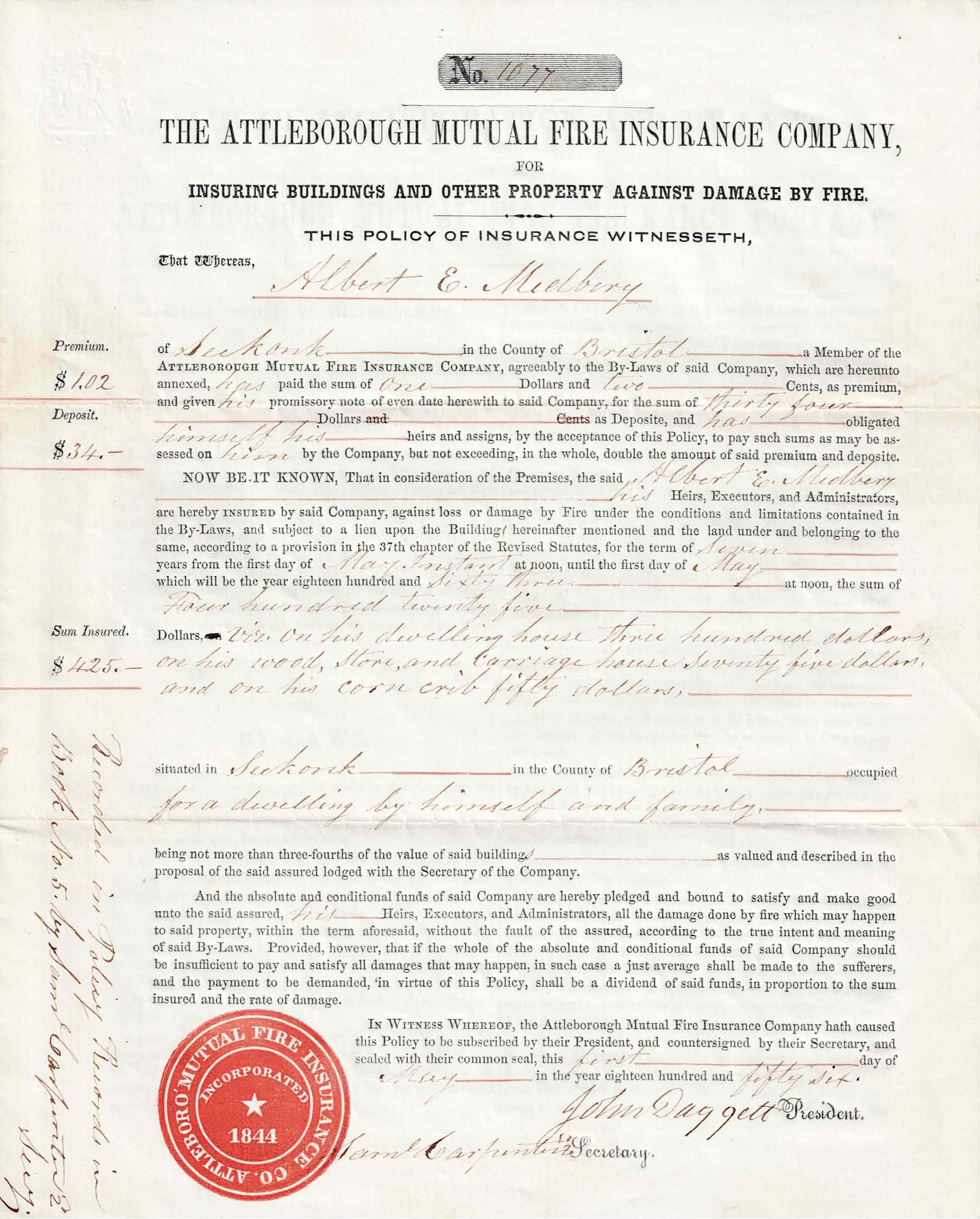 1856 insurance policy from The Attleborough Mutual Fire Insurance Company of Massachusetts, to insure Albert E. Medbury of Seekonk, Bristol County, for a premium, of $1.02 and deposit of $34, $425. for seven years, his dwelling house, wood, store and carriage house, and corn crib. Signed and sealed. Single sheet, letterpress printed 3 sides, folded to 8”x9.75”.