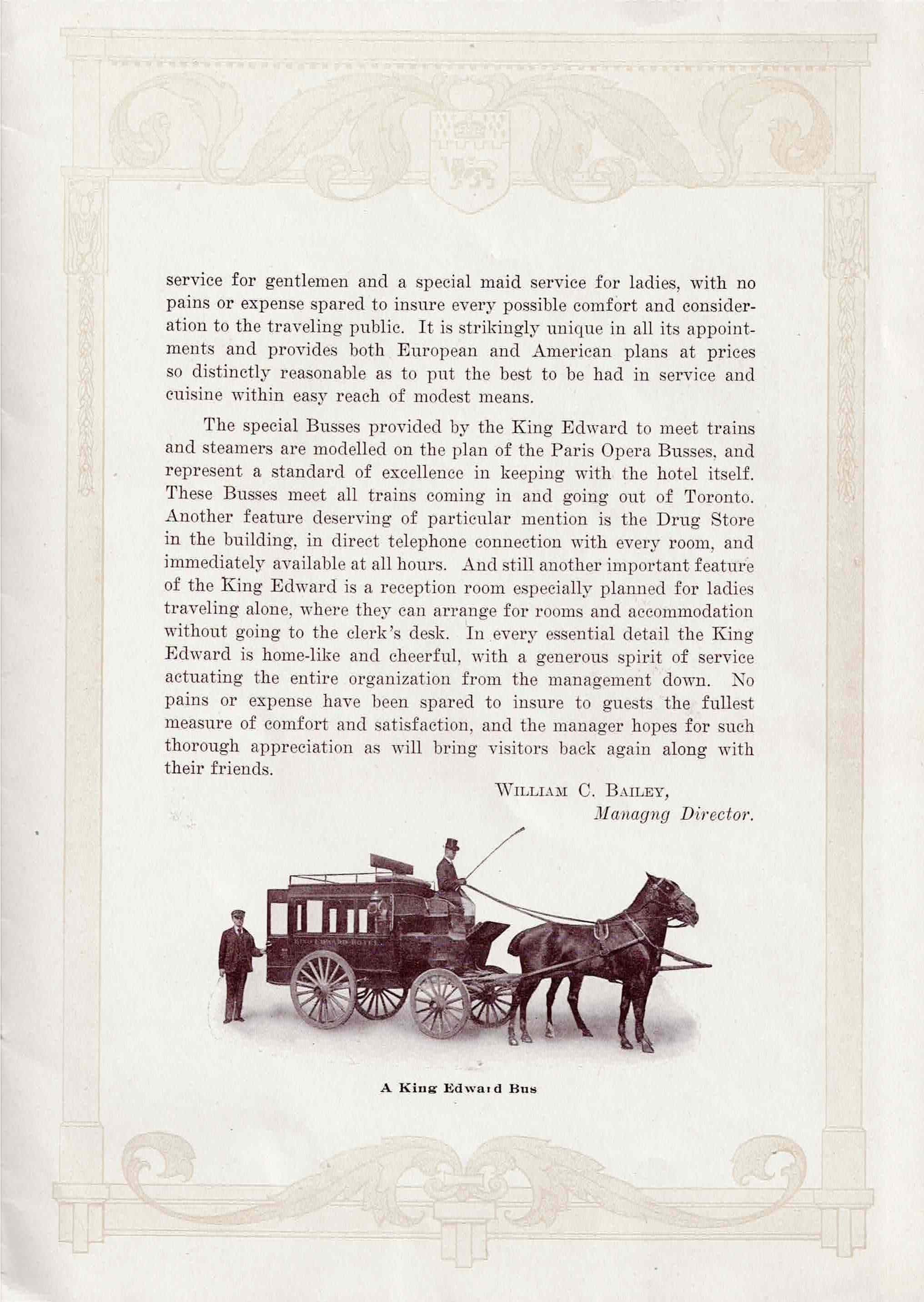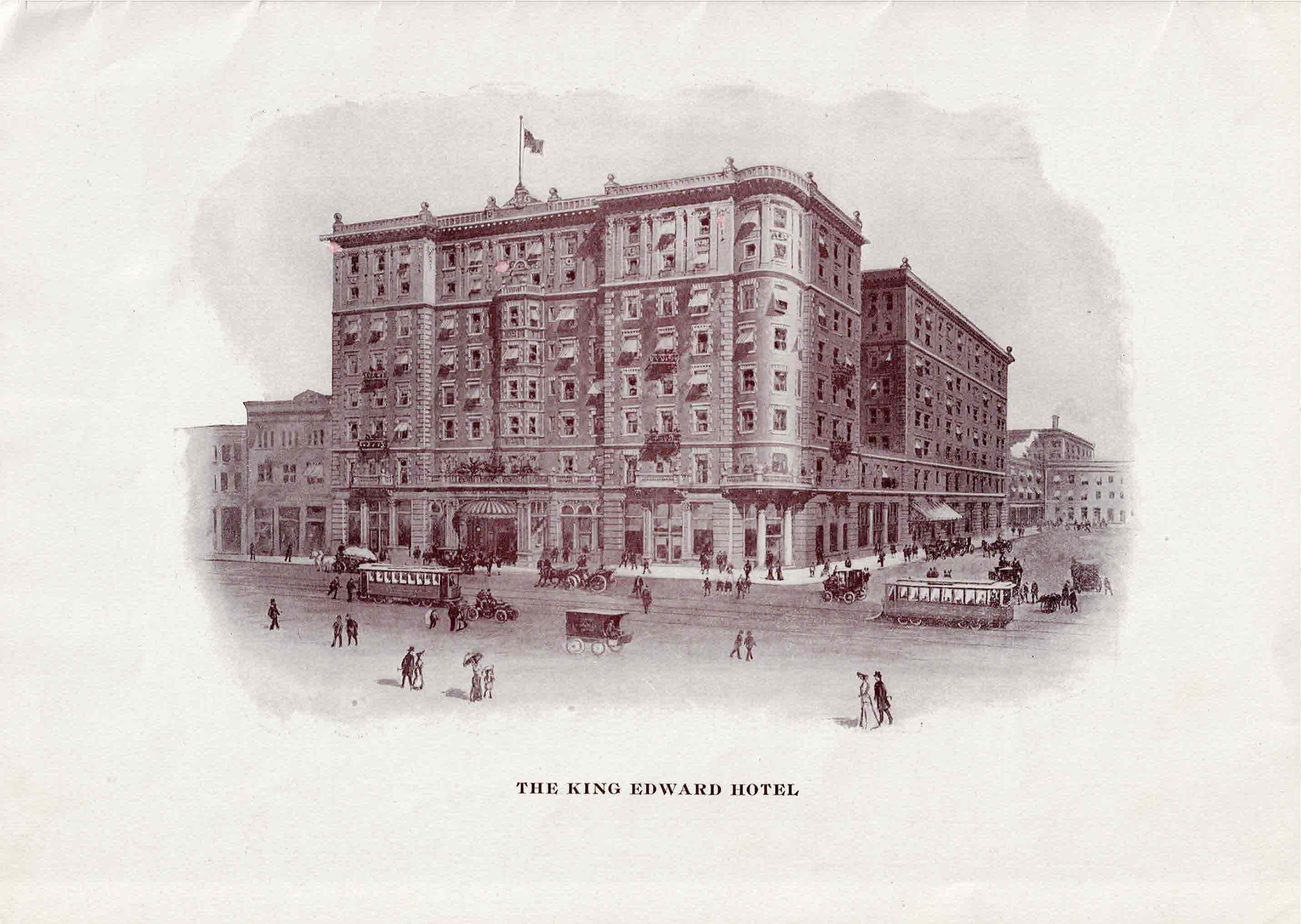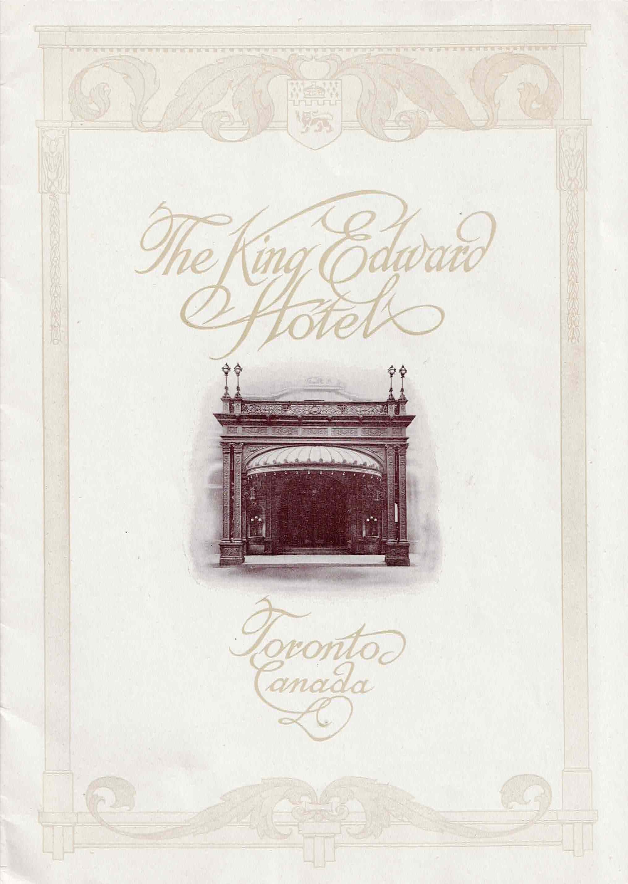 1903 King Edward Hotel “illustrated guest book” 16 pages + wraps, 7”x9.5” printed by Miln-Bingham, Toronto. Each page bordered in green; 12 photogravures of interior and exterior, plus one of a steamboat in Toronto harbor, and one of the Canadian National Exhibition - the hotel benefiting from the proximity to both. The grand building was designed by architect E.J. Lennox for George Gooderham, and King Edward VII granted them the use of his name the year of his coronation (1901) when construction began. The text emphasizes the potential of Toronto to become a world city - with the hotel as a beacon. Special busses met trains and steamers, modeled on the plan of the Paris Opera Busses. Two pages, at front and back, declare “The Only Fire-proof Hotel in Toronto.” The historic building has been restored to this elegance.