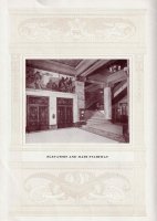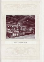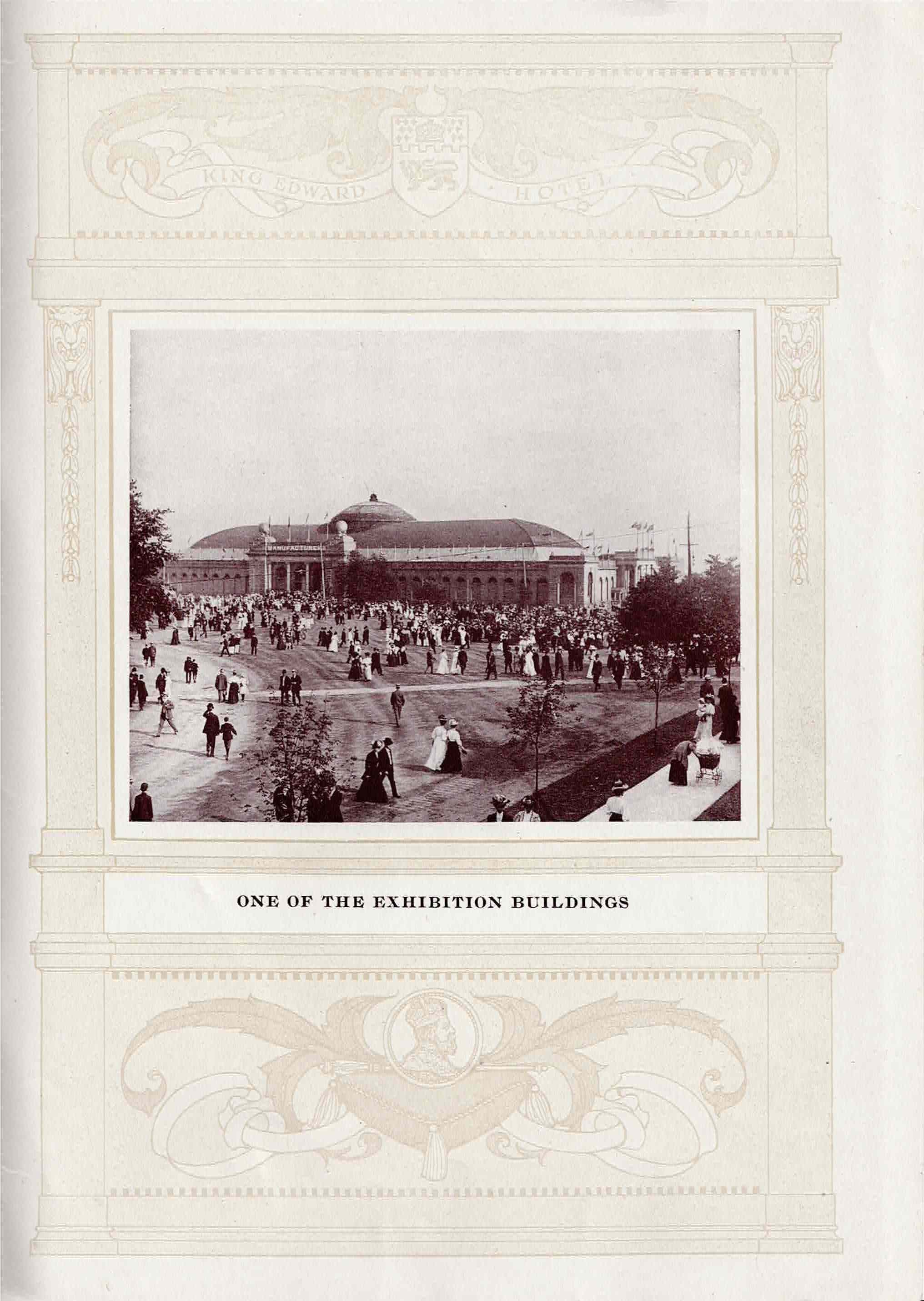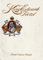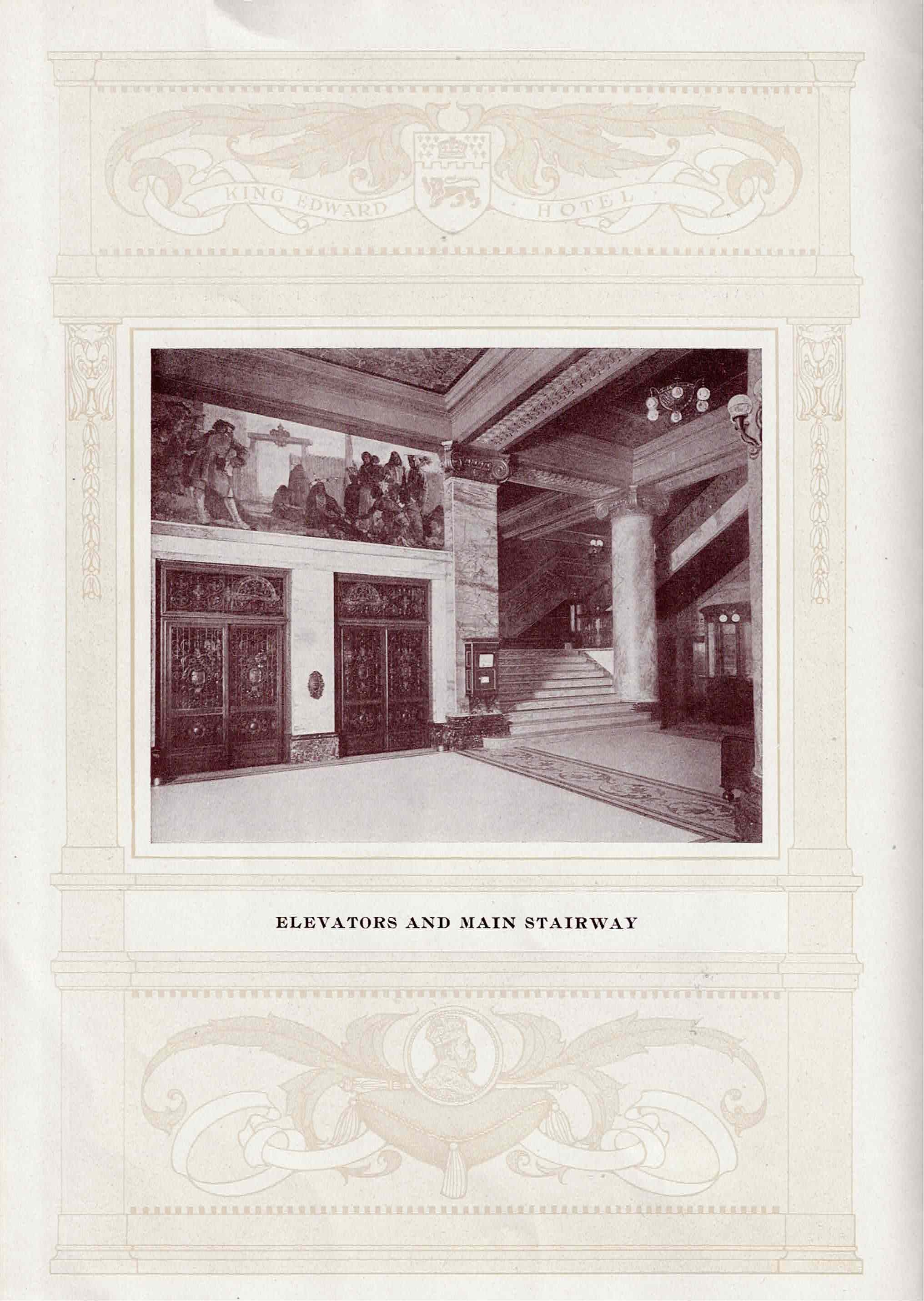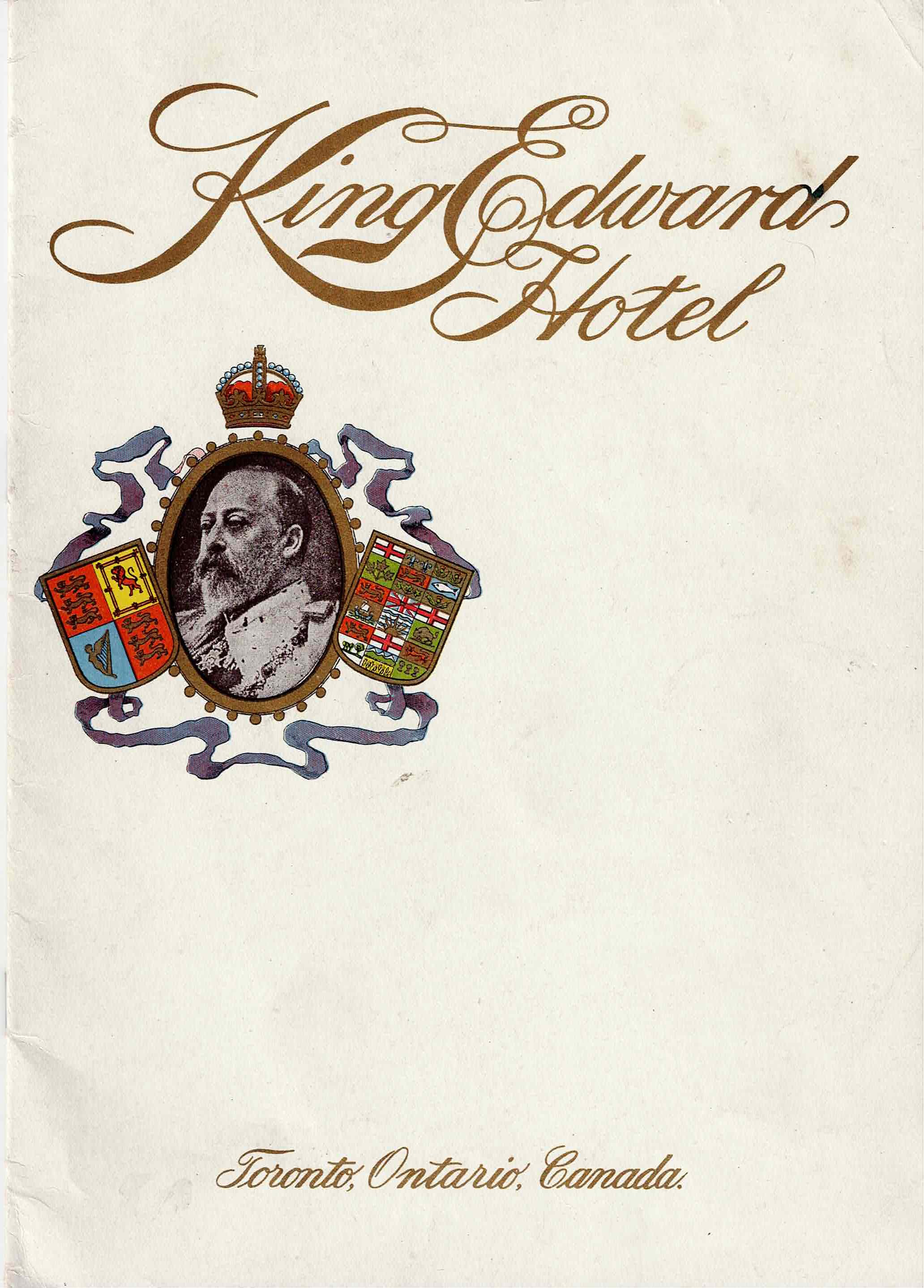 1903 King Edward Hotel “illustrated guest book” 16 pages + wraps, 7”x9.5” printed by Miln-Bingham, Toronto. Each page bordered in green; 12 photogravures of interior and exterior, plus one of a steamboat in Toronto harbor, and one of the Canadian National Exhibition - the hotel benefiting from the proximity to both. The grand building was designed by architect E.J. Lennox for George Gooderham, and King Edward VII granted them the use of his name the year of his coronation (1901) when construction began. The text emphasizes the potential of Toronto to become a world city - with the hotel as a beacon. Special busses met trains and steamers, modeled on the plan of the Paris Opera Busses. Two pages, at front and back, declare “The Only Fire-proof Hotel in Toronto.” The historic building has been restored to this elegance.