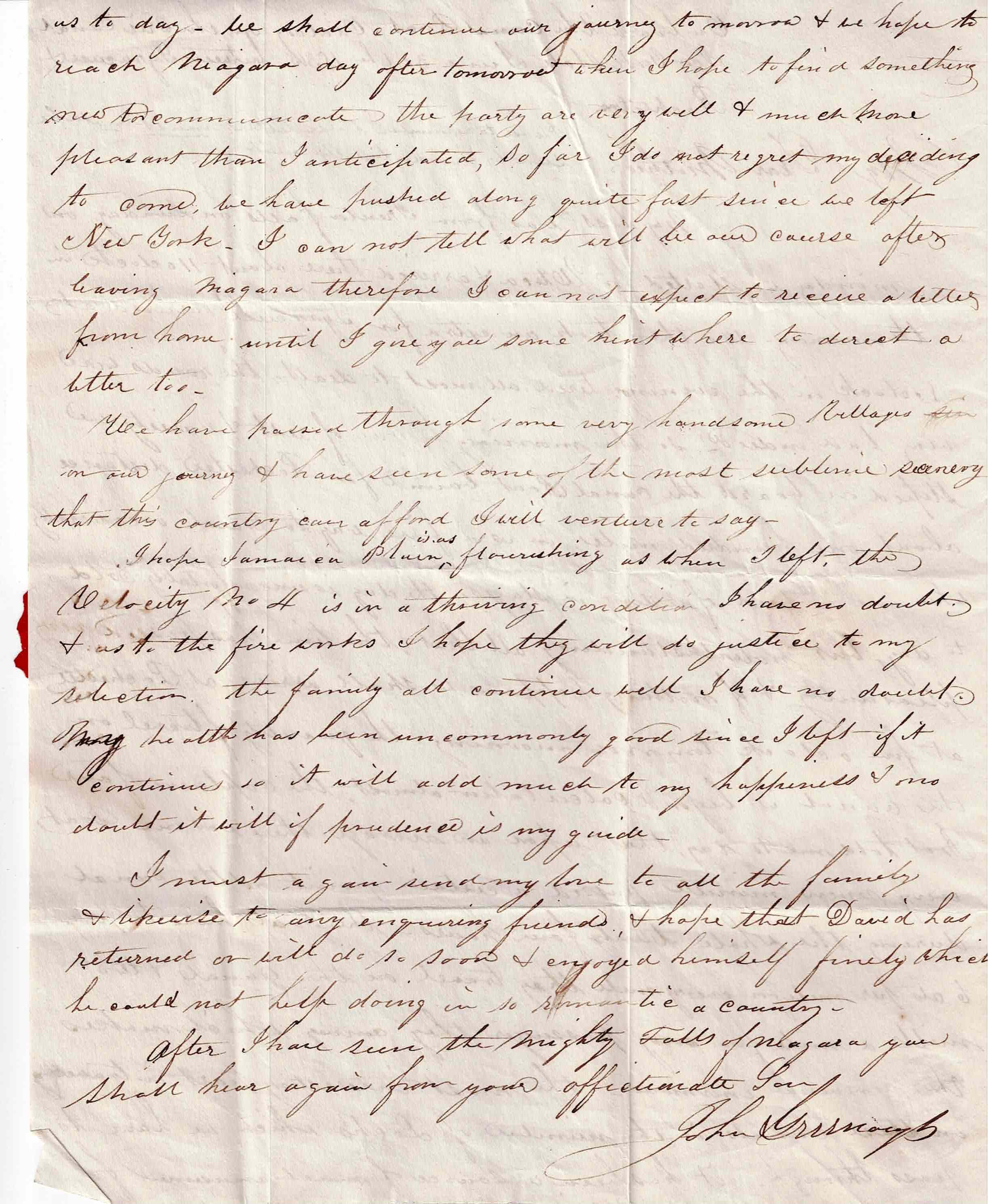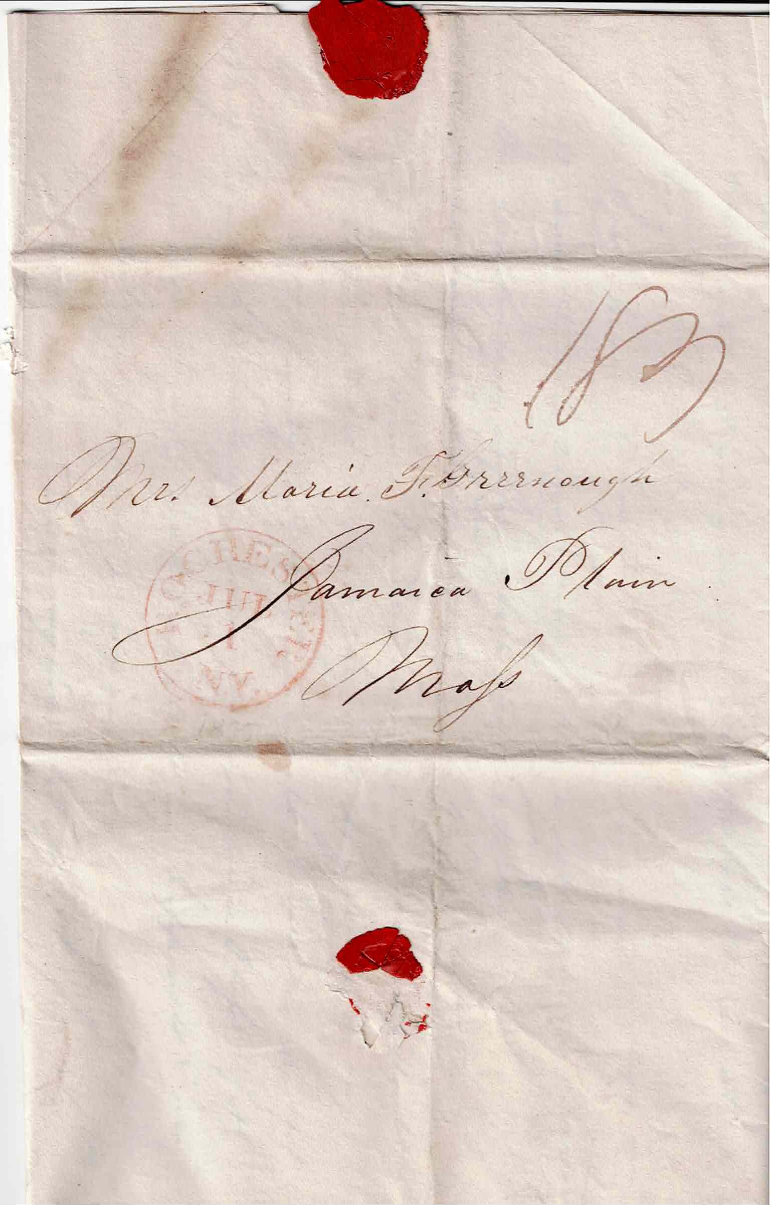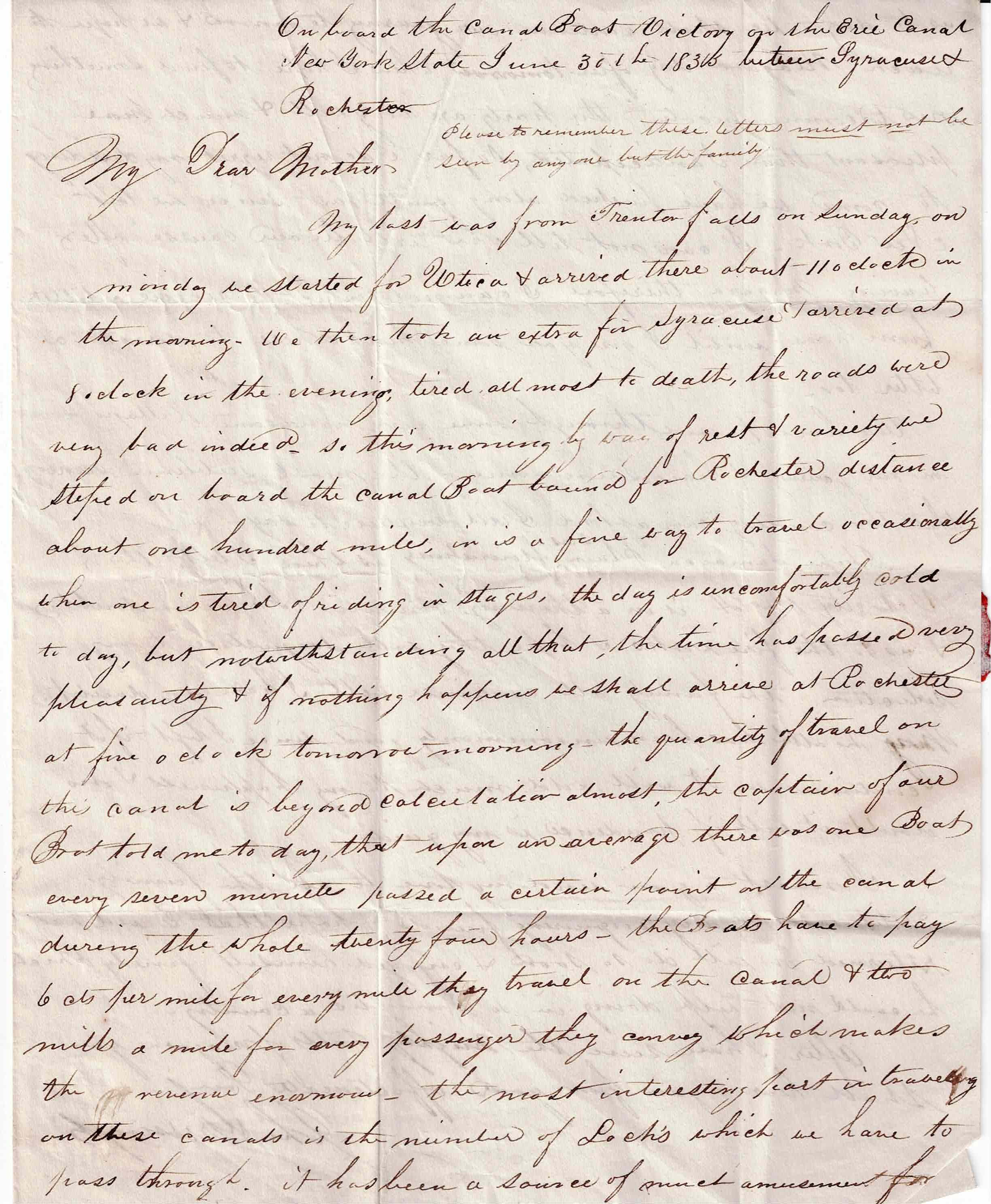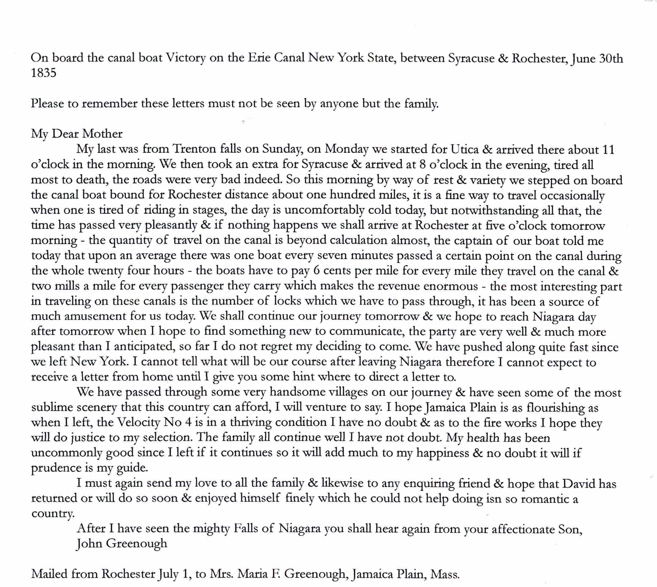 "On board the Canal Boat Victory on the Erie Canal New York state June 30th 1835 between Syracuse & Rochester" 2 page letter mailed from Rochester NY to Mrs. Maria F. Greenough, Jamaica Plain, Mass, 18 3/4 cents postage. "Please to remember these letters must not be seen by anyone but the family." The writer, John Greenough (died 1846) had taken a stage coach to Utica and then an "extra" coach to Syracuse which was exhausting, so he and his companions opted for the ease of a canal boat. Details of the activity on the canal, the economics of the boat, and the locks, and the village they passed. They are headed to Niagara Falls. John's father was David Stoddard Greenough (1787-1830), his widowed mother, Maria Foster Doane Greenough (1793-1843), lived in Jamaica Plain until her death. His older brother, David Stoddard Greenough (1814-1877) mentioned in the letter, had just graduated from Harvard.