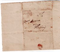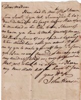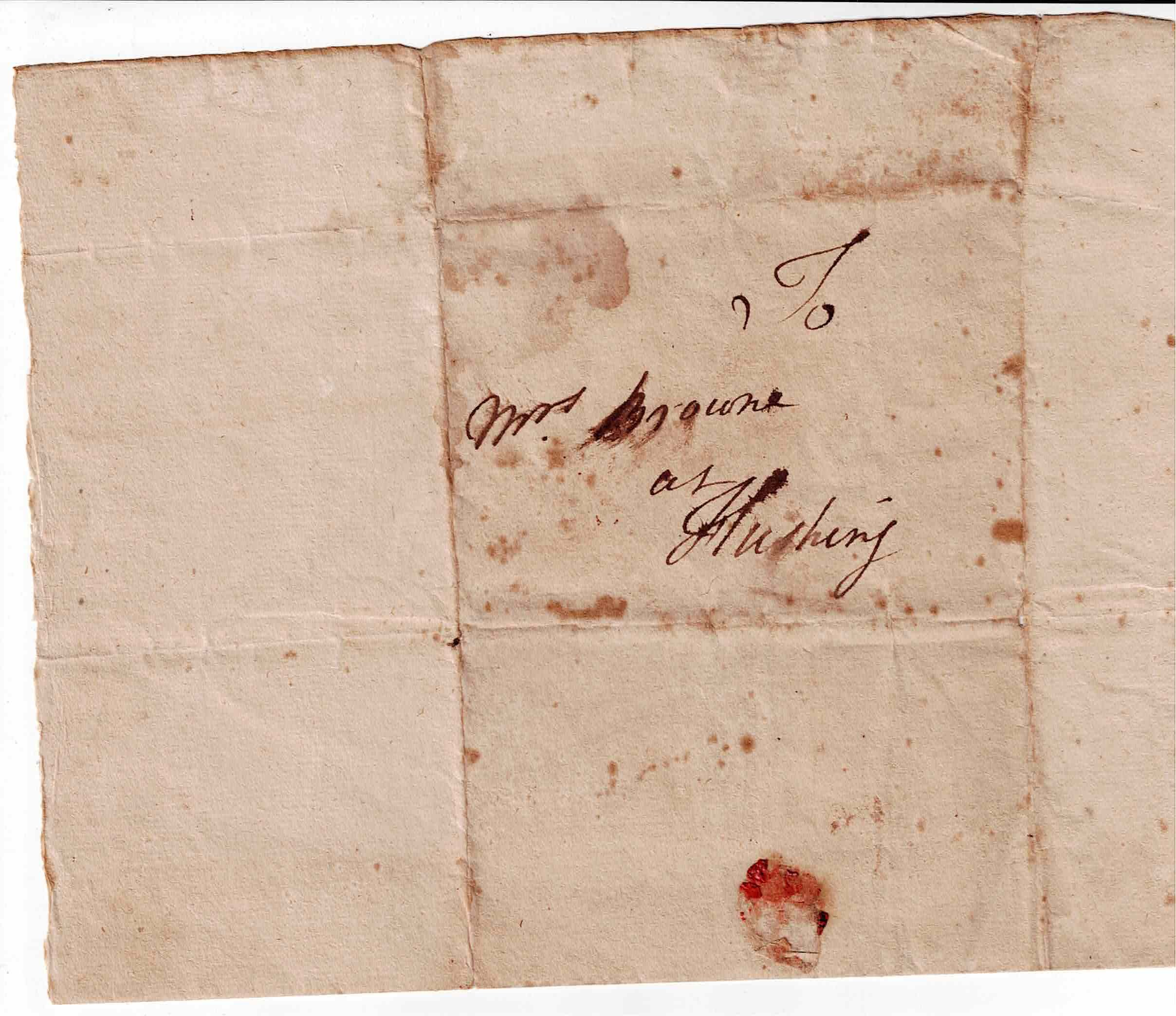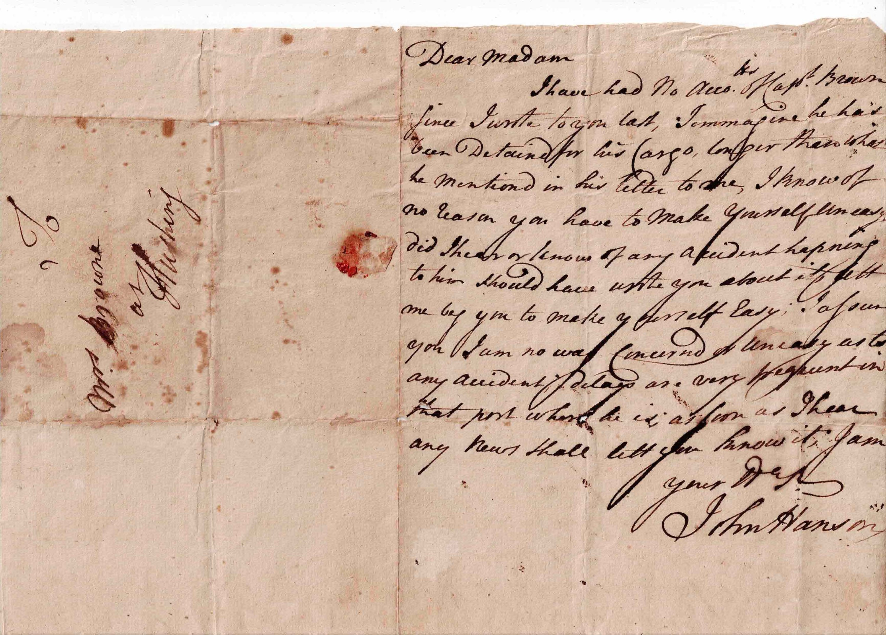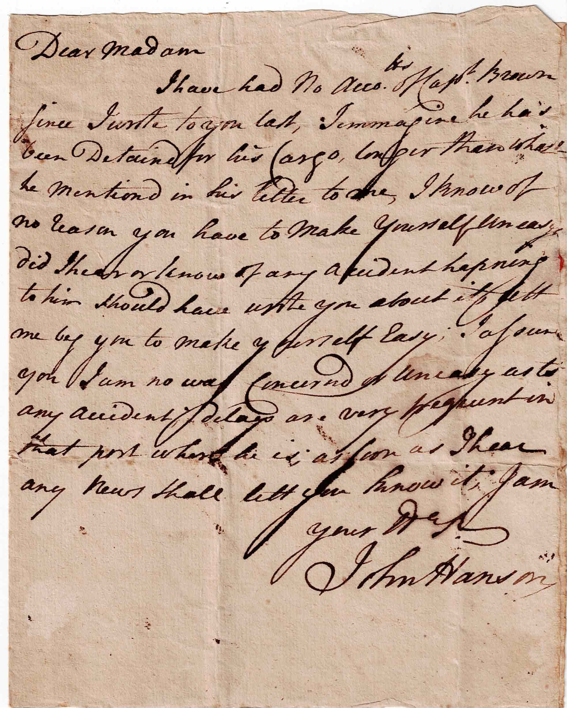 [1770s] letter hand carried to Mrs. Browne [Sarah Payne Browne, born 1730] in Flushing NY from John Hanson [of Jamaica, Long Island, not to be confused with the John Hanson of the Continental Congress]. The letter: “Dear Madam, I have had no accounts of Captain Browne since I wrote to you last. I imagine he has been detained for his cargo longer than what he mentioned in his letter to me. I know of no reason you have to make yourself uneasy, did I hear or know of any accident happening to him I should have wrote you about it. Let me beg you to make yourself easy. I assure you I am no way concerned or uneasy as to any accident. Delays are very frequent in that part where he is. As soon as I hear any news shall let you know it, I am your servant, John Hanson” Laid paper, with watermark the ‘Maid of Dort’ of Dutch manufacture 13”x8”. Hanson was given 100 pounds by The New York Provincial Congress of 30 August 1775 for his work towards obstructing the Hudson River.