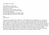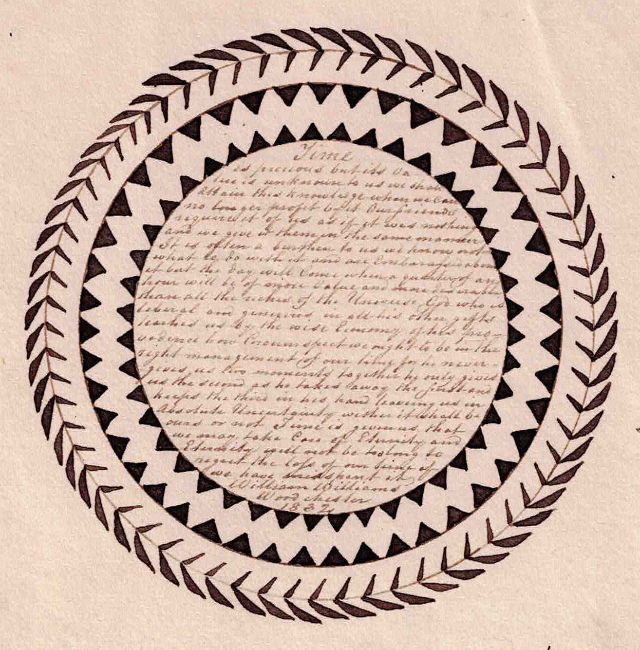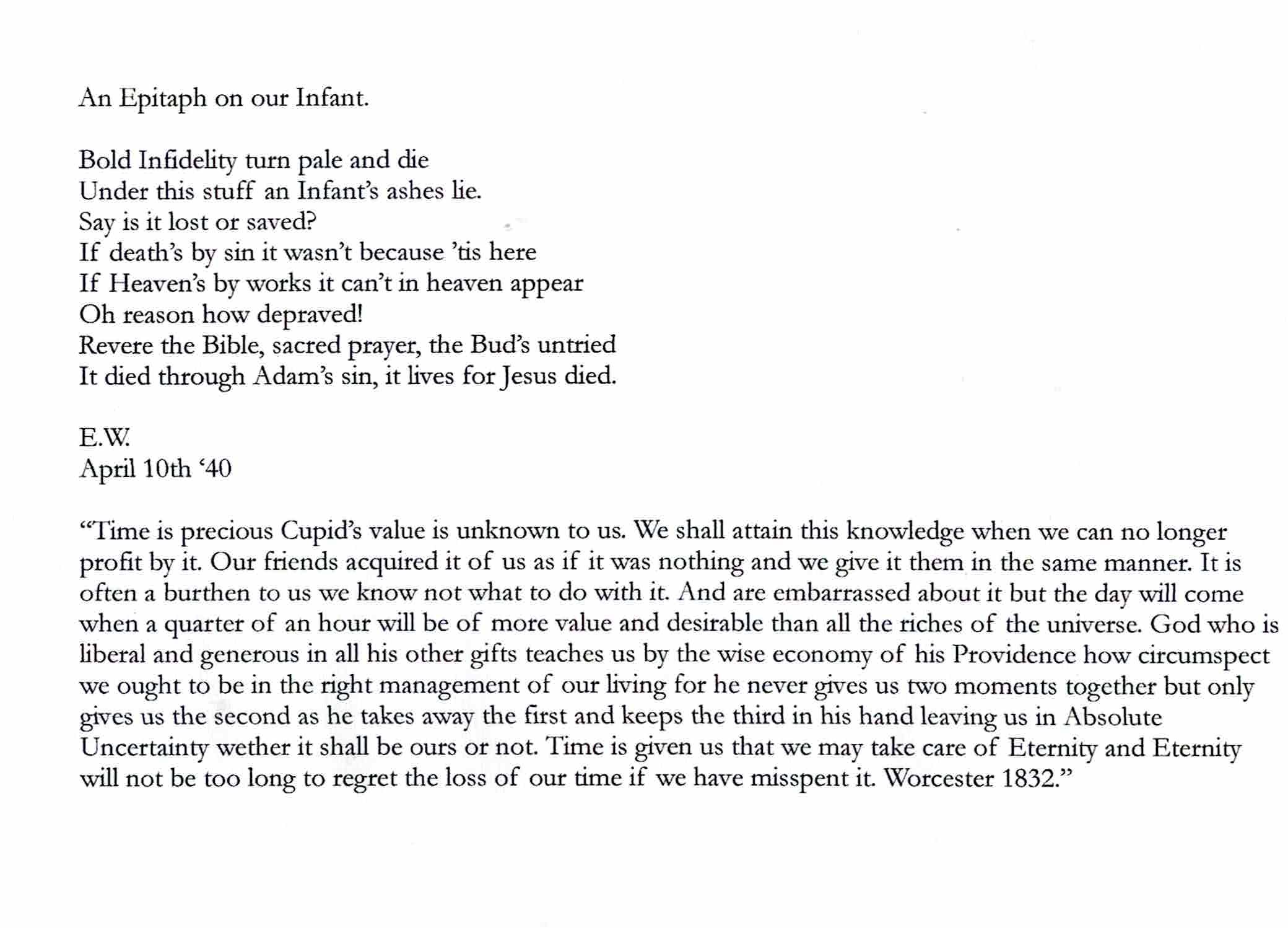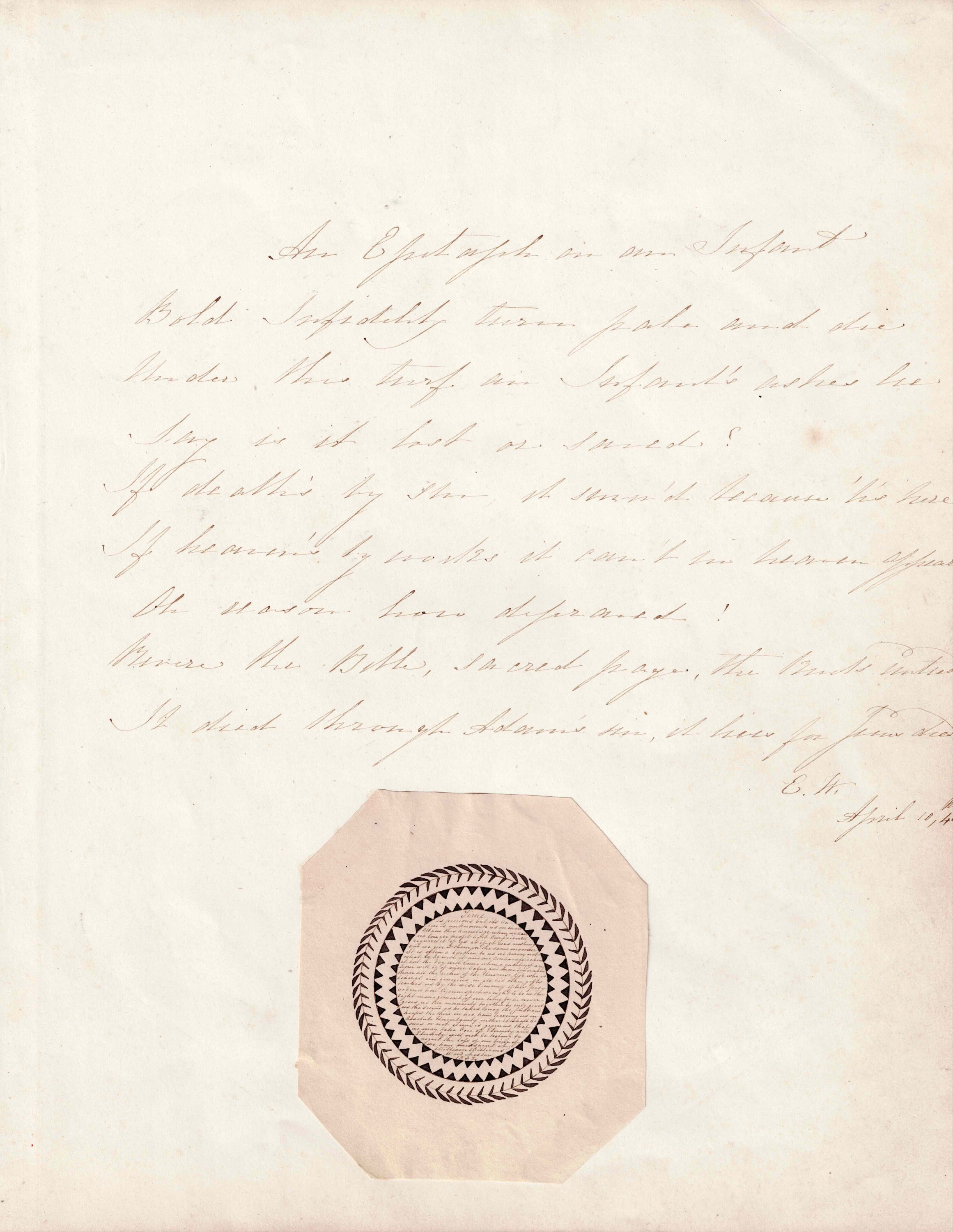 1840 manuscript poem on the death of an infant, written by “E.W.” on April 10. Attached is a inked medallion with three decorative frames, and a manuscript in miniature - the text is from the 1797 Extracts from the Writings of Francis Fenelon, Archbishop of Cambray … by John Kendall: “On the right Employment of our time.” The piece was quoted by William Williams (probably in one of his almanacs) and recorded in Worcester MA in 1832. The whole page: 8.25”x10”; the medallion diameter 2”.