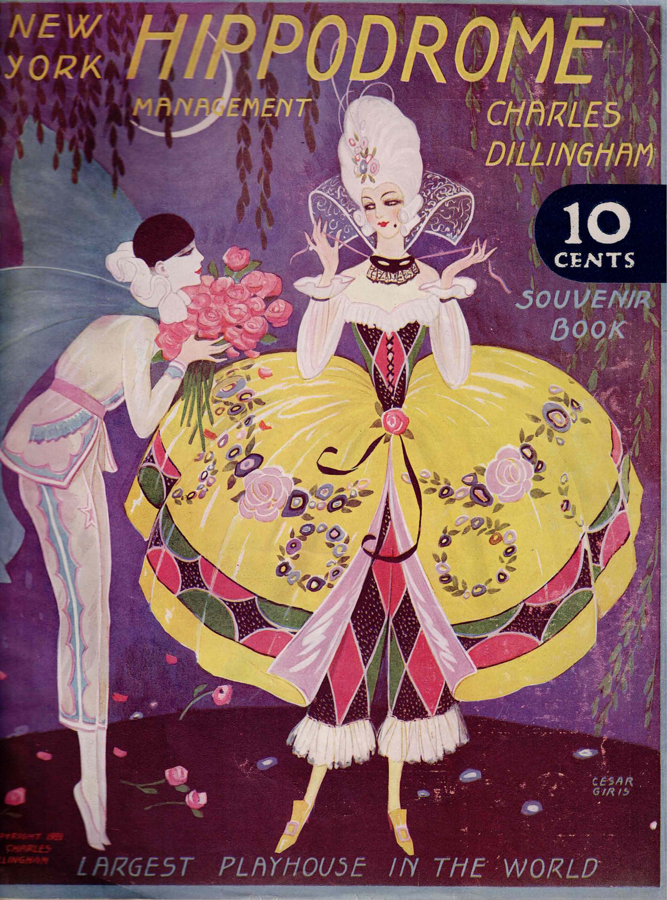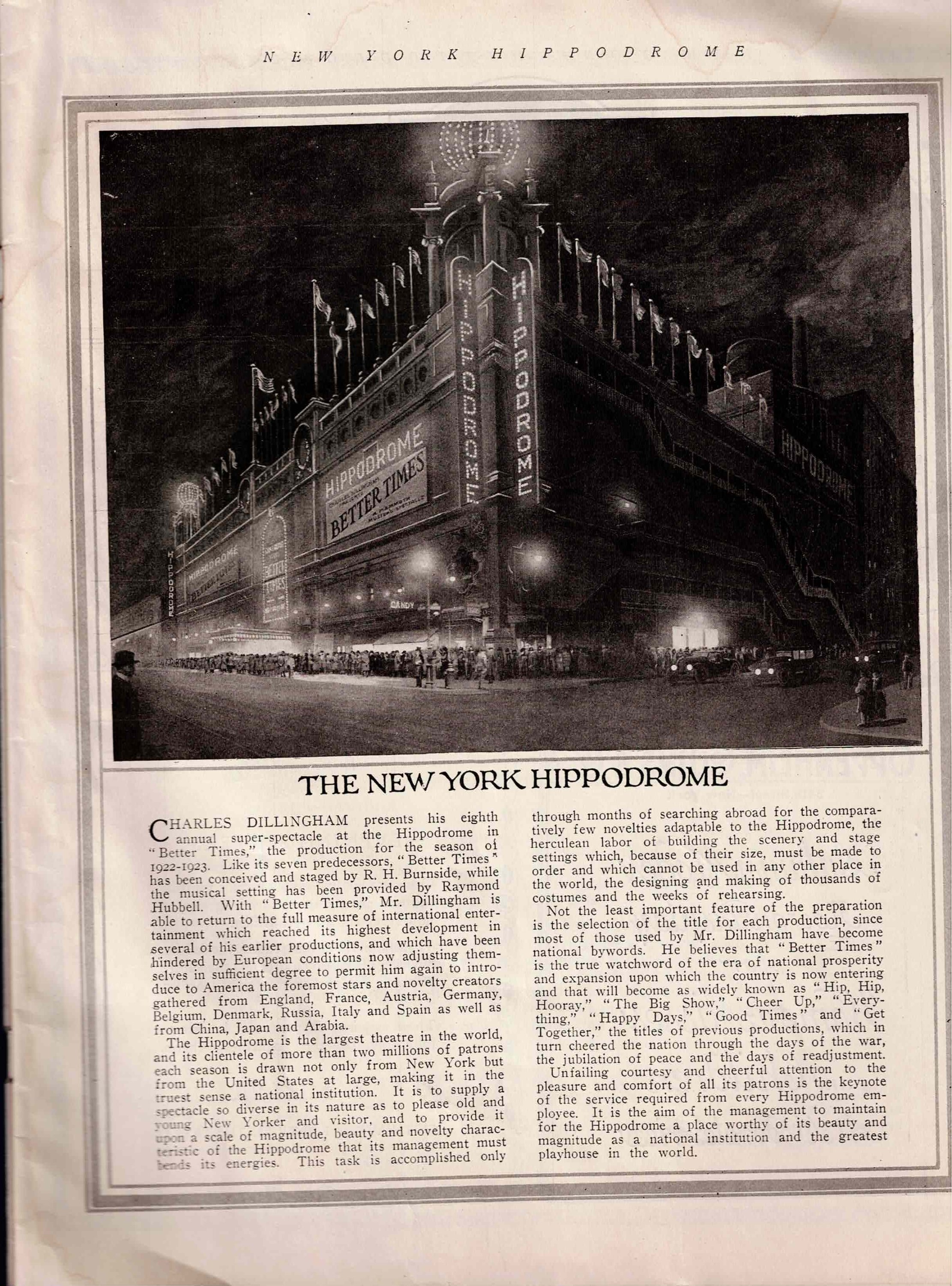 1922 program for the New York Hippodrome, under the management of (and copyright) Charles Dillingham. Souvenir of the Better Times show. Cover illustration by César Girls (1877-1941). High divers and clowns, Orlando and his wonderful Horses, elephants, etc. 32 pages + wraps, 8.5”x11”