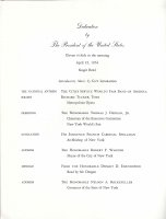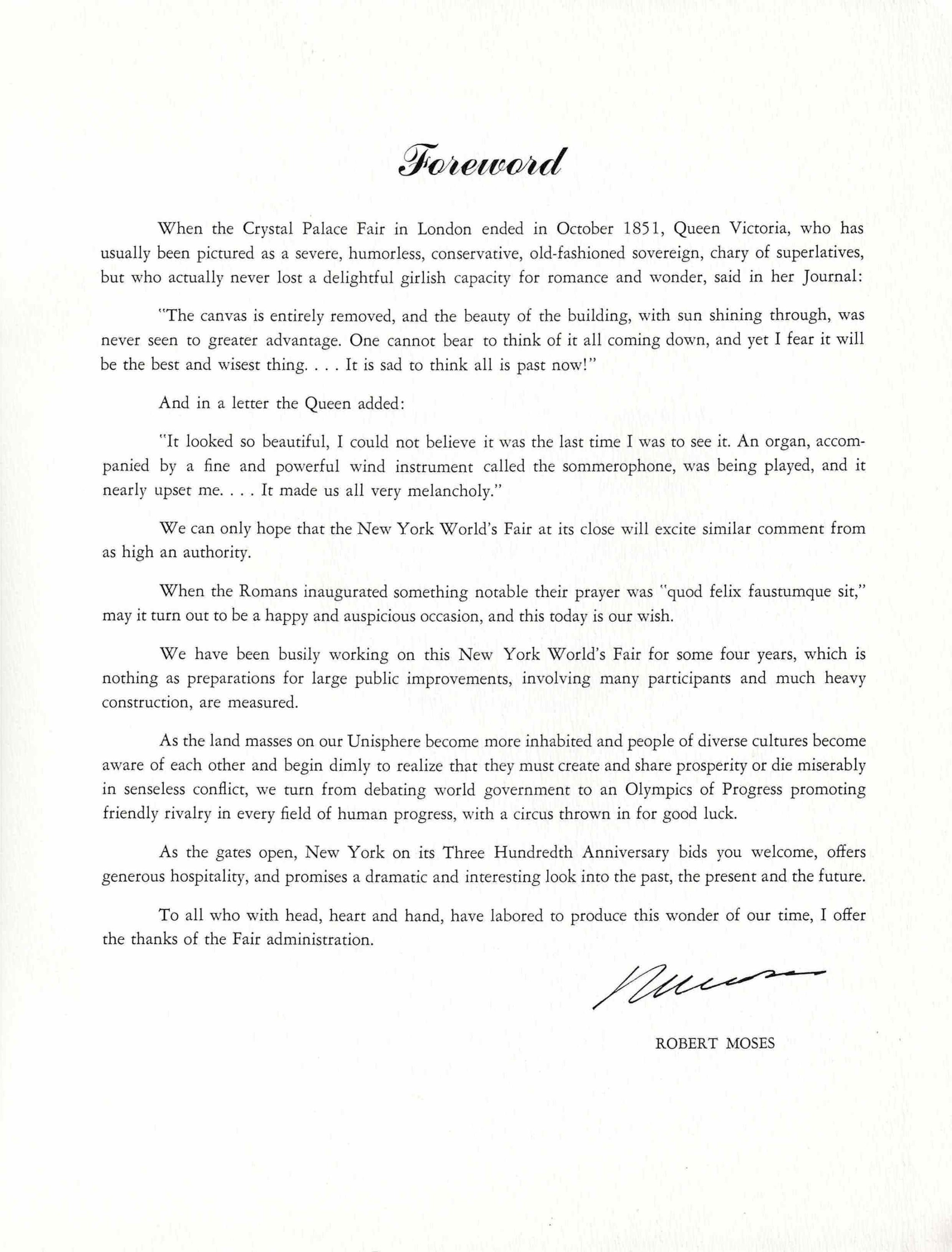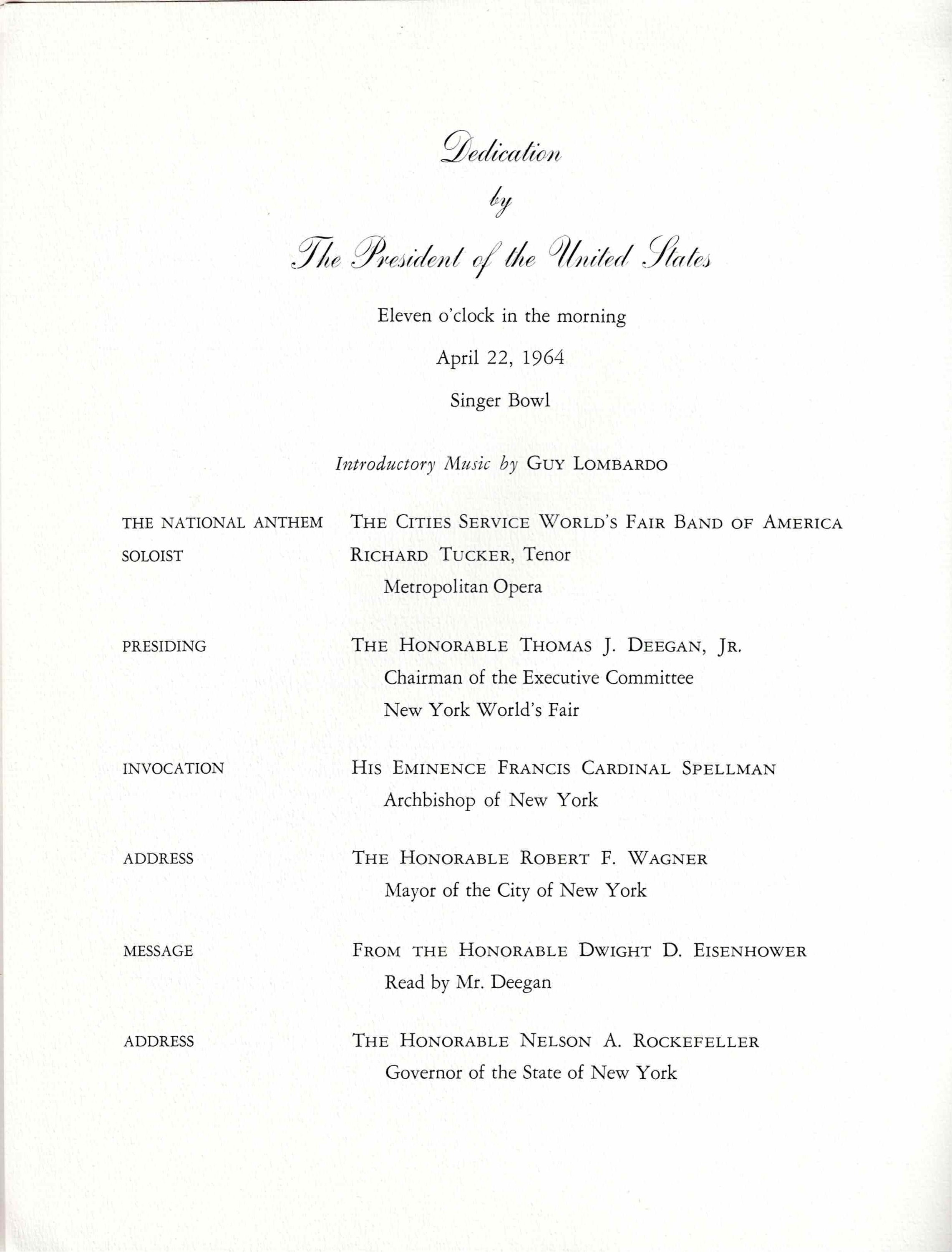1964 program for the “Official Opening” of the New York World’s Fair, signed by Robert Moses, message from President Eisenhower to be read, address by President Johnson, address by Mrs. Gandhi, presentation of commemorative stamp. 12 pages + embossed covers. 8.5”x11”