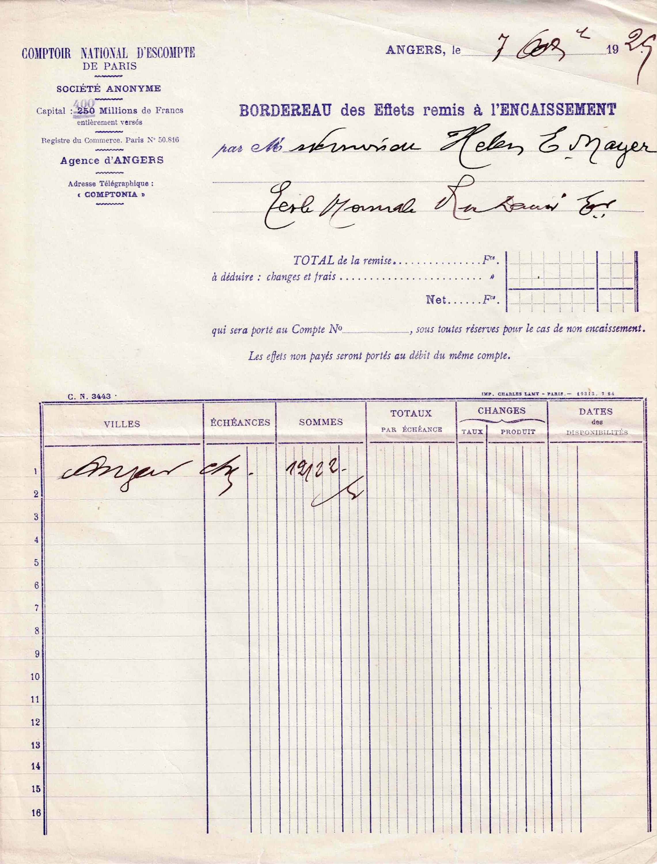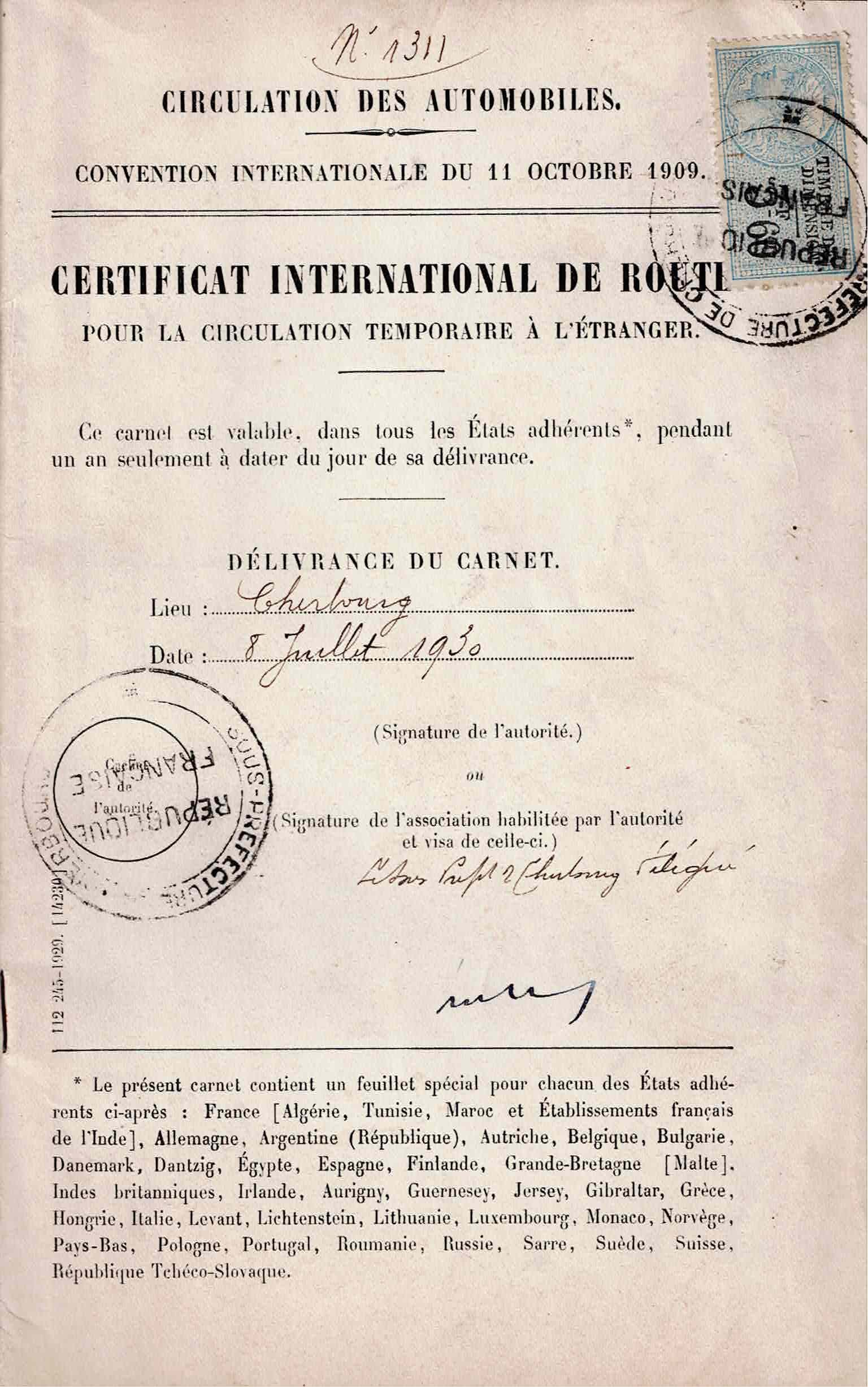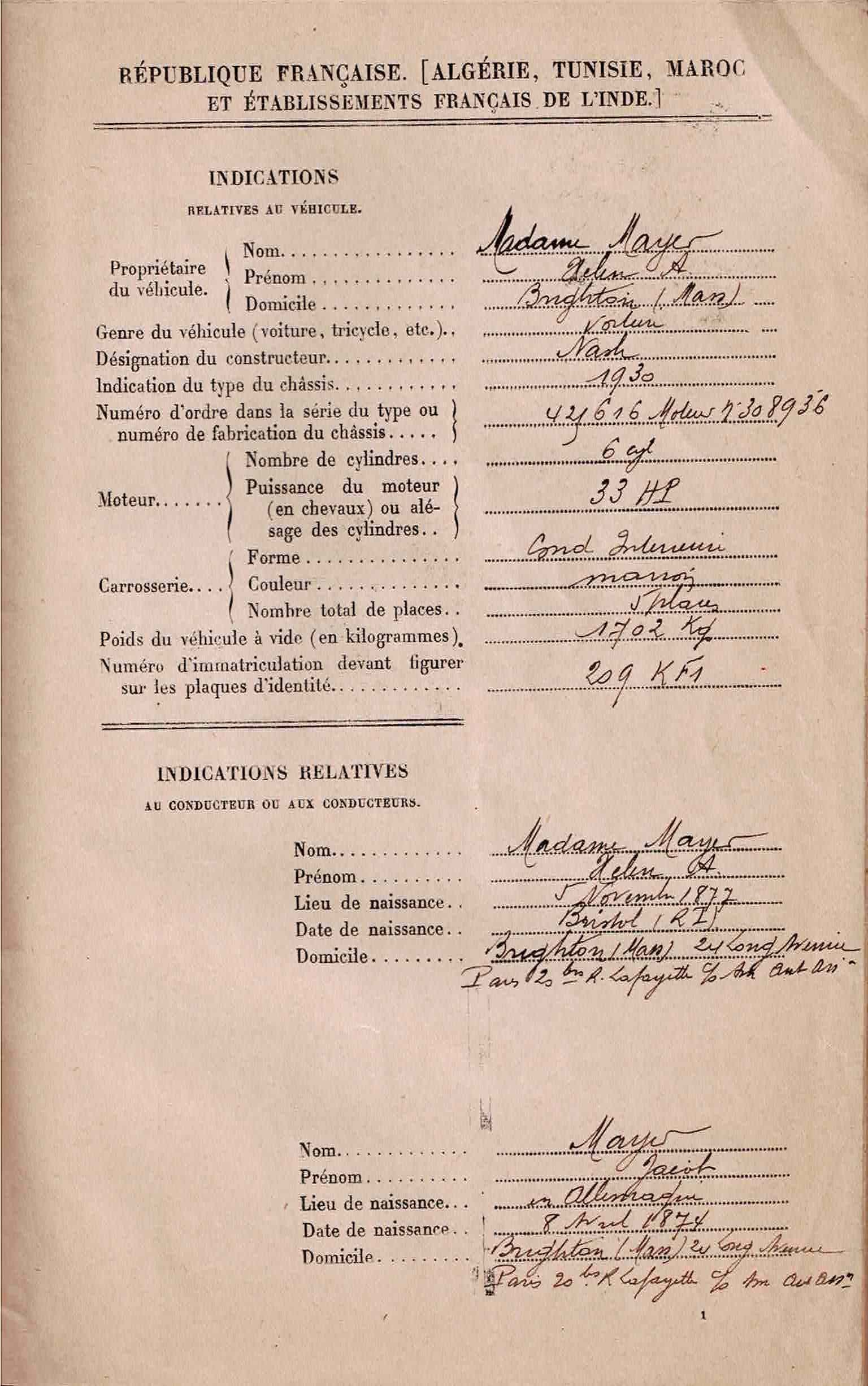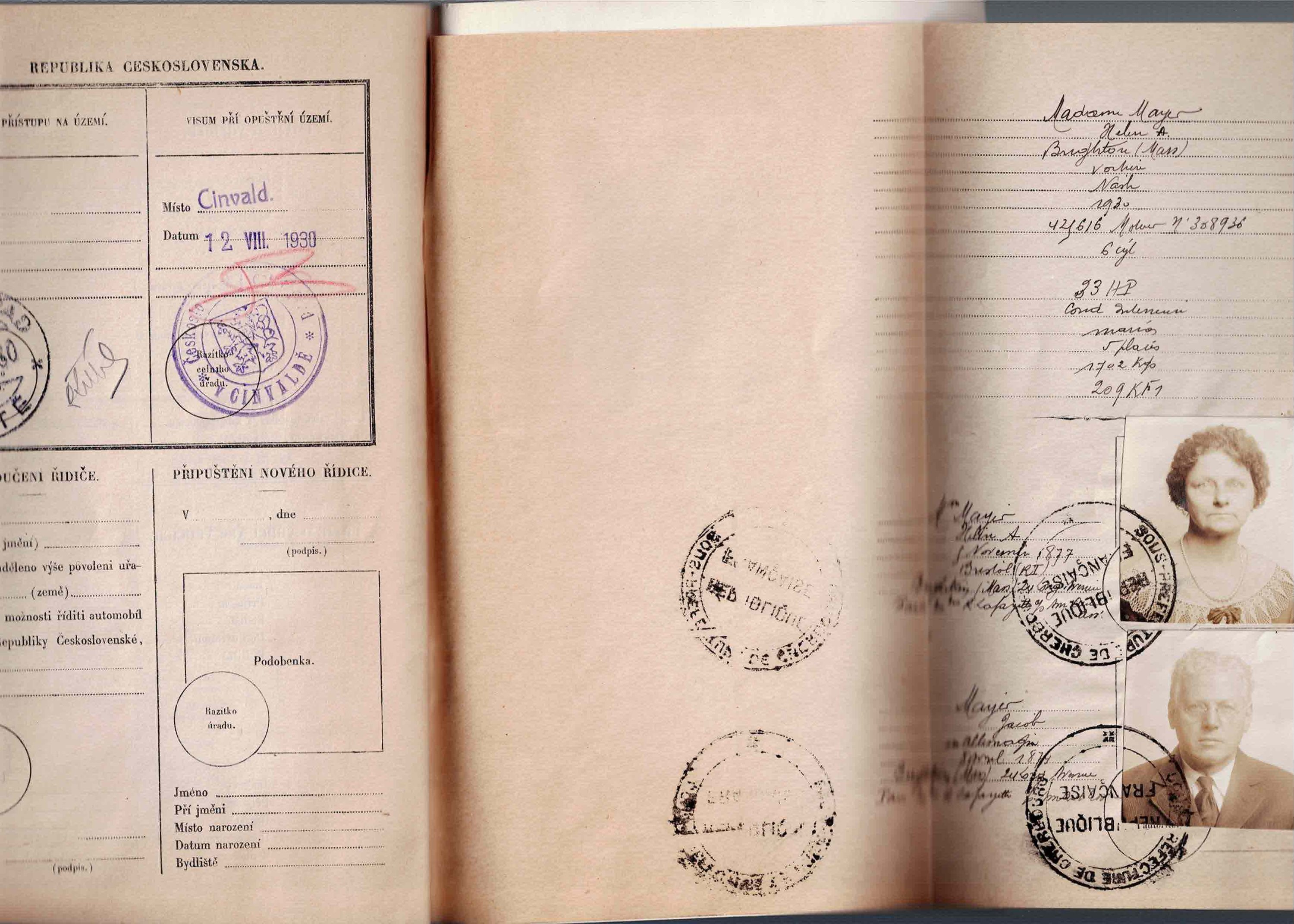 1930 European passport for a Nash automobile, Madame Helen A. Mayer from Brighton MA reaching Cherbourg 9 July, driving to the Czech Republic, arriving 12 August. With separate money exchange document from Angers in 1929.