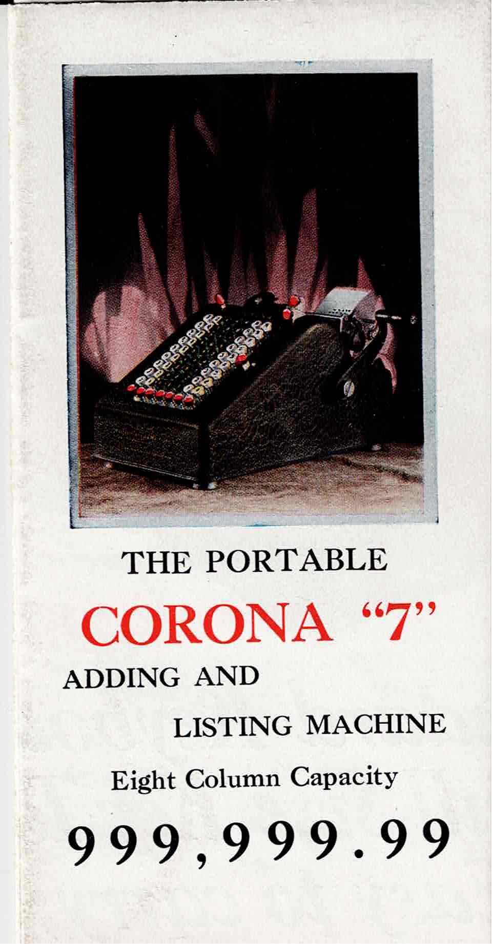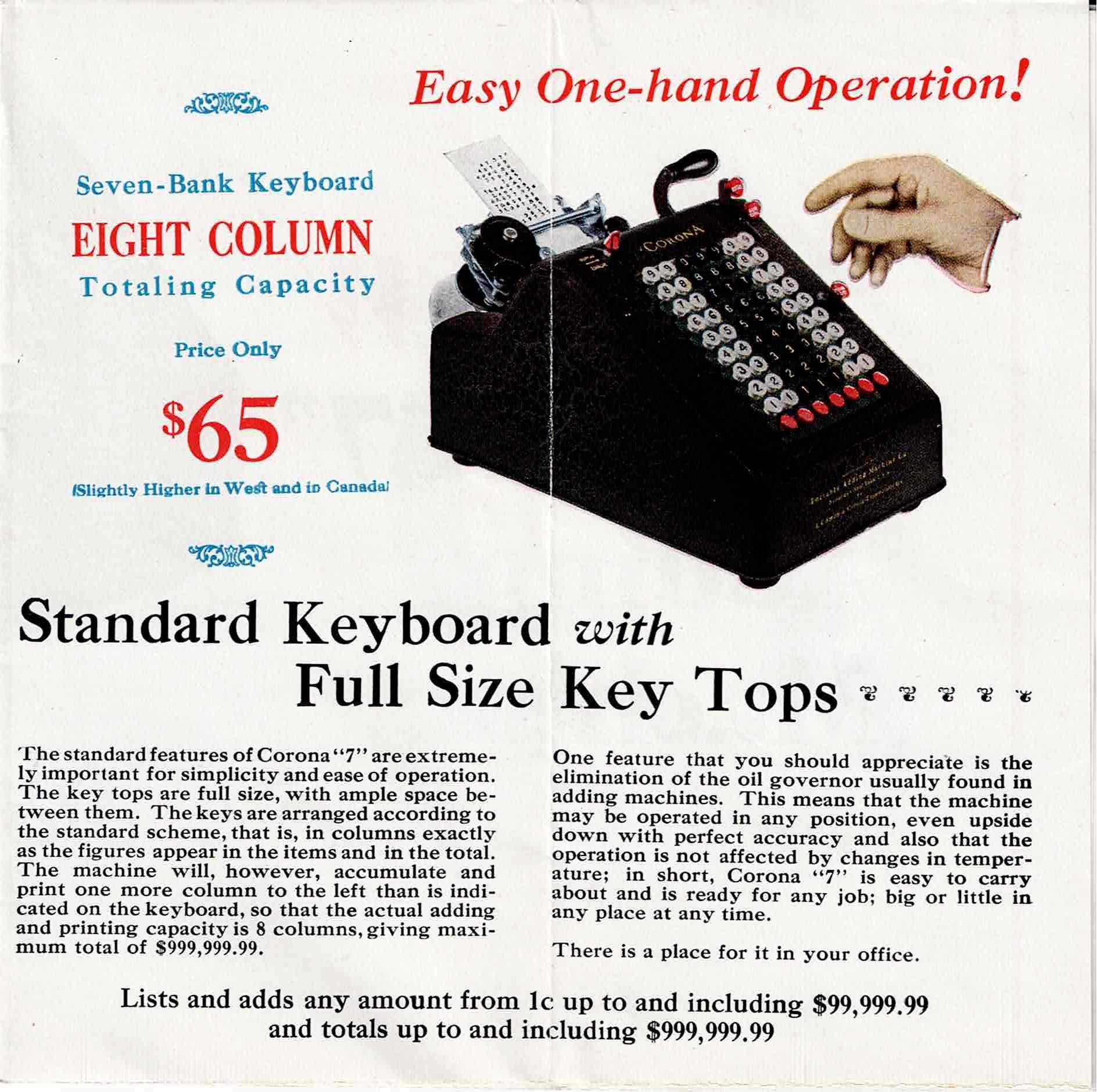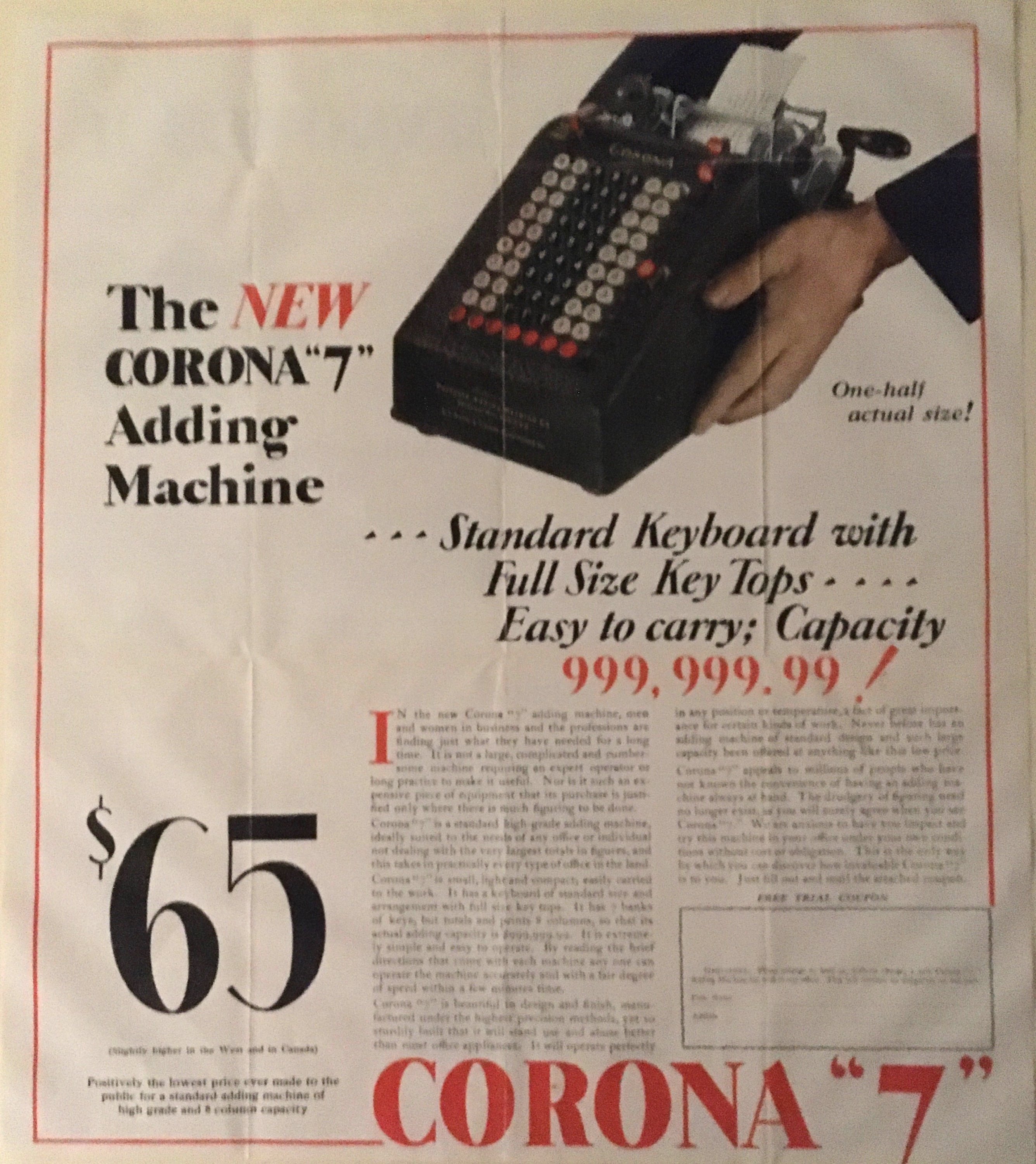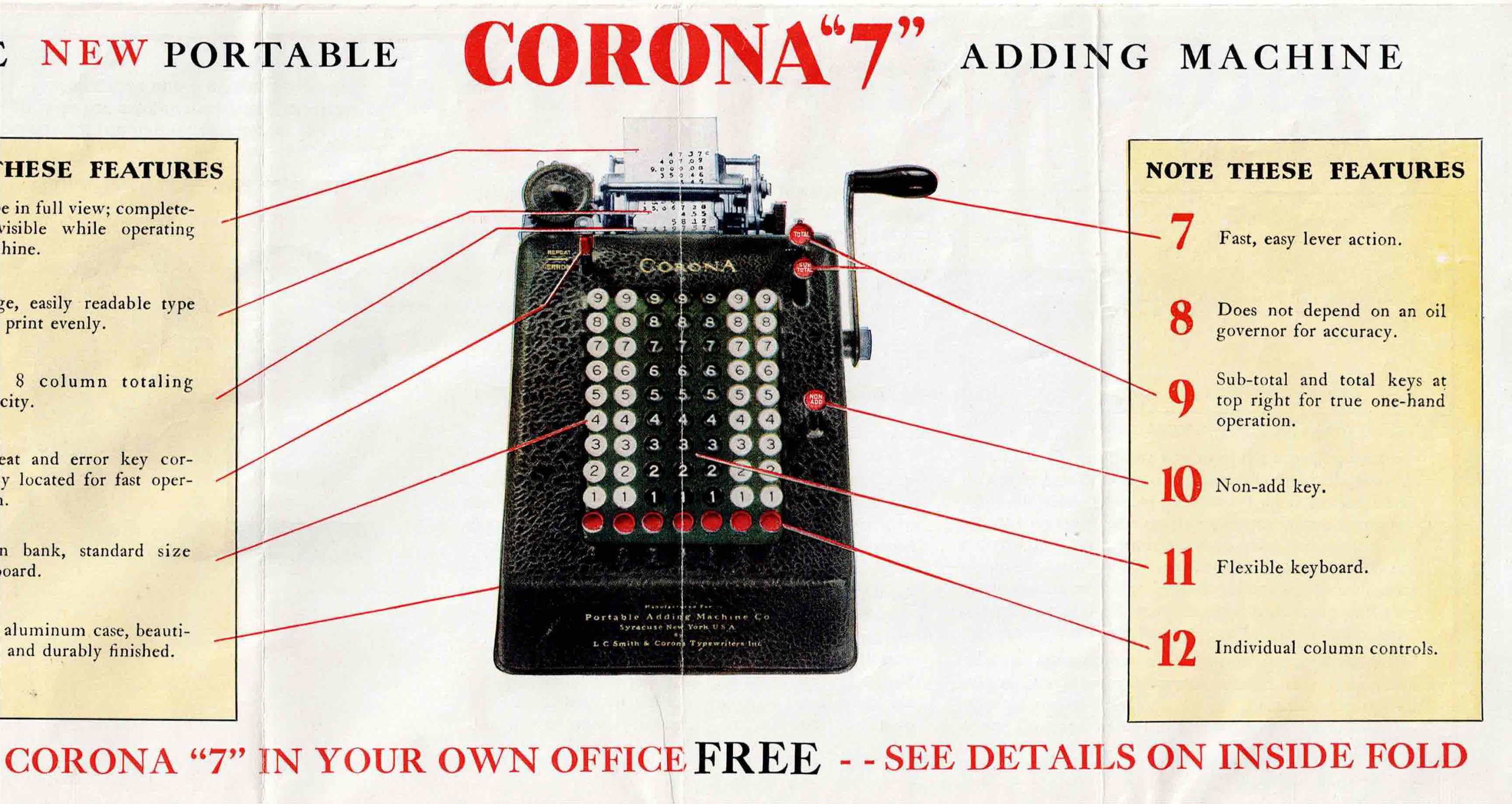 1930 folding flyer for the Corona “7” adding machine, L.C. Smith & Corona Typewriters Inc., Syracuse NY, overprinted for Berkshire Office Supply in Springfield MA. Poster 12.25”x14.25” folding to 3.25”x6.25”