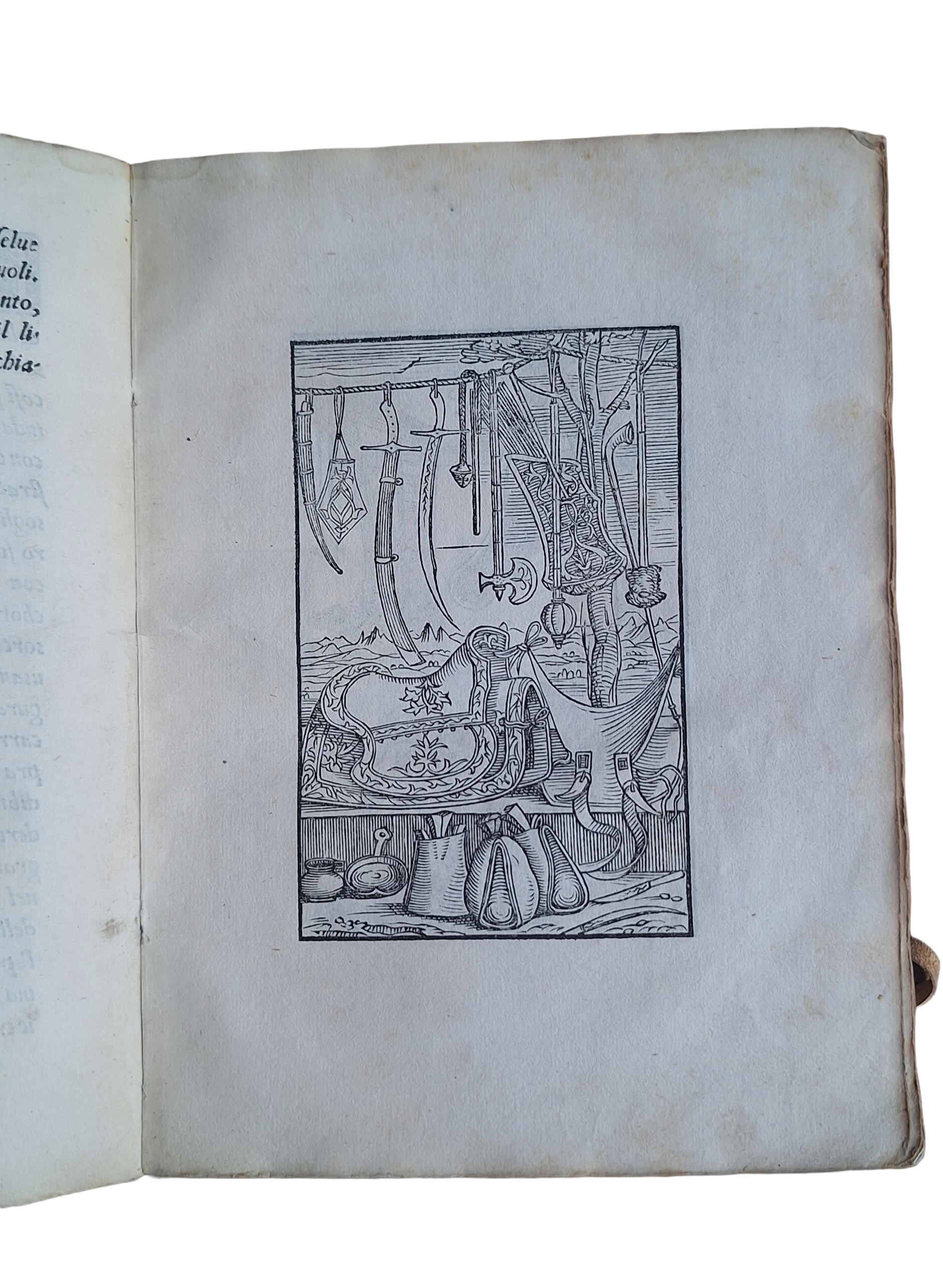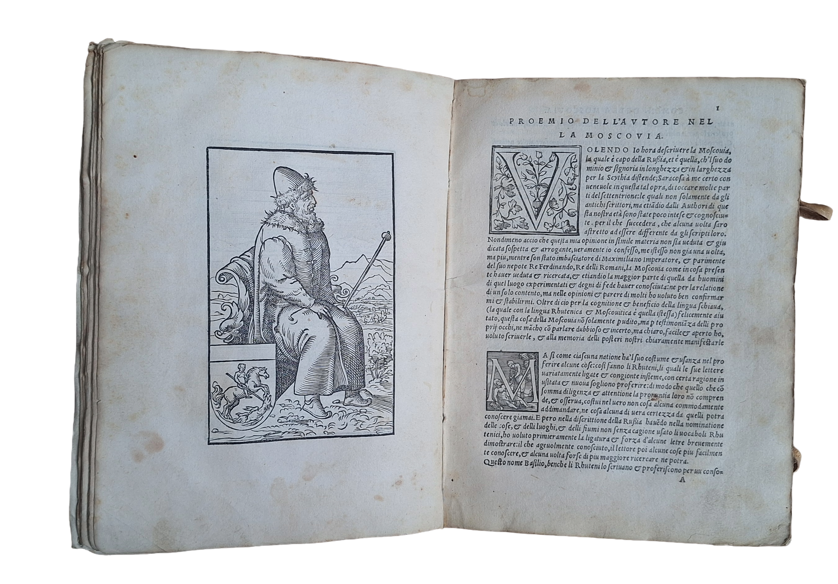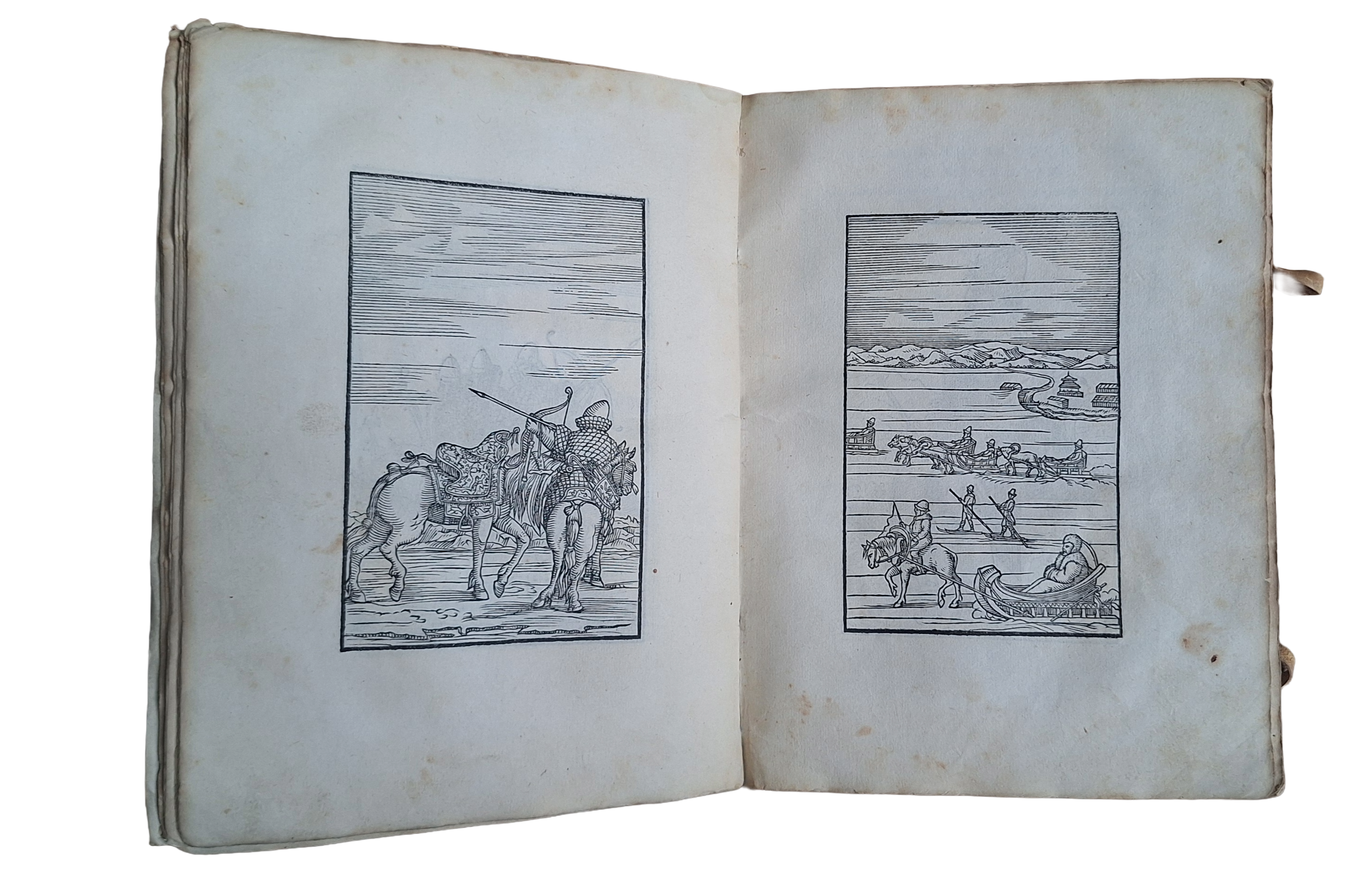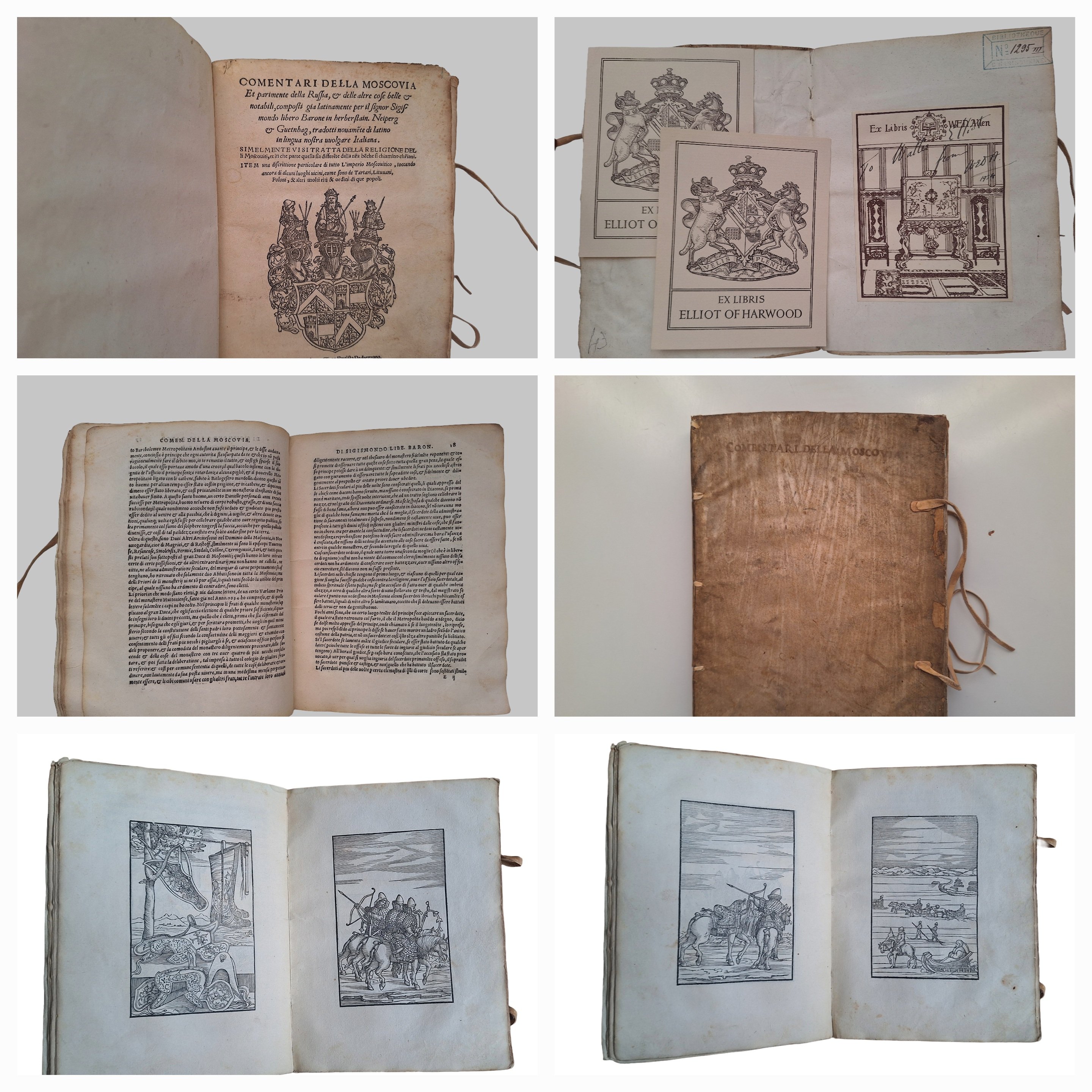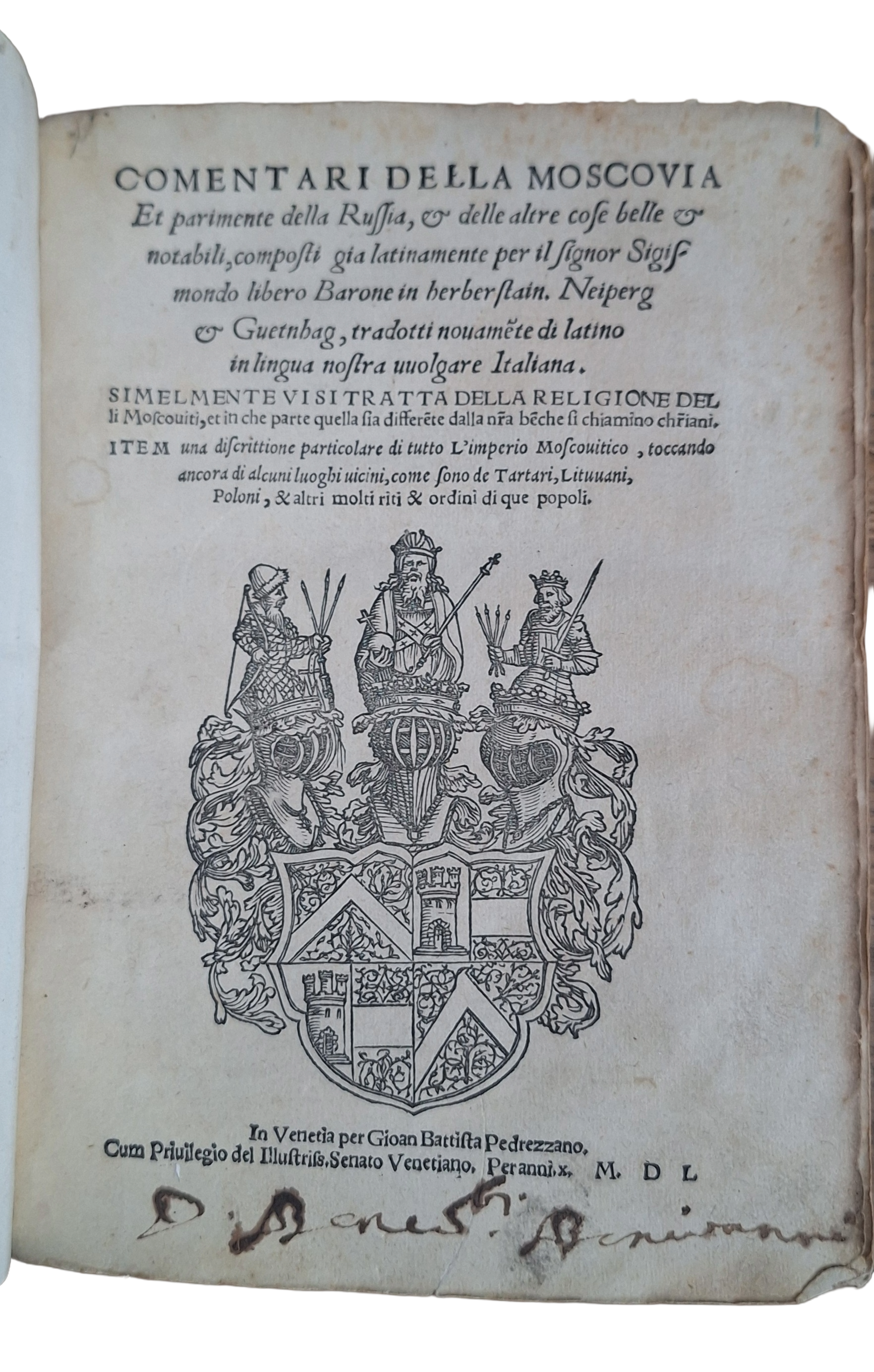 Herberstein, Sigismund von (1486-1566). “Comentari della Moscovia. Et parimente della Russia, et delle altre cose belle et notabili, composti gia latinamente per il signor Sigismondo libero Barone in Herberstain. Neiperg et Guetnhag, tradotti novamente di latino in lingua nostra vuolgare Italiana. Simelmennte vi si tratta della religione del li Moscoviti, et in che parte quella sia differete dalla nra beche si chiamino chriani. Item una discrittione particolare di tutto L’imperio Moscovitico, toccando ancora di alcuni luoghi vicini, come sono de Tartari Litvuani, Poloni et attri molti riti et ordini di que popoli”. Venetia, Gioan Battista Pedrezzano. Cum Privilegio del illustriss. Senato Venetiano, M.D L [1550]. 4to (20.5 x 15.5cm), Title page, 6 [unnumbered] pages, 7 [unnumbered] pages of the index, blank unnumbered page, 91 pages, 2 [unnumbered] pages + 6 engravings on 3 leaves, of which 2 depict saddles and weapons, 2 depict horsemen, 1 shows sleigh riding, and 1 is a portrait of Grand Duke Vasilii Ioannovich. No map as in most copies.