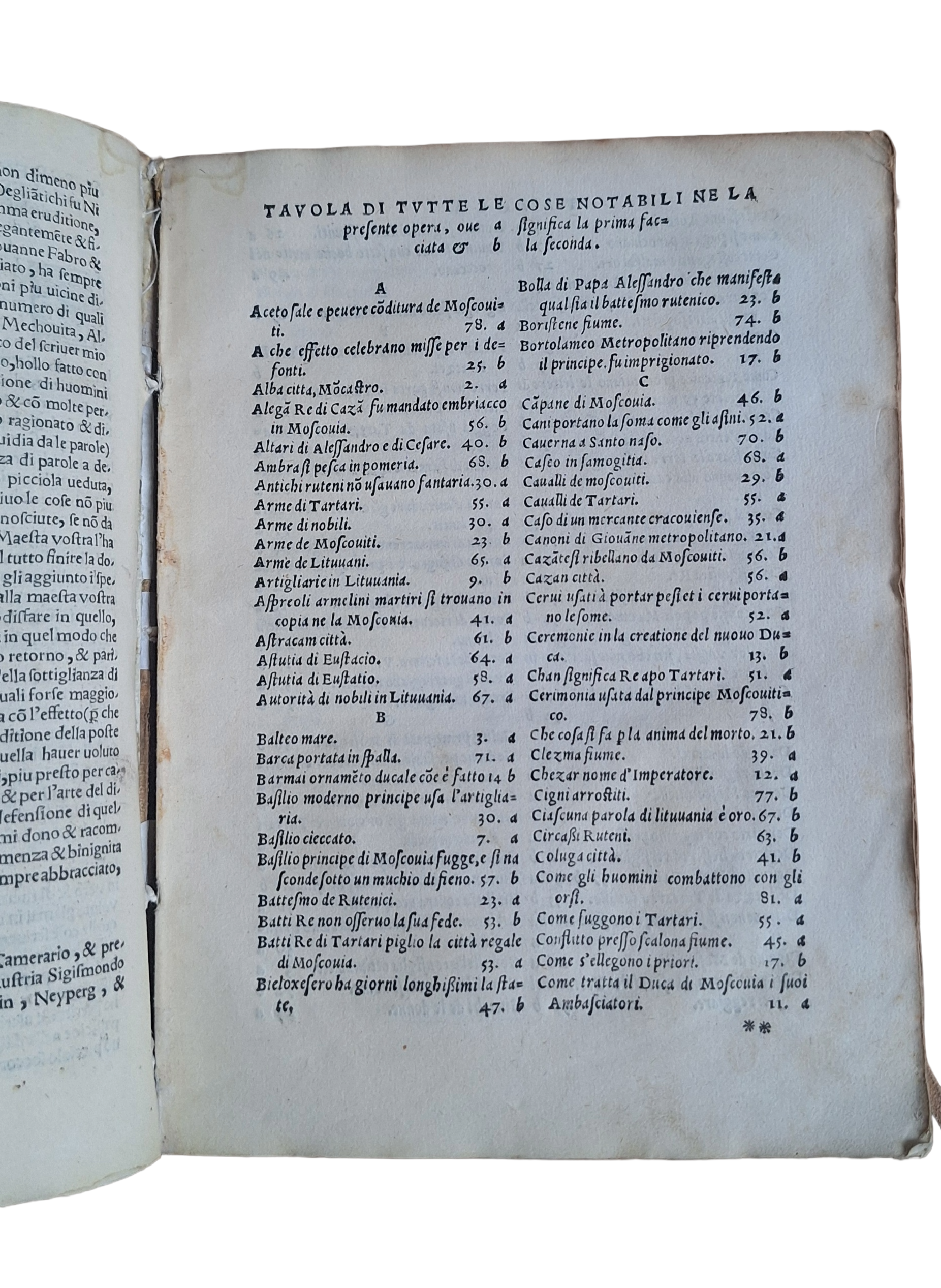 Our Italian translation of 1550 (chronologically the second edition) was printed in Venice and is among the rarest of Herberstein's early publications. Here's what Boris Zabolotskikh writes in his book Book Rarities, Moscow, 1999, p. 216: “A.D. Chertkov’s cherished desire was to acquire a small 14-page book titled ‘The reporte... in the City of Mosco’, printed in London in 1607. It was printed by a Dutch merchant who had lived in Russia for a long time. The only known copy of this book was found in the British Museum Library. Acquiring such a rarity, of course, was unrealistic. However, his rare book supplier, Zaitsevsky, managed to obtain another rarity—one that Chertkov had not even dared to dream of. It was the second edition of Herberstein’s Notes on Muscovy, published in Venice in 1550.”