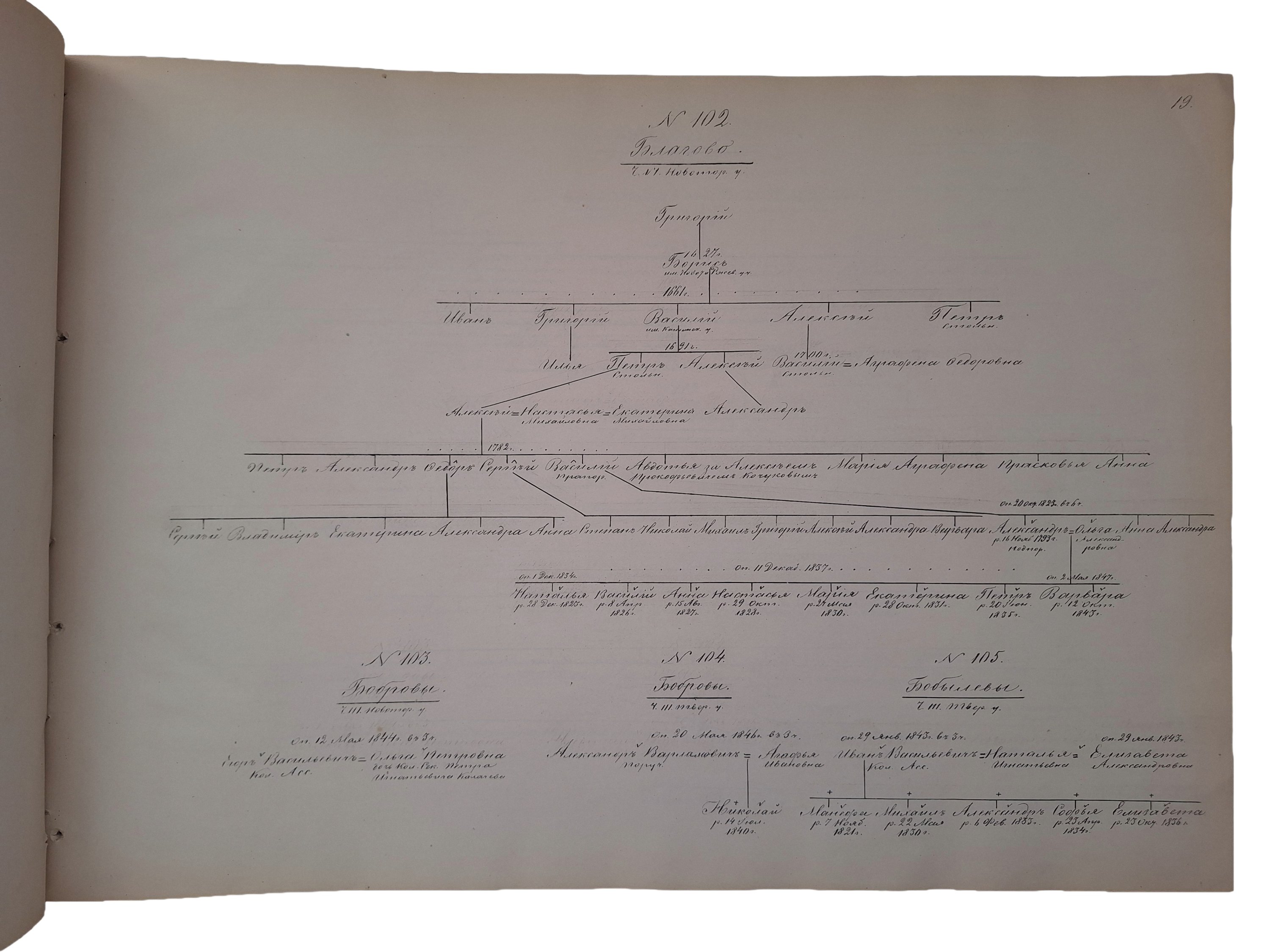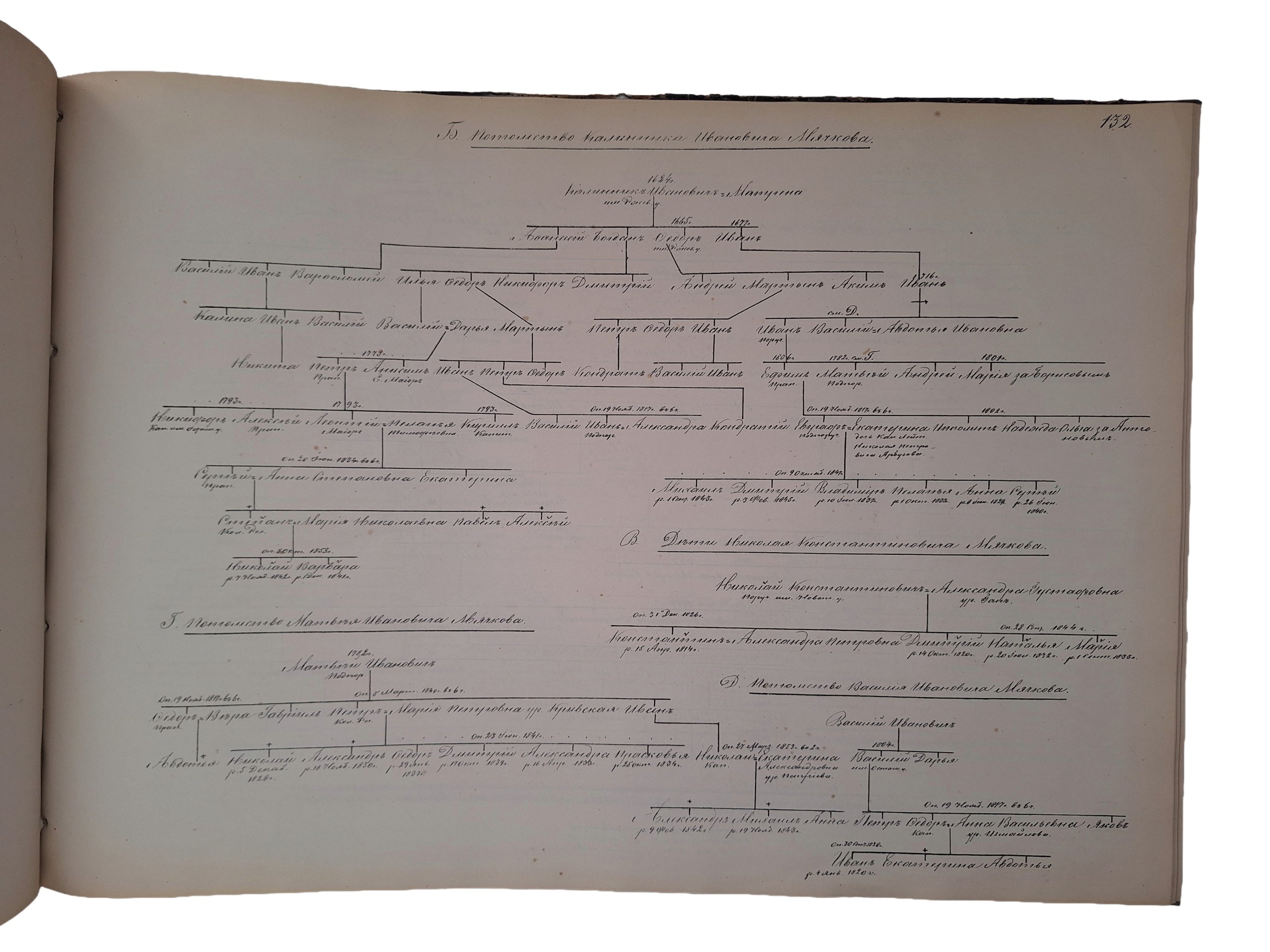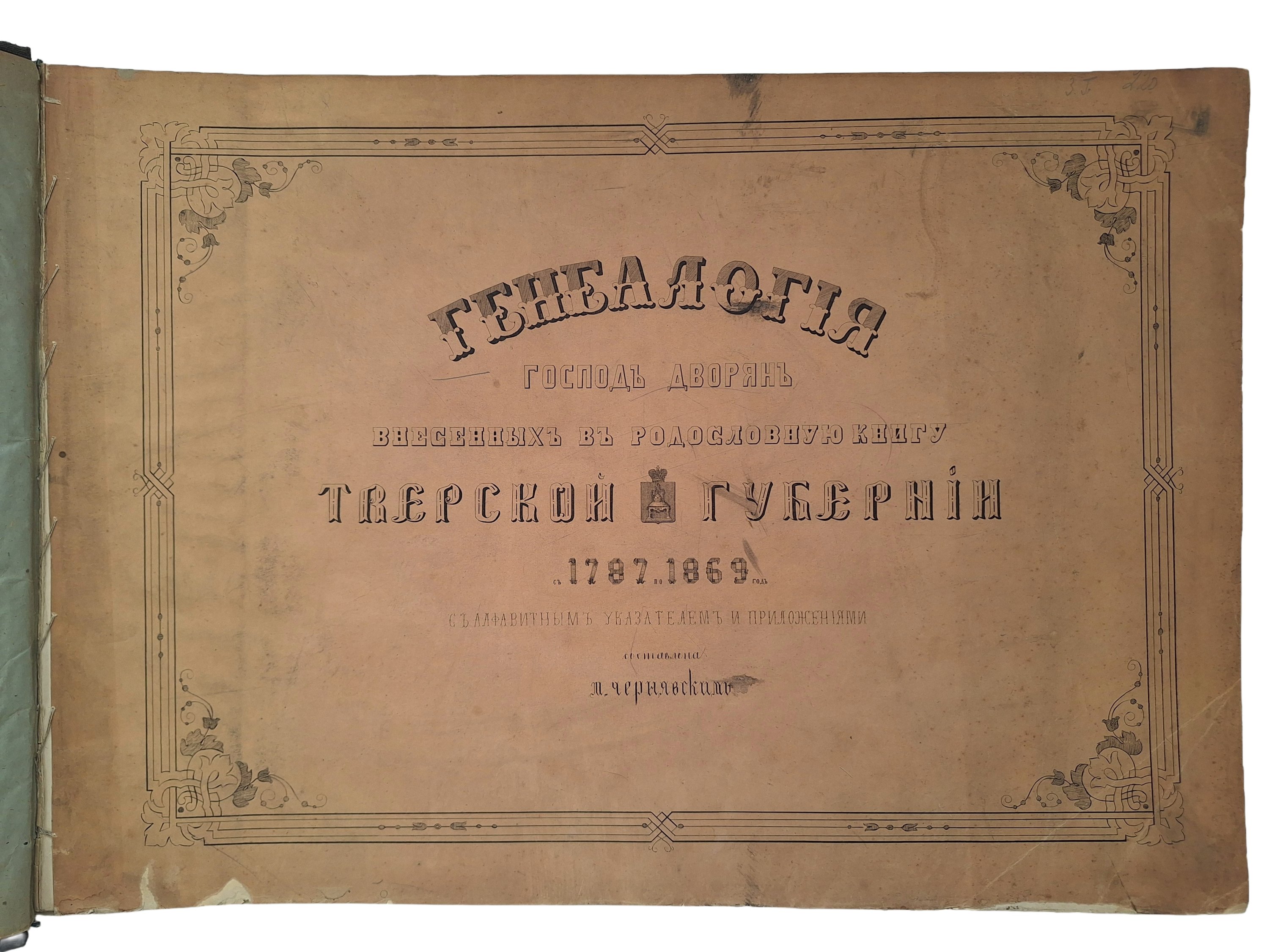 A monumental genealogical work by Mikhail Petrovich Cherniavsky, one of the first systematic compilations of noble genealogies of the Tver Province. Based on official data from the Genealogical Book of the Tver Nobility (1787 – 1869), the volume presents 1,429 family genealogical tables. The appended section (often missing in surviving copies) contains supplementary materials and the alphabetical index of noble surnames.
