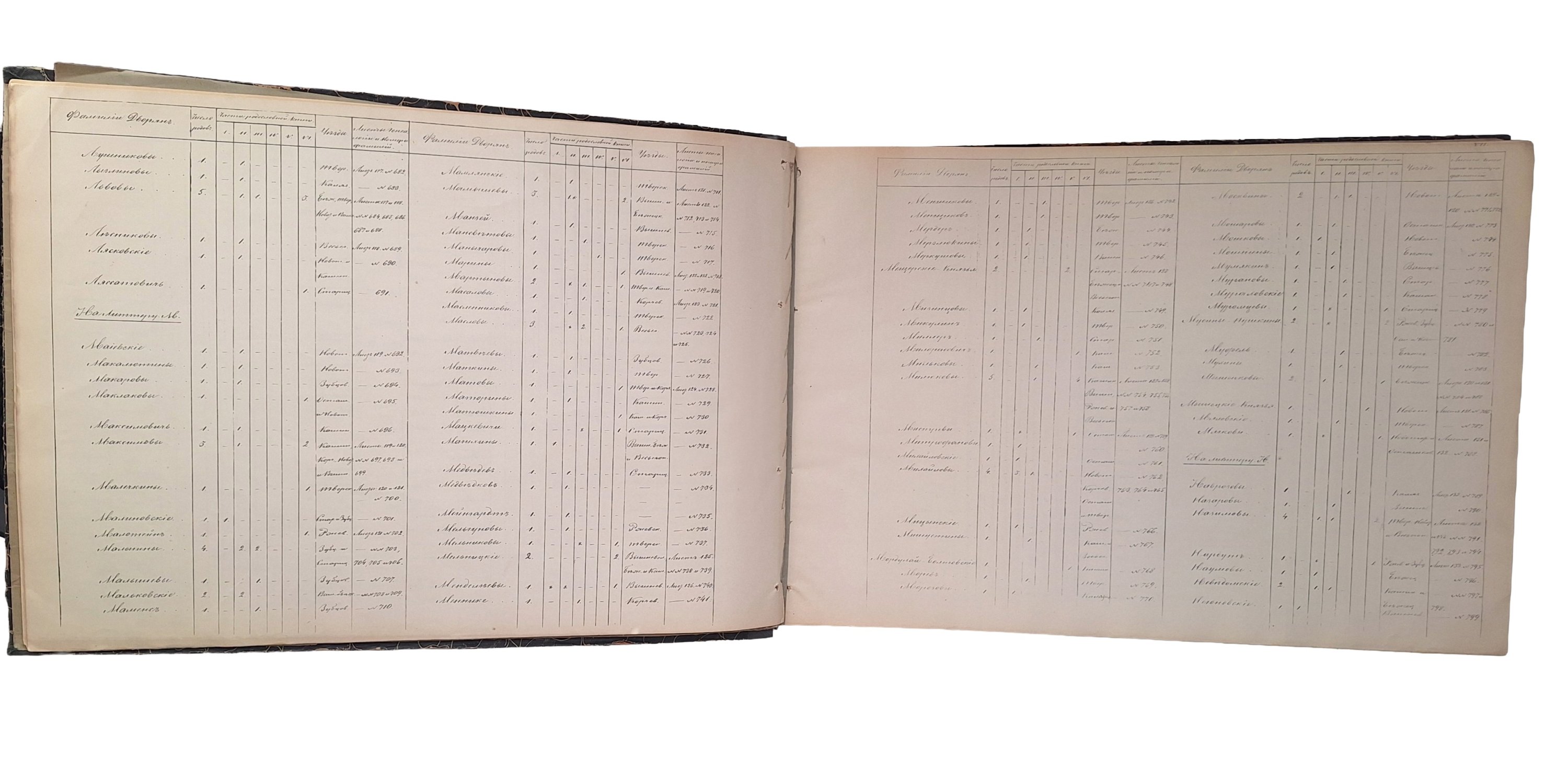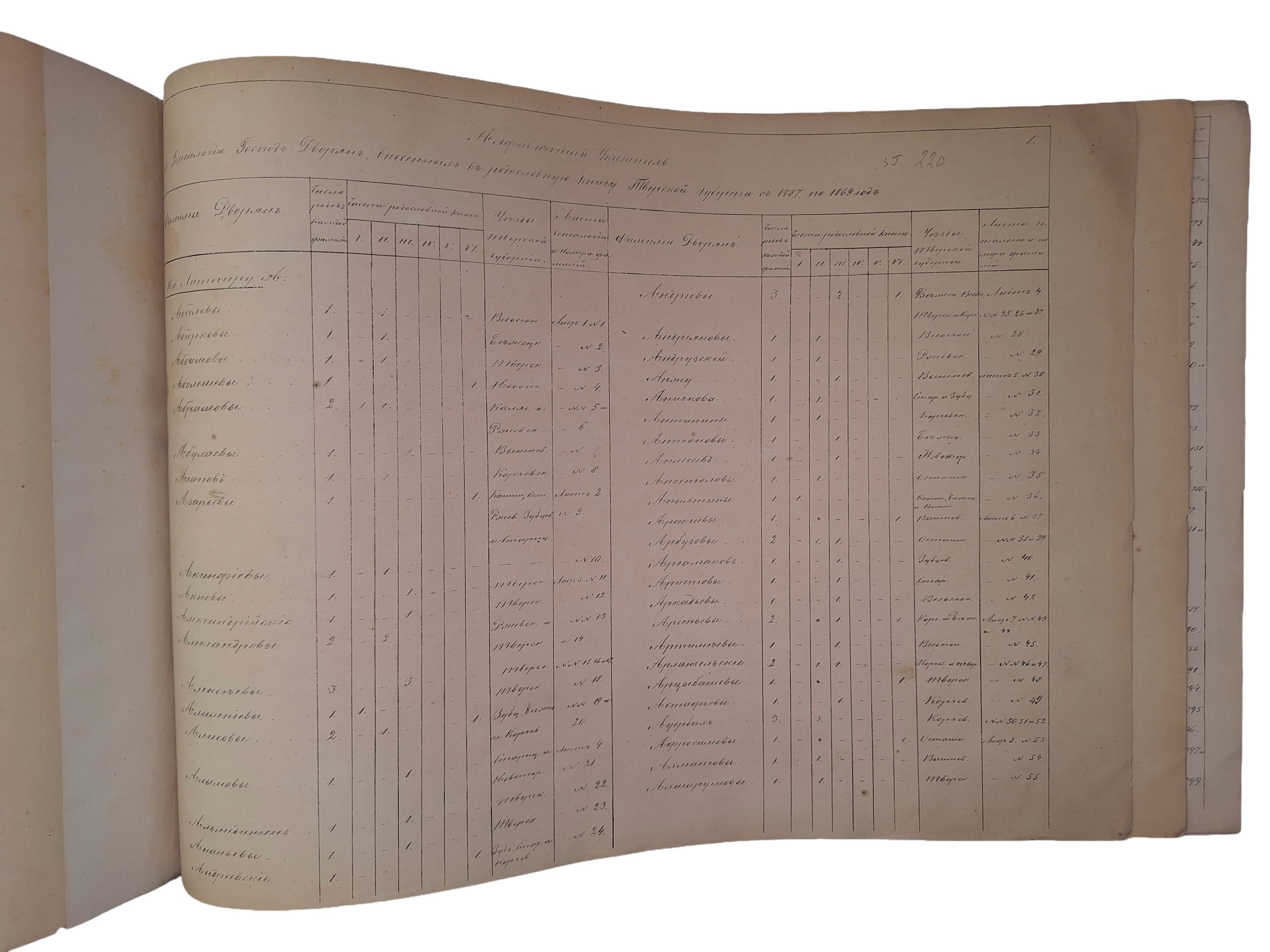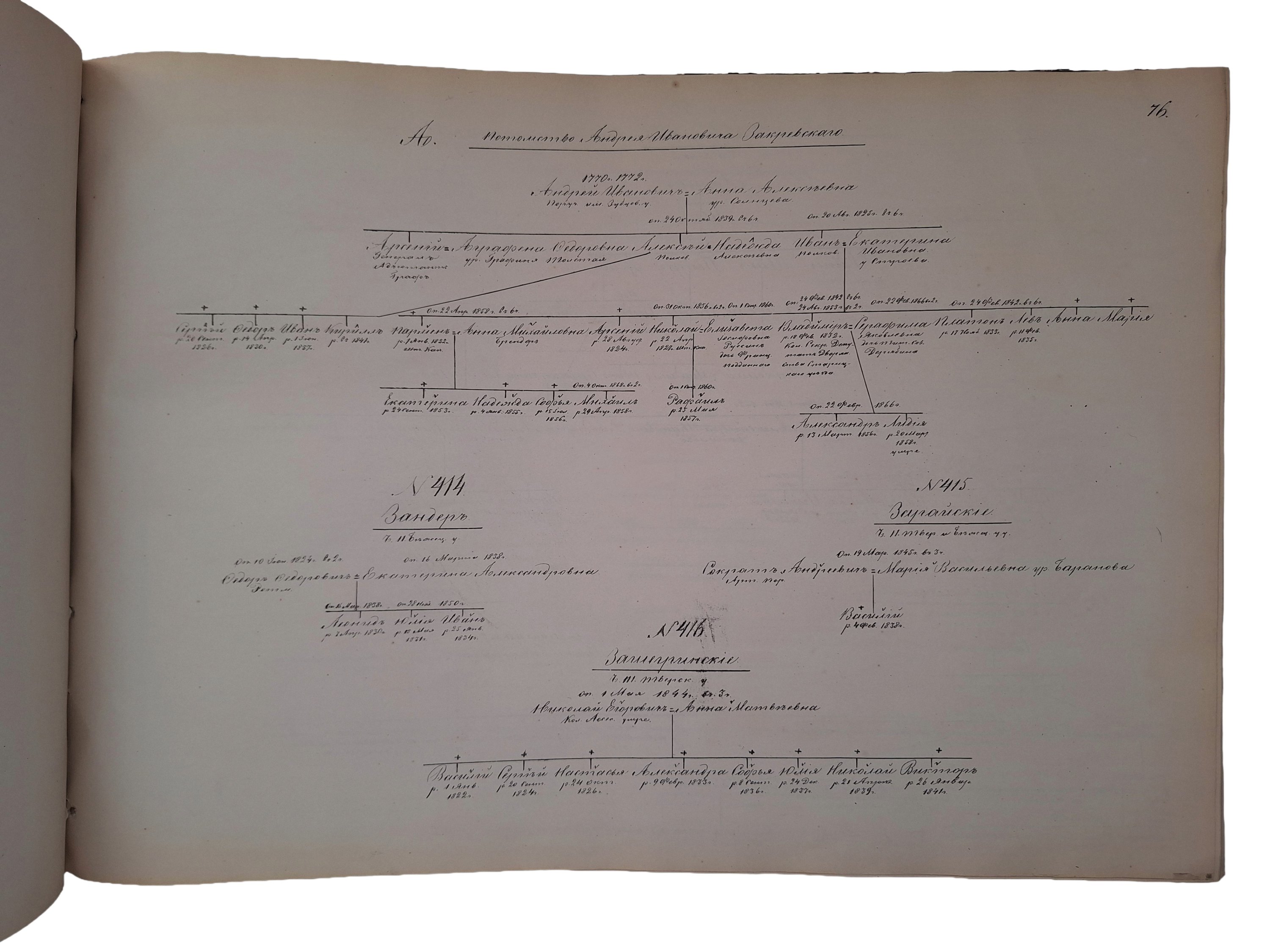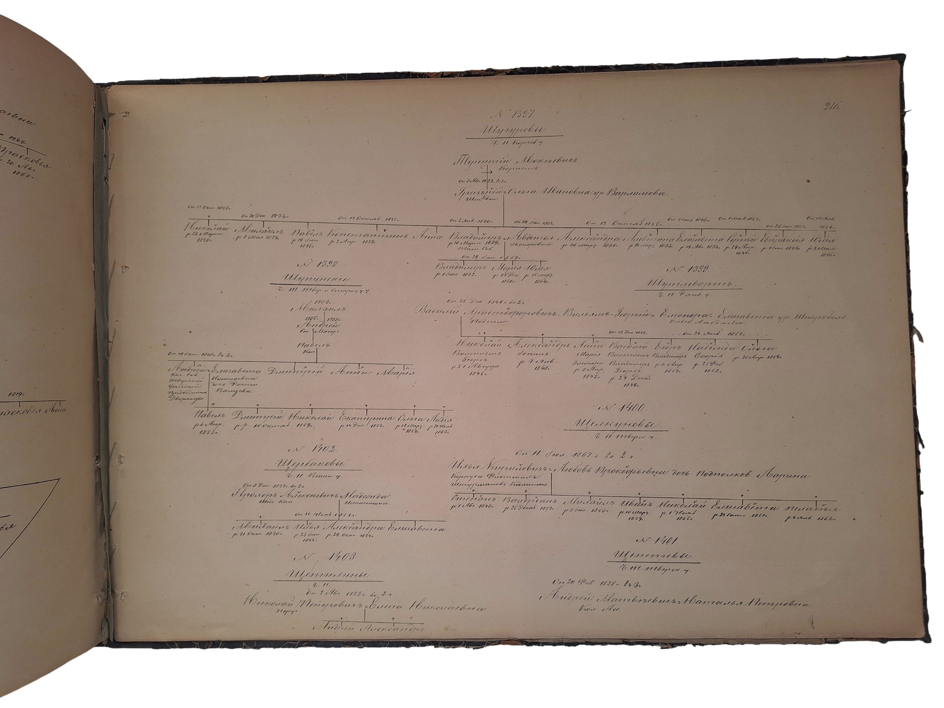 A monumental genealogical work by Mikhail Petrovich Cherniavsky, one of the first systematic compilations of noble genealogies of the Tver Province. Based on official data from the Genealogical Book of the Tver Nobility (1787 – 1869), the volume presents 1,429 family genealogical tables. The appended section (often missing in surviving copies) contains supplementary materials and the alphabetical index of noble surnames.