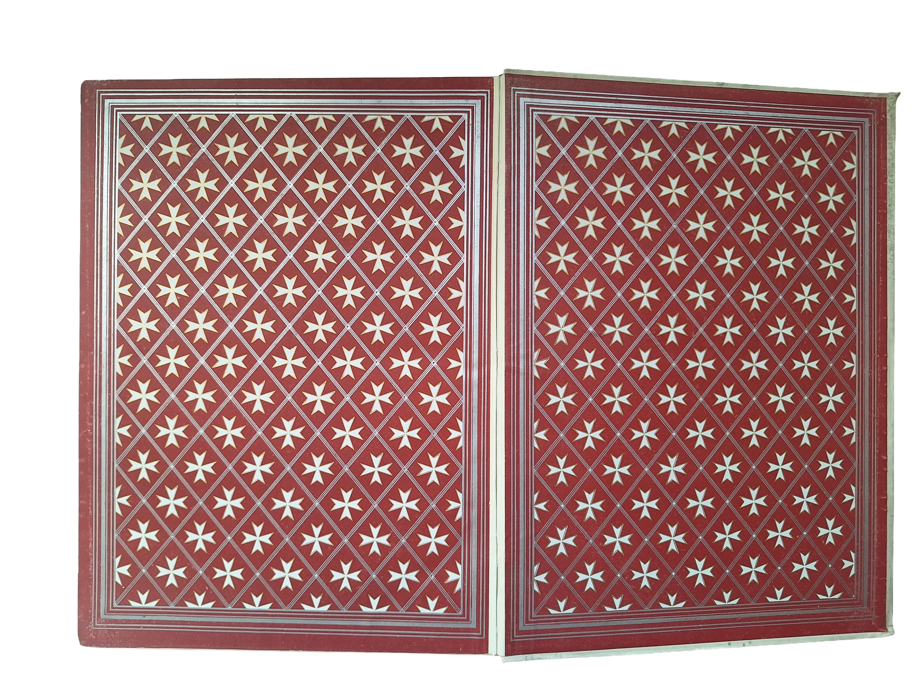 Bound in contemporary white cloth (calico/“kalenkor”), executed by the binding workshop of A. Shnel. Composite endpapers with Maltese cross motif; red-toned edges; publisher’s printed covers preserved in the binding.