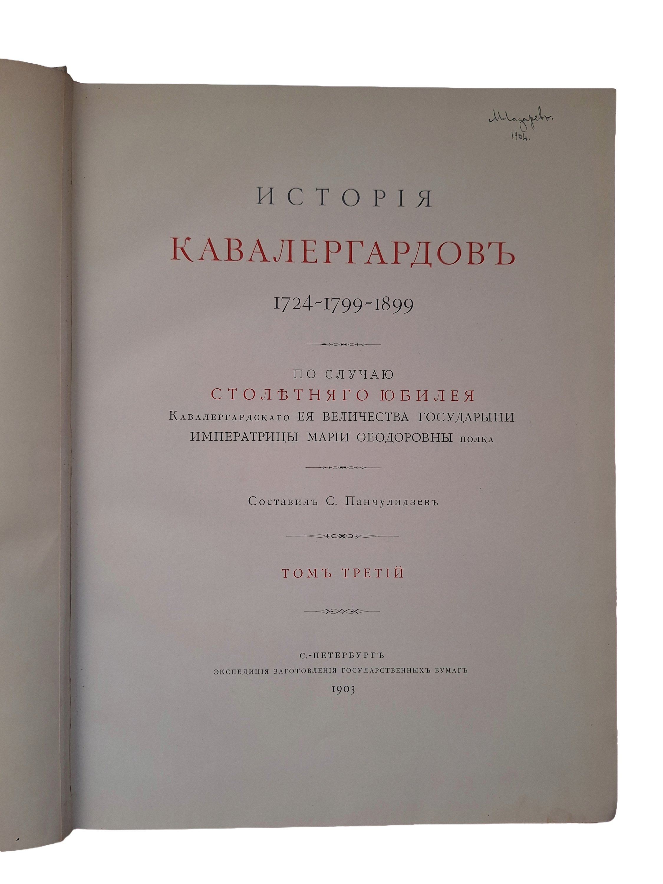 History of the Cavalry Guards. 1724–1799–1899. On the occasion of the centennial of Her Majesty Empress Maria Feodorovna’s Cavalry Guard Regiment / Compiled by S. Panchulidzev. — St. Petersburg: Expedition for the Preparation of State Papers, 1899–1912. —