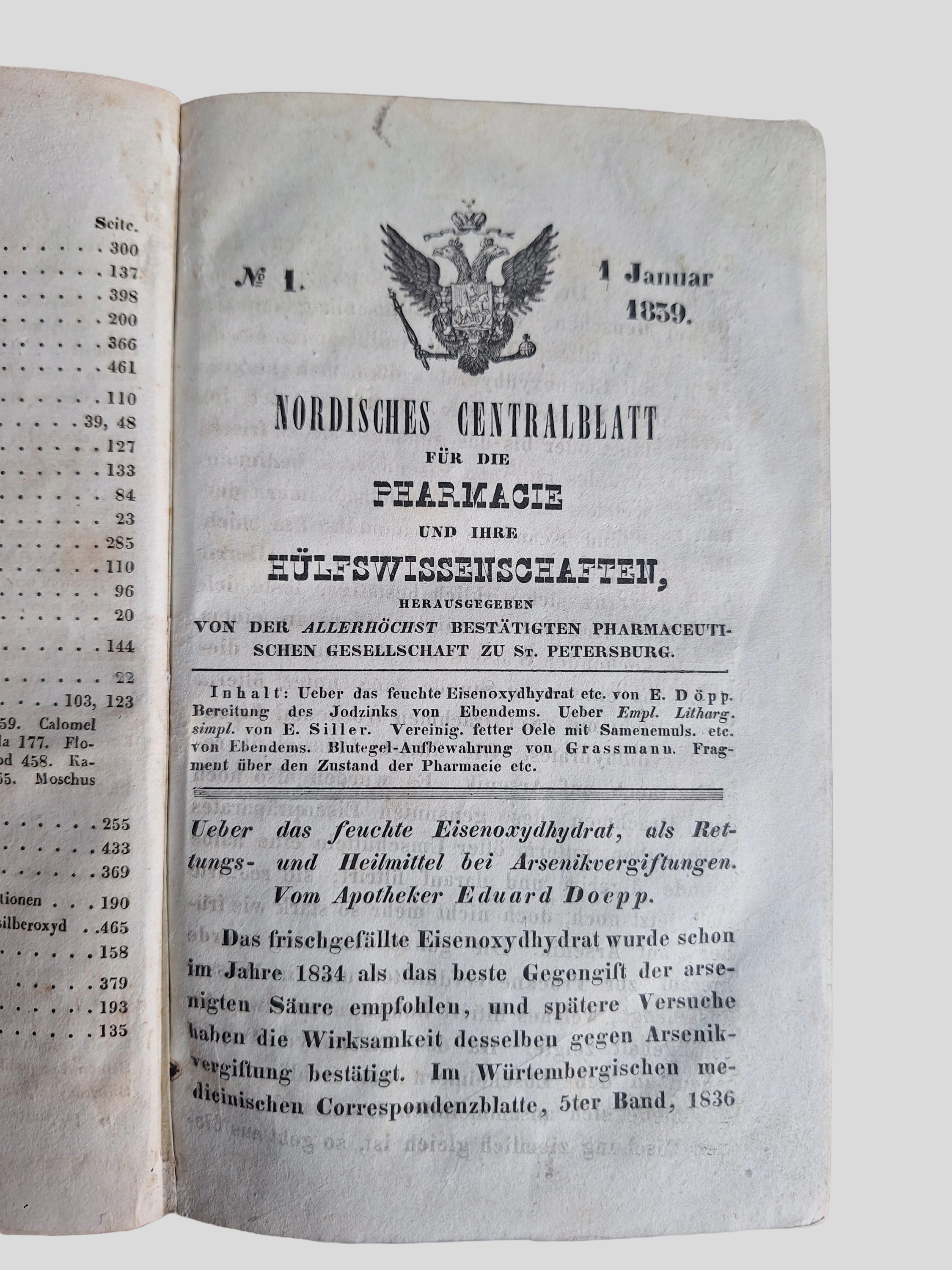 A rare set of the first year of publication of the Nordisches Centralblatt für die Pharmacie und ihre Hilfswissenschaften — the first pharmaceutical journal of the Russian Empire, published in German by the Imperial Pharmaceutical Society of St. Petersburg.