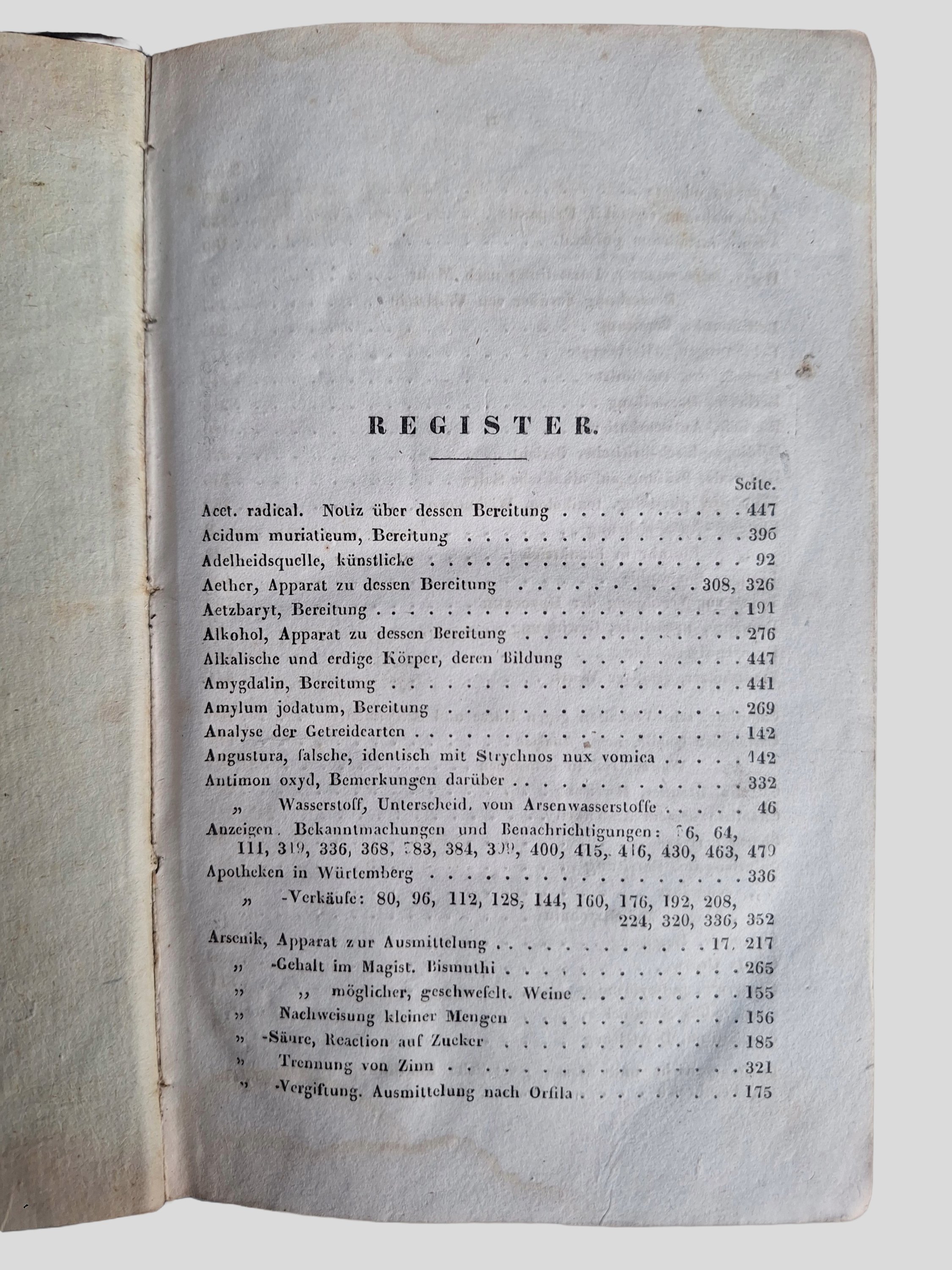 Dated 1859, this early scientific periodical reflects the international character of pharmaceutical research in the Russian Empire. The issue includes articles on sublimate formation (Fr. Mohr), the introduction of the metric system in France, and reports on chemical adulteration of mercury compounds, among other topics.