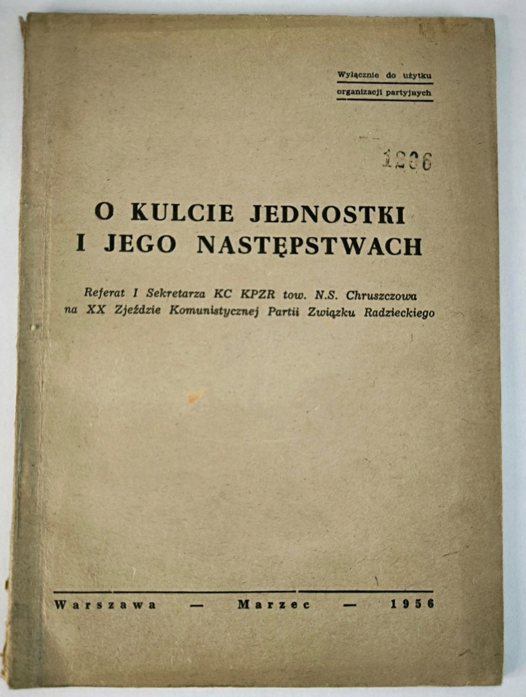 On February 14, 1956, the 20th Congress of the Communist Party of the Soviet Union convened in Moscow—the first major party gathering since Joseph Stalin's death in 1953. For days, Stalin's name was barely mentioned. But on February 25, in a closed session attended by 1,500 delegates and specially authorized guests, First Secretary Nikita Khrushchev delivered a shocking address titled On the Cult of Personality and Its Consequences. In it, he launched a forceful condemnation of Stalin's legacy, aiming to dismantle the myth of Stalin as a heroic leader. Foreign journalists and non-party guests were barred, and the Polish translation—offered here in its scarce first printing—was the only version distributed during the Cold War. Notably, this edition retains interjections omitted in subsequent printings. The official Russian text was not published until 1989.