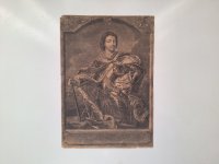 3/4 length, body inclined l, face to r, in armour, lace rurffles, velvet and ermine mantle powdered with eagles, badgte of St Andrew, baton in extended r.hand, l. on hip. B/ground: battle. within border. Latin inscrip. Very rare.