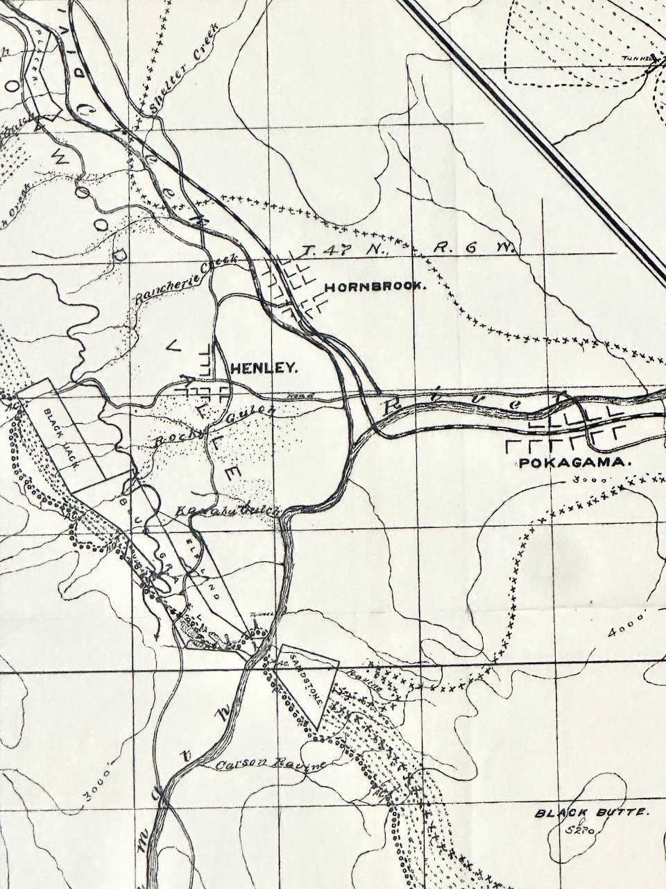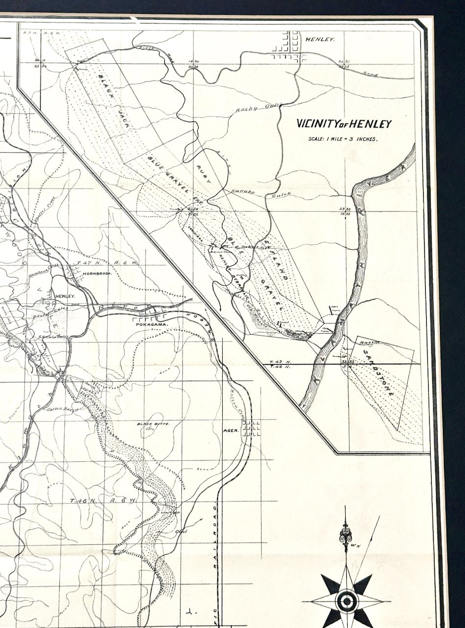 Gold conglomerates in California are primarily found in ancient riverbeds along the western slope of the Sierra Nevada, The gold deposits here are in the vicinity of Henley, Northern CA, showing deposits of granite, sandstone, lava, gold conglomerates, roads and railroads. The accompanying report is not present. Link: https://www.undergroundexplorers.com/documents/Report_of_the_state_mineralogist_1894.pdf