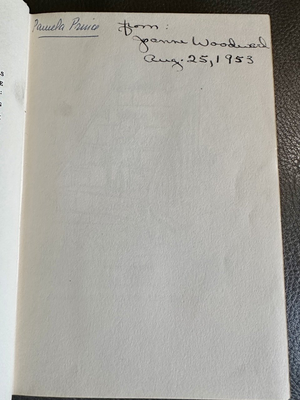 The two Pooh volumes are inscribed by Paul and Jackie Newman with the same black fountain pen, not dated but apparently while the two were still married in the early 1950s. When We Were Very Young is inscribed by Joanne Woodward, with blue ink, in August 1953. Although ‘Pamela’ is not identified, because of the NY theatrical connections we speculate that it may have been Pamela Prince Walker, later the author of Seven Steps to Children’s Theater Dramatics [Hill and Wang, 1957]