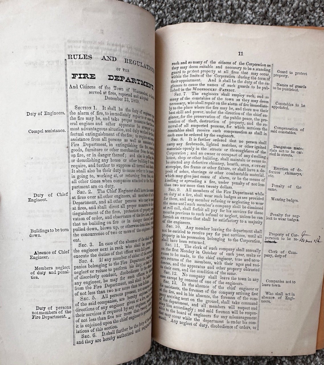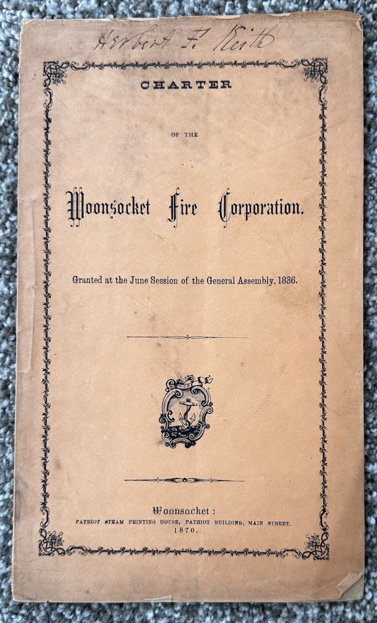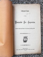 First chartered in 1836, this printing includes the newly adopted Rules and Regulations of the Fire Department adopted Dec 13, 1869 as well as the original Charter, Bylaws, and list of officers for both 1836 and 1869.