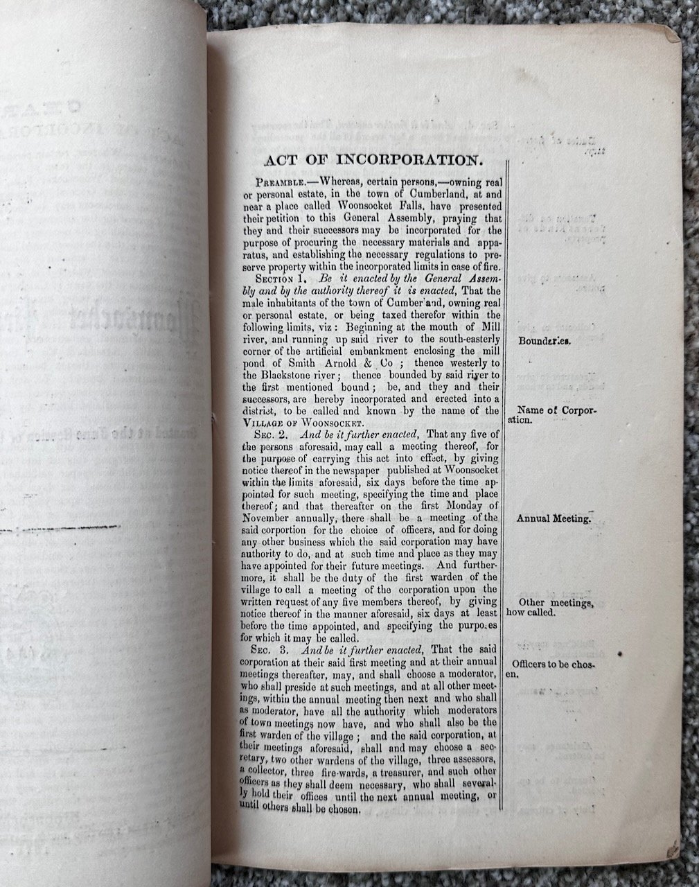 The loosely organized nature of Woonsocket - three villages in Smithfield and three villages in Cumberland -- made it necessary to receive special authority from the state to organize a fire department. Major fires in 1829 and 1835 had emphasized to the mill owners in the area the need to prepare against future fires. In 1836, the Rhode Island General Assembly granted a charter establishing the Fire Corporation of the Woonsocket Falls Village. In 1869 the village of Woonsocket was incorporated as the Woonsocket Fire Corporation.
