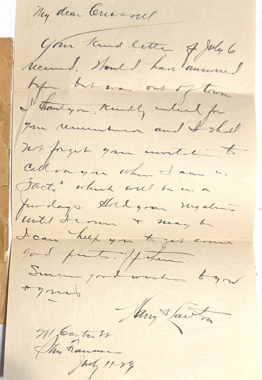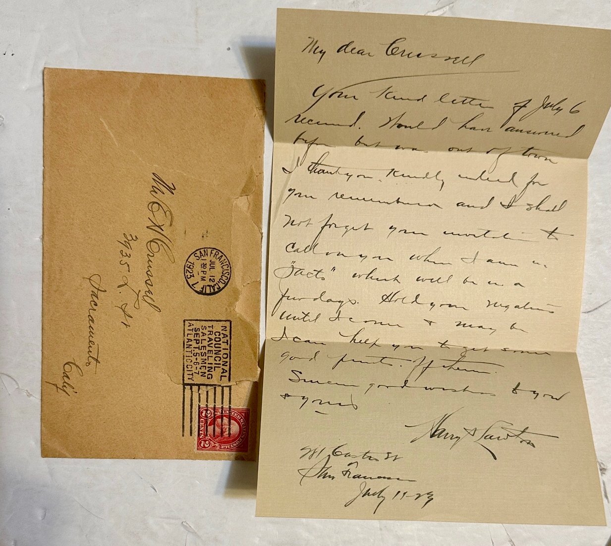 Your kind letter of July 6 received. Would have answered before but was out of town. I thank you kindly indeed for your remembrance and I shall not forget your invitation to call on you when I am in “Sacto” which will be in a few days. Hold your negatives until I come & maybe I can help you to get some good prints off them.