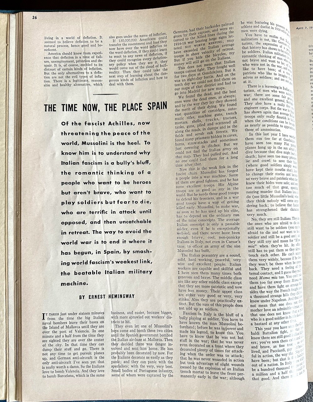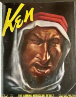 Ken was a short-lived news and feature magazine founded, in part, to convince Americans to support the Republican faction in the Spanish Civil War. It was published bi-weekly between April 1938-August 1939 and utilized full page photo spreads, pointed graphics, and articles, opinion, and commentary by a variety of leftist writers and artists. The magazine is notable for having published fourteen [14] of Ernest Hemingway’s dispatches from the Spanish Civil War, beginning with its first issue of April 7, 1938 [containing his anti-Mussolini article "The Time Now, The Place Spain"). Some issues also contain photographs later credited to Hemingway. All issues feature caricature and editorial cartoons by Sam Berman, David Low, George Grosz, Al Hirschfeld, William Gropper, and others.
