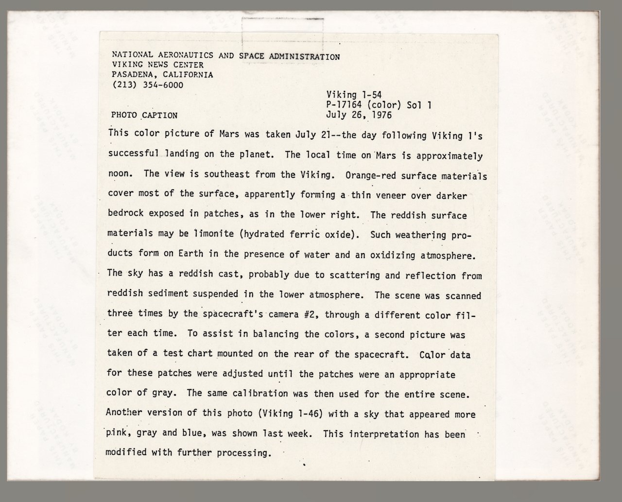 NASA Description: "The local time on Mars is approximately noon. The view is southeast from the Viking. Orange-red surface materials cover most of the surface, apparently forming a thin veneer over darker bedrock exposed in patches, as in the lower right. The reddish surface materials may be limonite (hydrated ferric oxide). Such weathering products form on Earth in the presence of water and an oxidizing atmosphere. The sky has a reddish cast, probably due to scattering and reflection from reddish sediment suspended in the lower atmosphere. The scene was scanned three times by the spacecraft's camera number 2, through a different color filter each time. To assist in balancing the colors, a second picture was taken of z test chart mounted on the rear of the spacecraft. Color data for these patches were adjusted until the patches were an appropriate color of gray. The same calibration was then used for the entire scene."