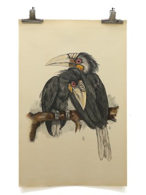 2 hornbills (rhyticeros plicatus) BIG OLD LITHO