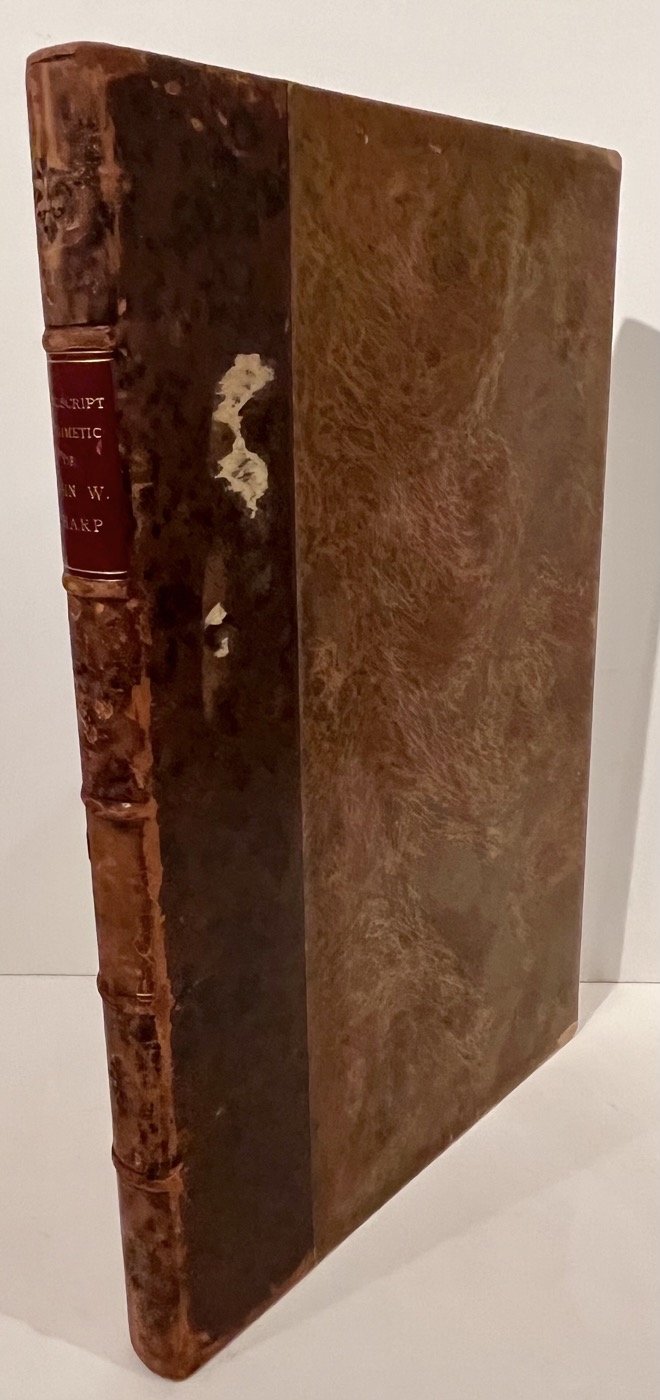 Folio (7 3/4" x 12 1/4"); 8, (12), 1-40, 53-85pp. Manuscript math exercises written in cursive in brown ink on rag paper with several separate title-pages, and elaborate headings; figures and decorations throughout. Collected and sewn together in folding sleeve ('H. Cecil Sharp" bookplate and bookseller label present) in slipcase of 1/4 brown leather and marbled boards; spine with five raised bands and red label titled 'Manuscript Arithmetic of John W. Sharp.' Losses to a few sheets, marginal chipping, soiling' - Good condition.