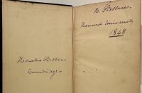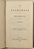Dr. Horatio Stebbins' copy, with his manuscript name to front pastedown (with 'Cambridge') and ffep (with 'Harvard University 1848'). When Stebbins graduated from Phillips Exeter Academy he had a part in the Greek tragedy, and gave the class oration (in 1883, he was recalled to Exeter to give the oration at the centennial celebration of its founding). He graduated from Harvard in 1848 as chaplain and then from the Harvard Divinity School. He was minister of several New England churches before being called in 1864 to succeed Thomas Starr King as minister of the First Unitarian Church in San Francisco. For the next 34 years he devoted his efforts to expanding the influence of his church on the Pacific Coast; he also immersed himself in civic affairs, serving for 26 years as Regent of the University of California, trustee of the Inebriate Asylum and of the Lick School of Mechanical Arts as well as Leland Stanford University.