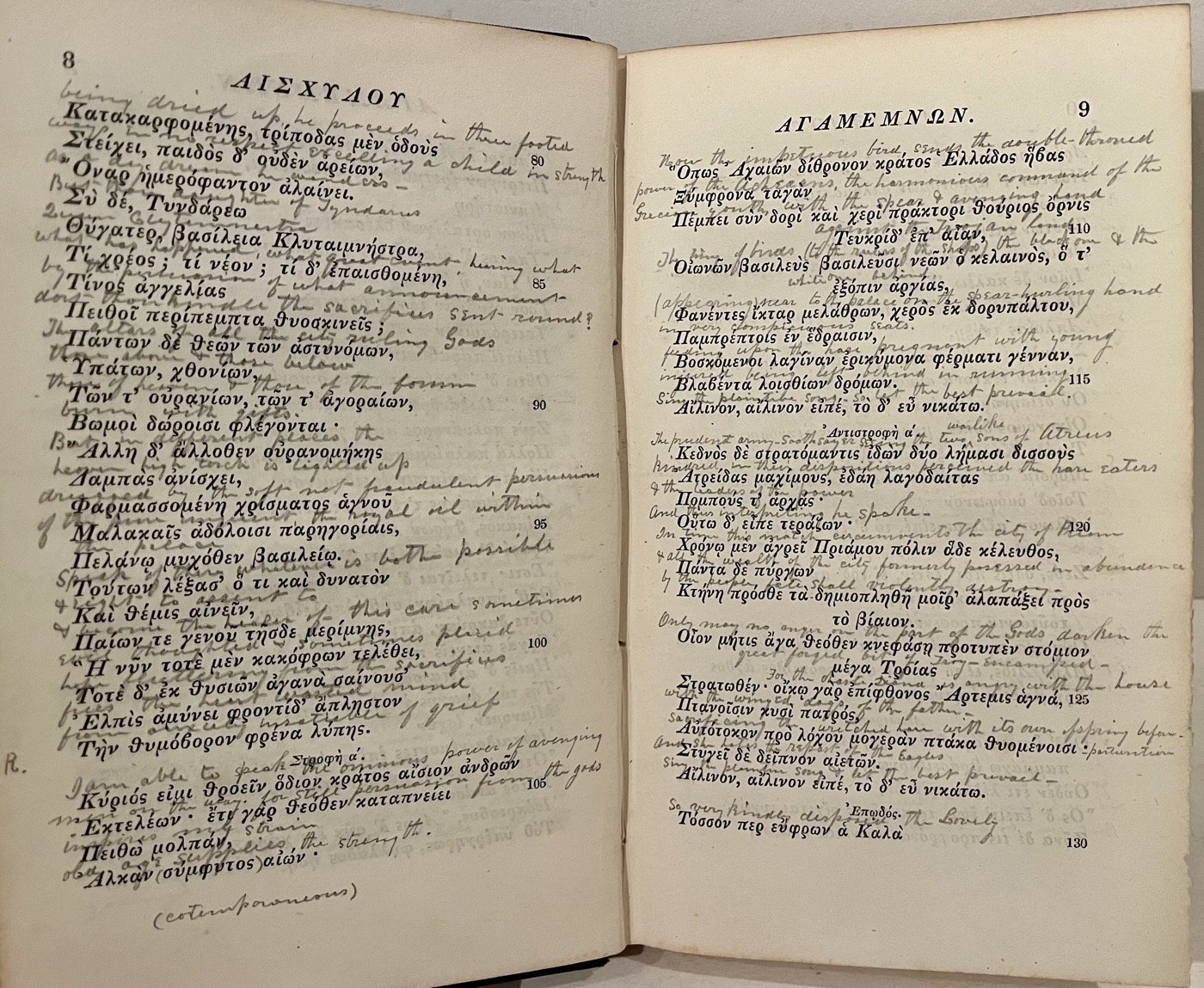 Octavo; xiv, 199 pp (including 11-page metrical table at rear). Text in Greek and English. A Near Fine copy (the first few pages are translated with occasional other marginal notes in pencil) in publisher's black cloth ruled in blind; spine titled in gold.