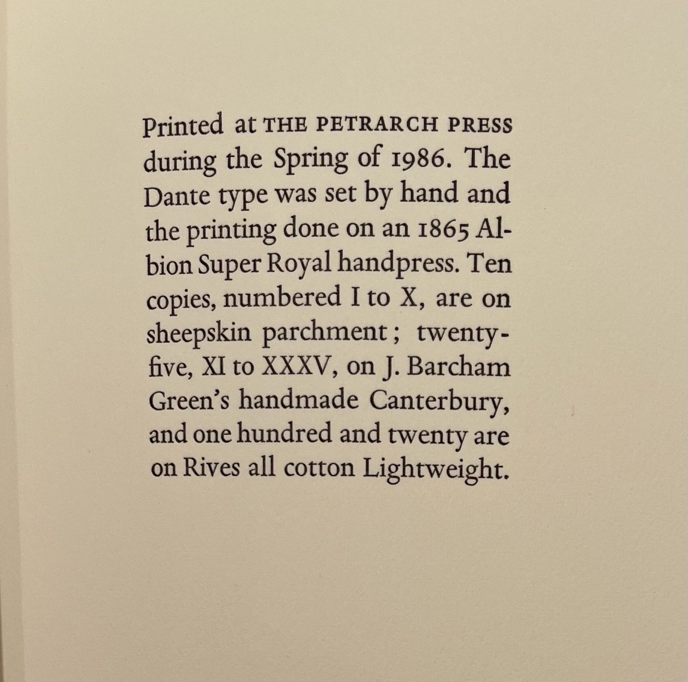 8vo. (xi), 74pp. A Fine copy, one of 120 copies on Rives all cotton Lightweight paper (of a total edition of 155); bound in boards covered in terracotta handmade Roma paper; printed spine label. The Dante type was set by hand; the printing, in black and red, was done on an 1865 Albion Super Royal handpress.