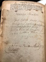 Title page soiled, stained with edges heavily chipped, somewhat fragile at the hinge with loss at the top but holding. Dedication page soiled and chipped, with autograph inscriptions on top corner margin in a small hand by Francis Newton, dated 1709, then Robert Shepherd, Stockport, 1779. Leaves 5&6 are separating from the hinge but holding firm below at several stiches. The rest of the text pages soiled particularly at the margins. There is a closed 1.25" horizontal split at the leading margin on (p. 7) of the Tables in the rear. The last leaf has 1.5" even loss across the top. With all of this, the binding is of course tight, and the whole pretty well preserved.