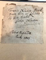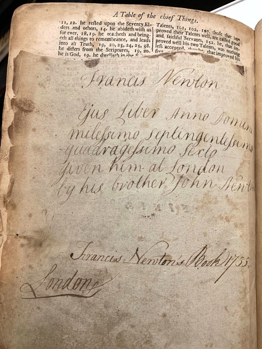 [22], 392, [21]; rebound with leather spine, red label lettered in gilt; most of original calf laid down on later leather covered boards; new pastedowns and endpapers; a fragment of original leaf (endpaper? ) laid down on front pastedown with ownership description: "Francis Newton Book, given Him at London by His Brother, John Newton," below which is written "Robert Shepherd, Book 1803". The last leaf also has further ownership inscriptions on both sides, dated 1755, some in Latin. Top edge of the text block seems to have been shaved in rebinding, as all of the copies located are listed as quarto, this copy 8" x 6".