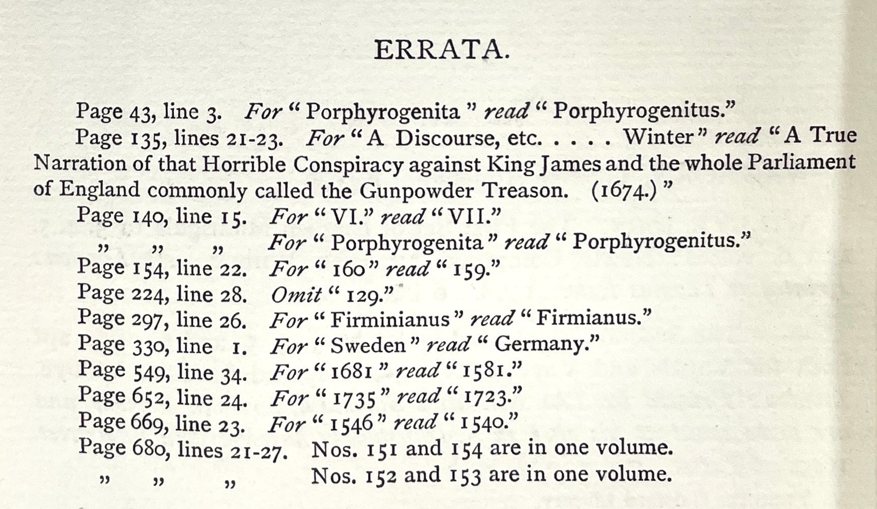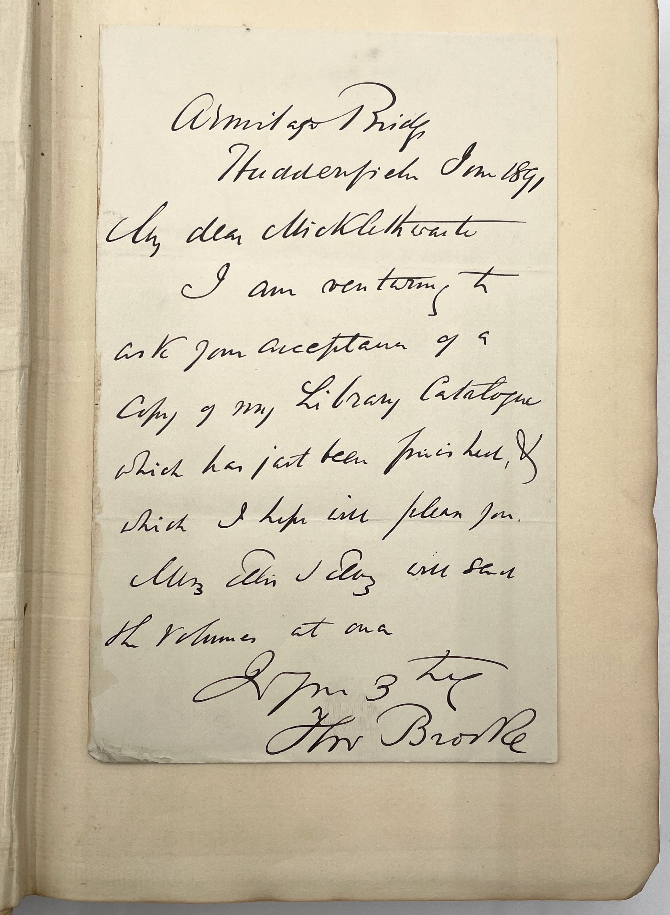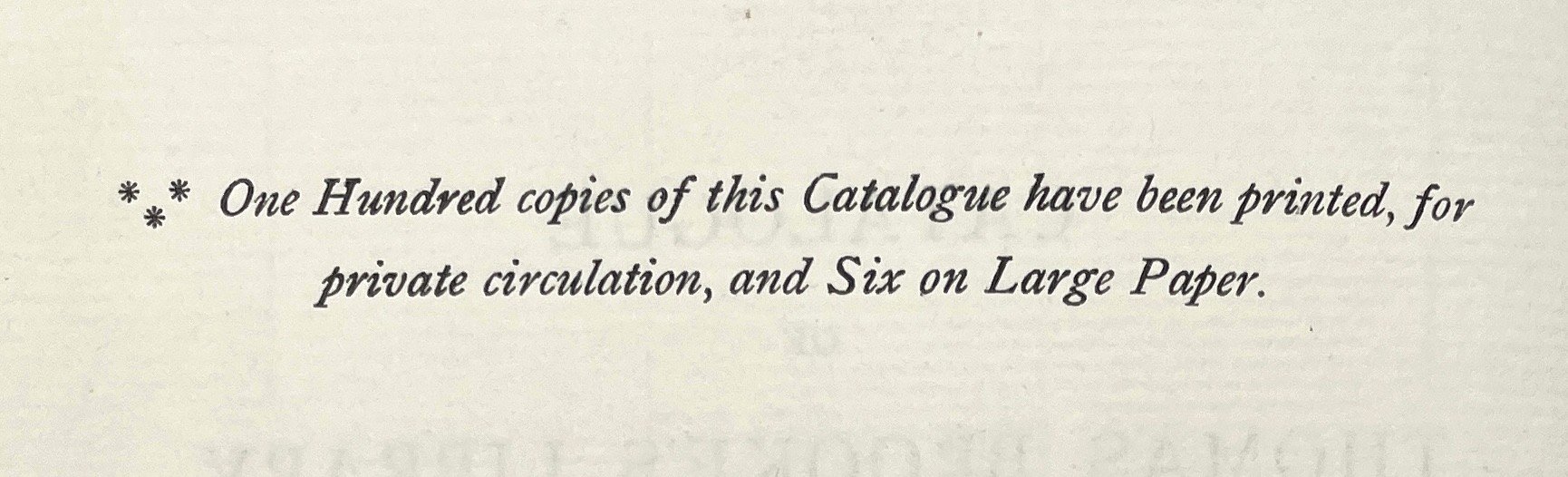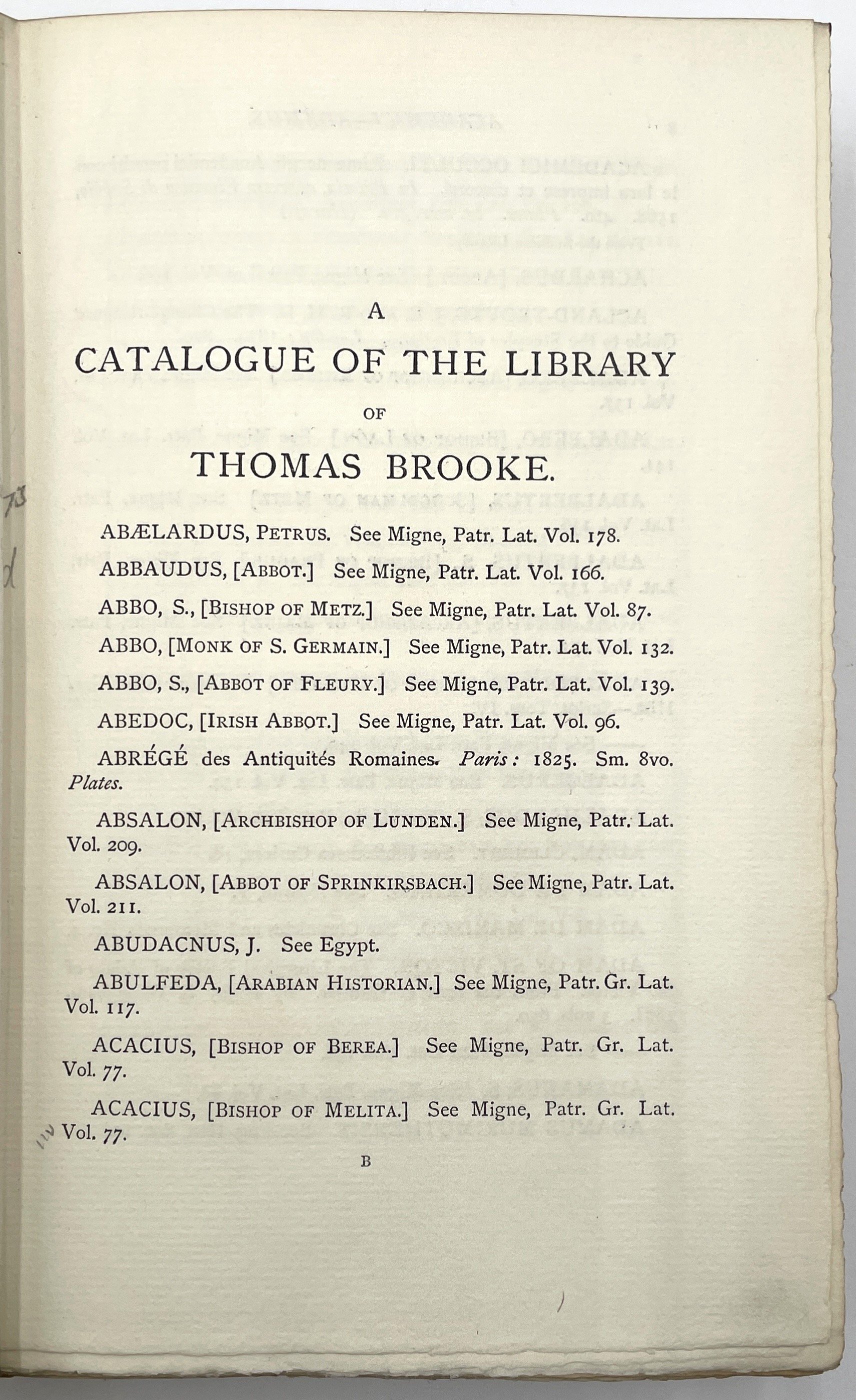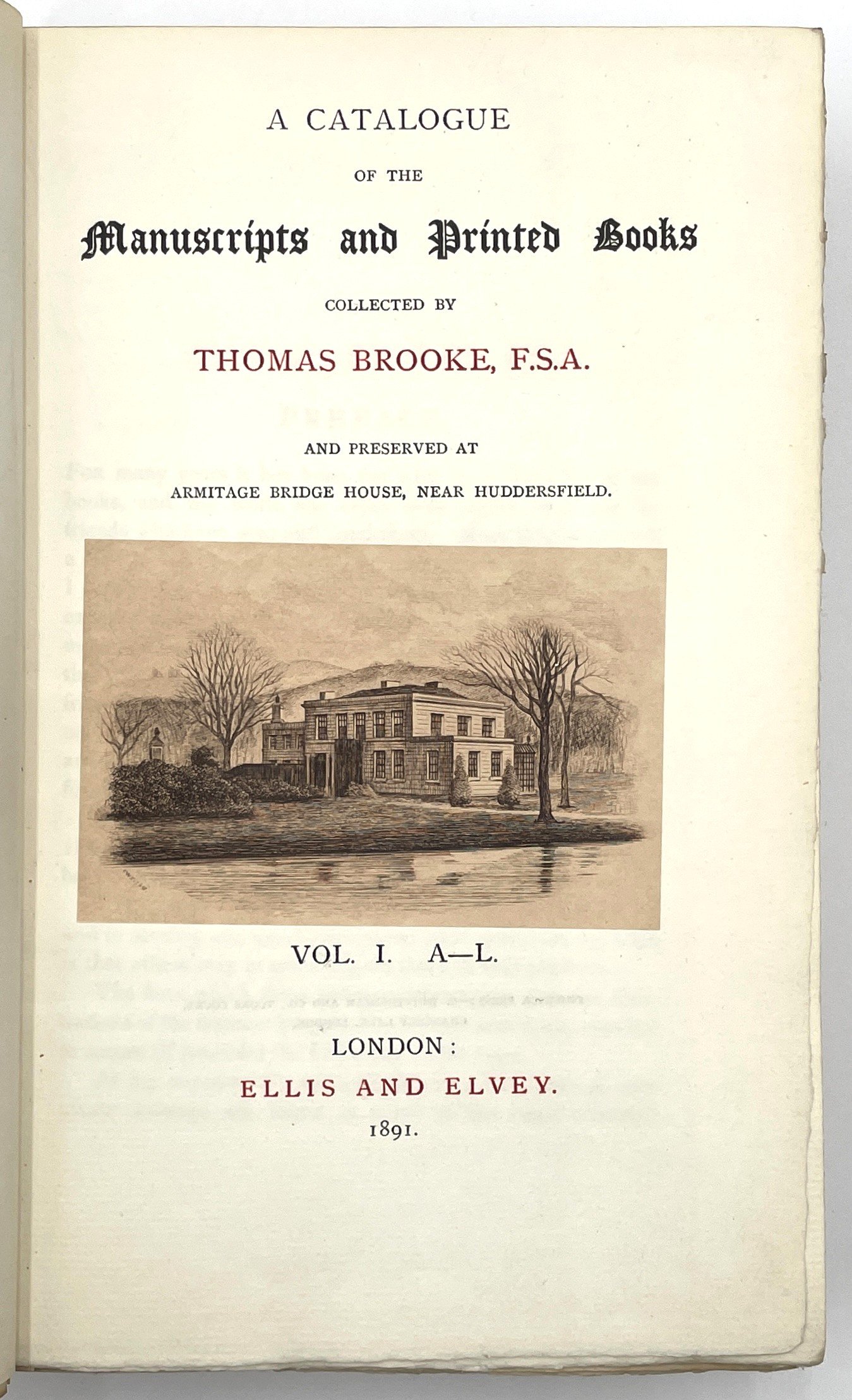 Thomas Brooke. A Catalogue of the Manuscripts and Printed Books Collected by Thomas Brooke, F.S.A. and Preserved at Armitage House, Near Huddersfield. Volumes I & II. London: Ellis and Elvey, 1891. Limited edition, one of 100 copies.