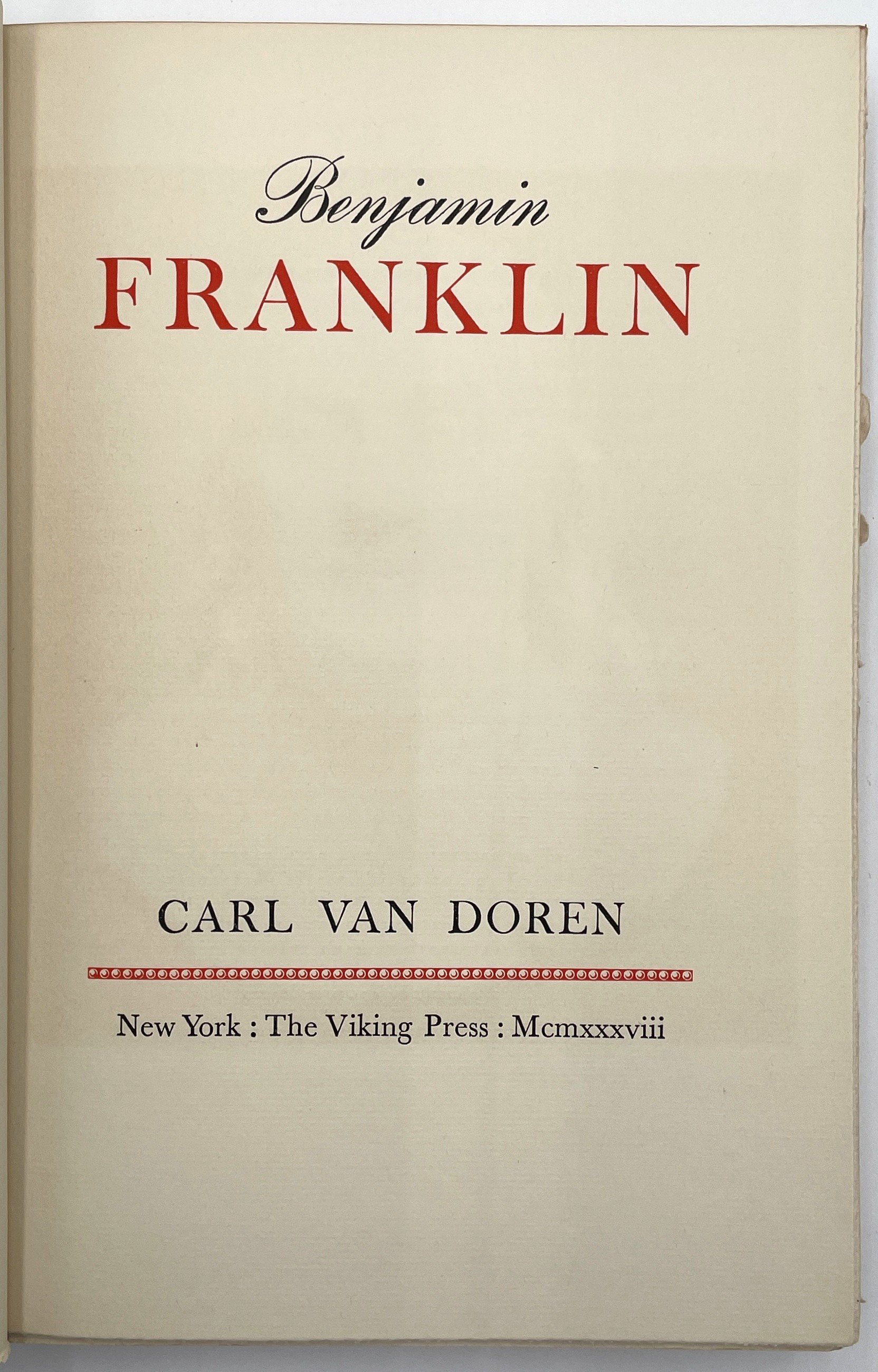 Carl Van Doren. Benjamin Franklin, Volumes 1-3. New York: The Viking Press, 1938. Limited first edition, No. 117 of 625 numbered sets.