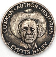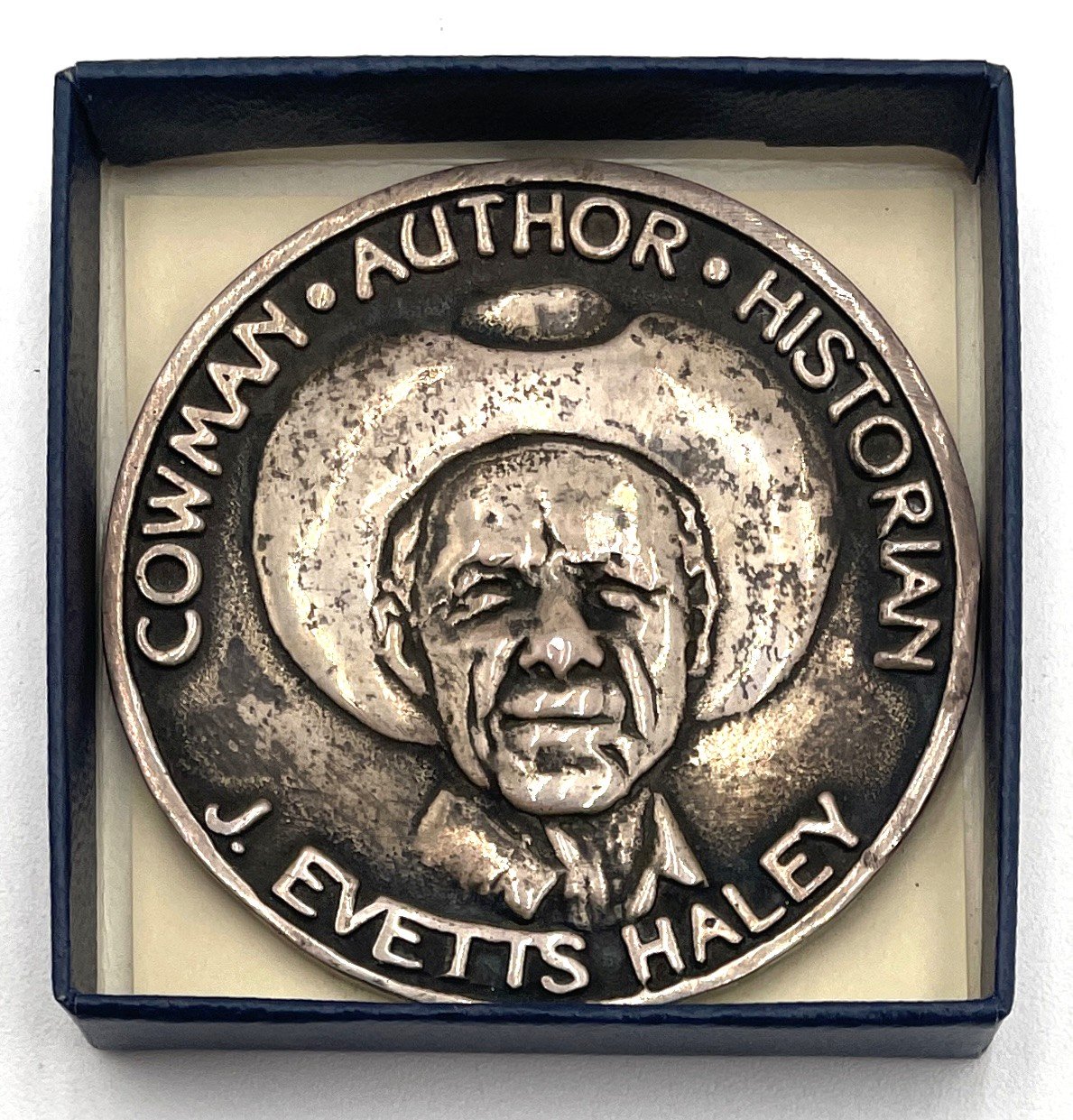 Metal medallion commemorating Texas Cowman, Author, and Historian J. Evetts Haley. Measuring approx. two inches in diameter. Housed in original blue card box.