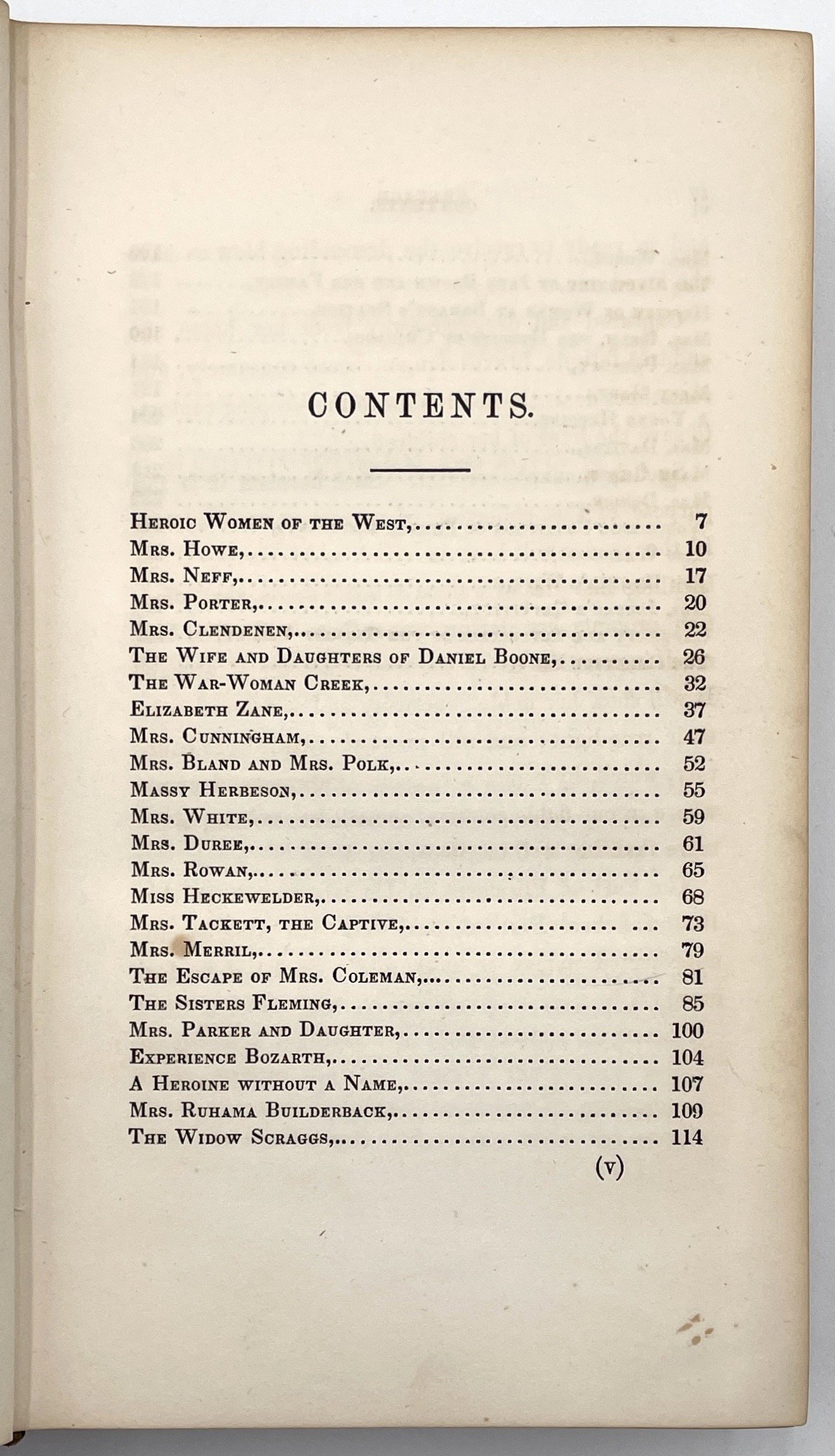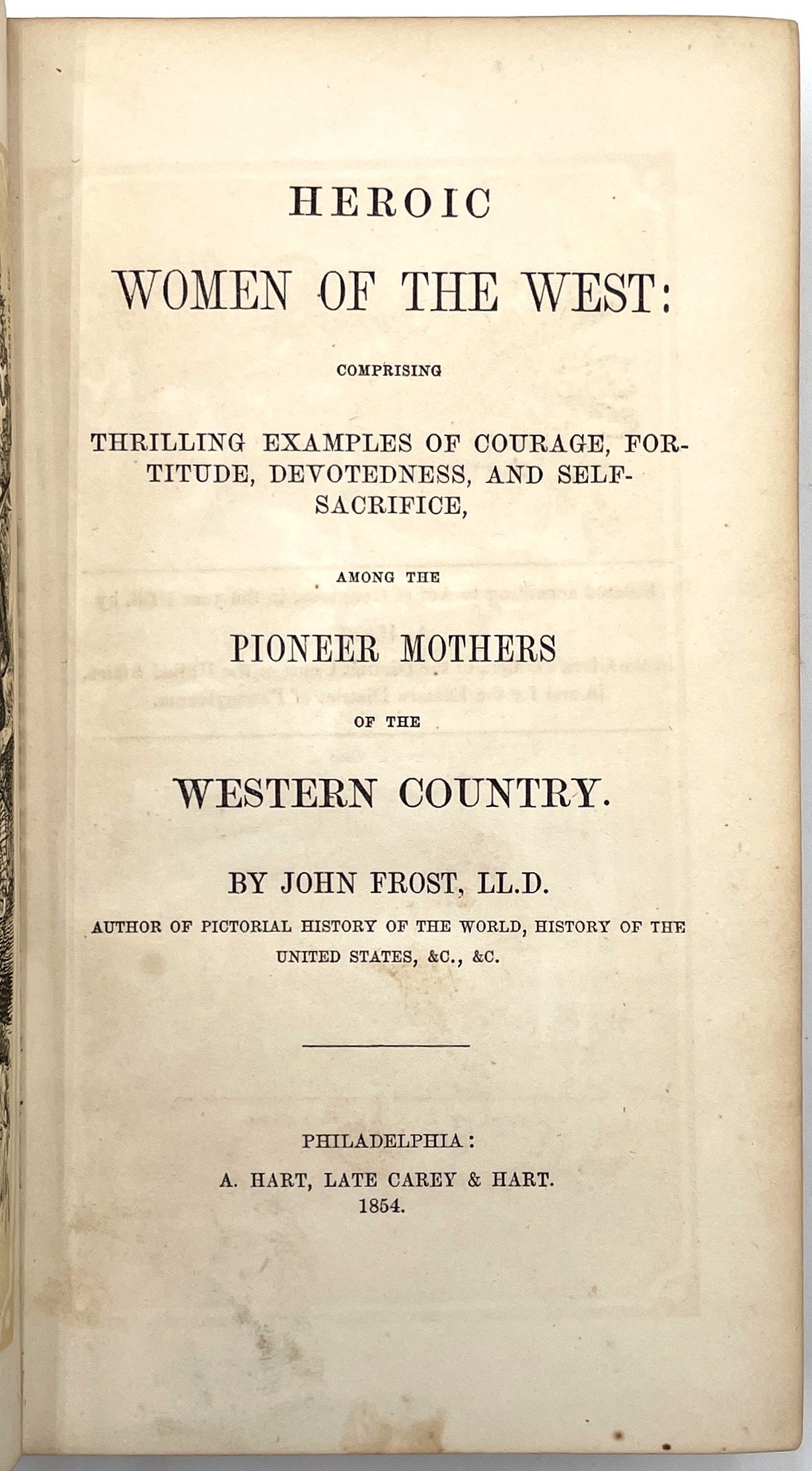 John Frost. Heroic Women of the West: Comprising Thrilling Examples of Courage, Fortitude, Devotedness, and Self-Sacrifice, Among the Pioneer Mothers of the Western Country. Philadelphia: A. Hart, Late Carey & Hart, 1854. First edition.
